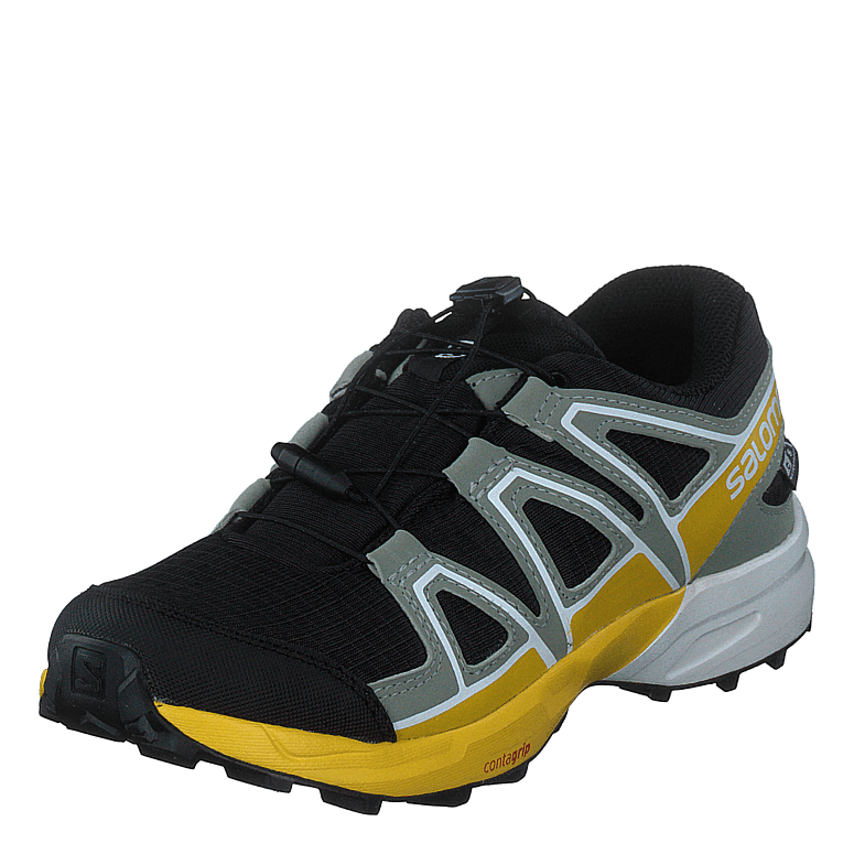 Experience all-terrain adventure with the Salomon Speedcross CSWP J. This waterproof youth shoe features a durable mesh upper, quick-lace system, and enhanced grip for fast-paced outdoor activities. Its black and gray design with a striking yellow sole combines style and performance, perfect for young explorers ready to tackle any challenge.