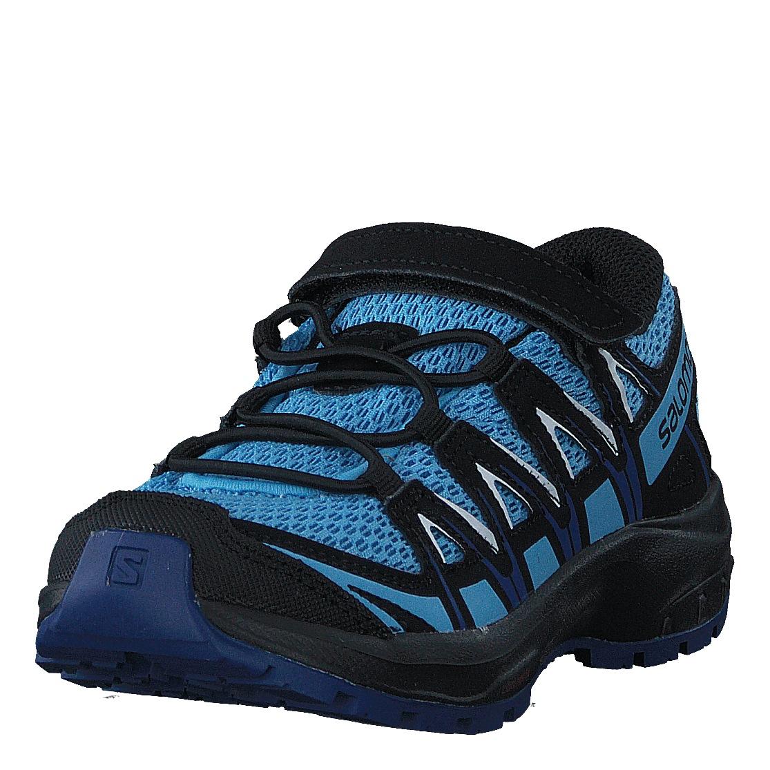 Salomon's XA Pro 3D Kids shoe offers exceptional comfort and protection for young outdoor enthusiasts. This low-cut hiking boot features a lightweight construction with a breathable light blue mesh upper, black synthetic overlays, and a protective toe cap. The quick-lace system with velcro strap ensures a secure fit, while the waterproof membrane keeps feet dry. Durable foam midsole and treaded rubber outsole provide comfort and traction for various terrains.