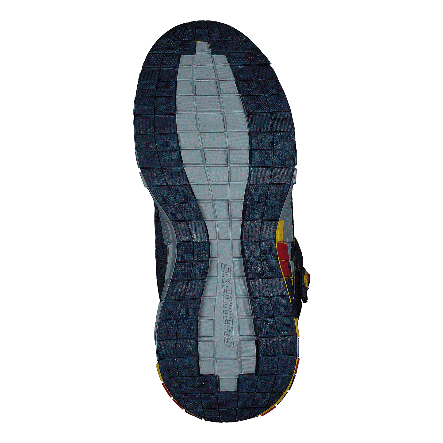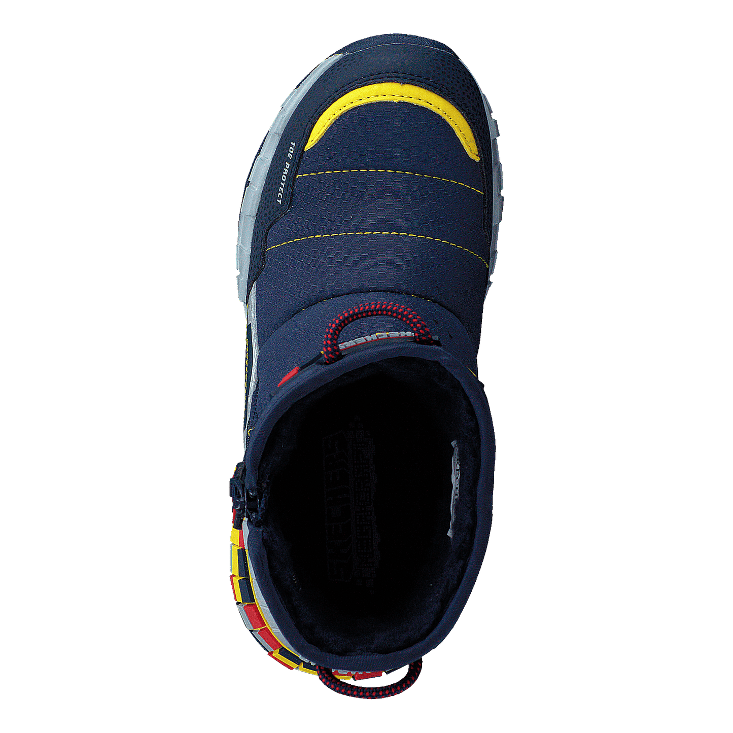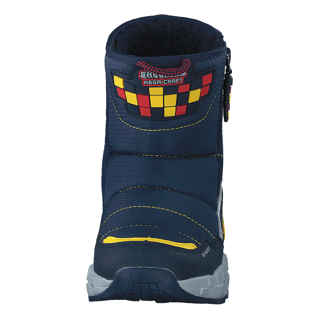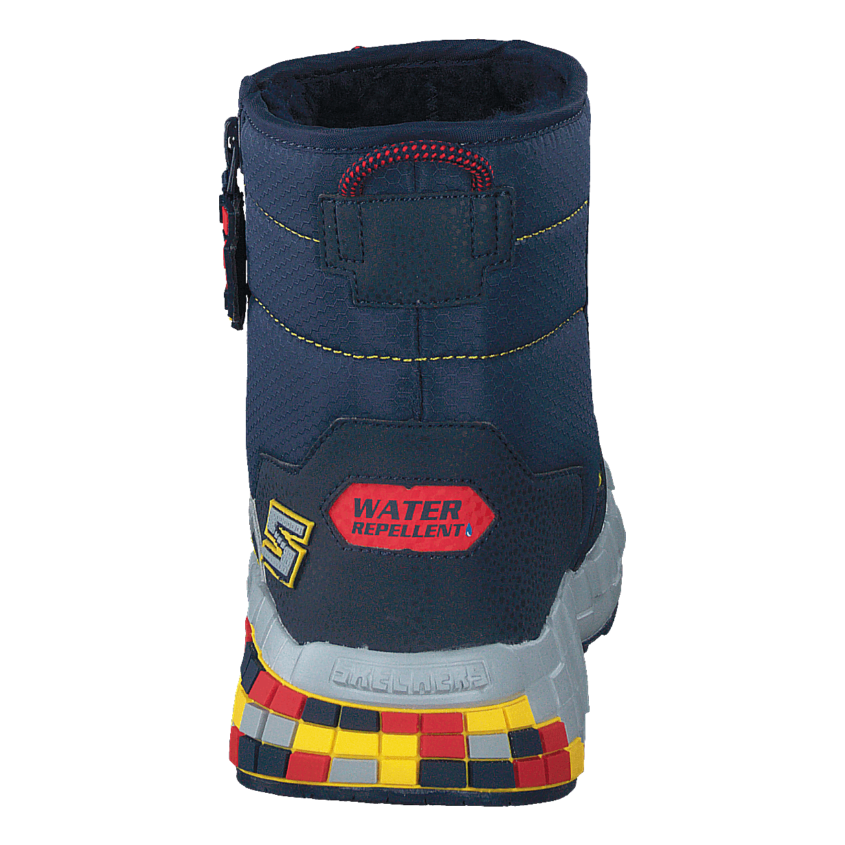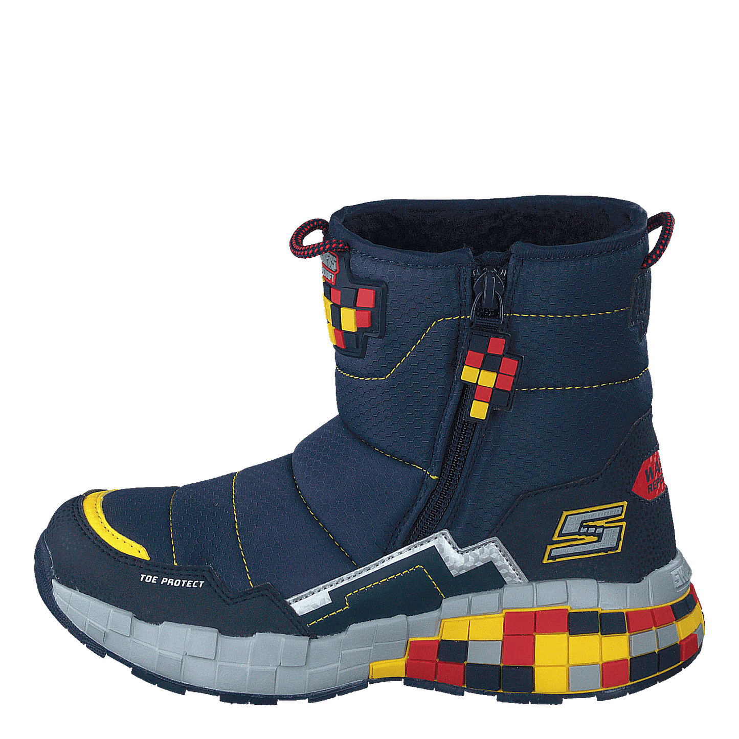 Stay warm and stylish with these Skechers boys' winter boots. Featuring a water-repellent navy upper with red and yellow accents, these boots showcase a playful video game-inspired design. The chunky, pixelated sole and side zipper with colorful pull tab add fun details, while the padded collar and back loop ensure easy wear. Perfect for young gamers braving the cold.
