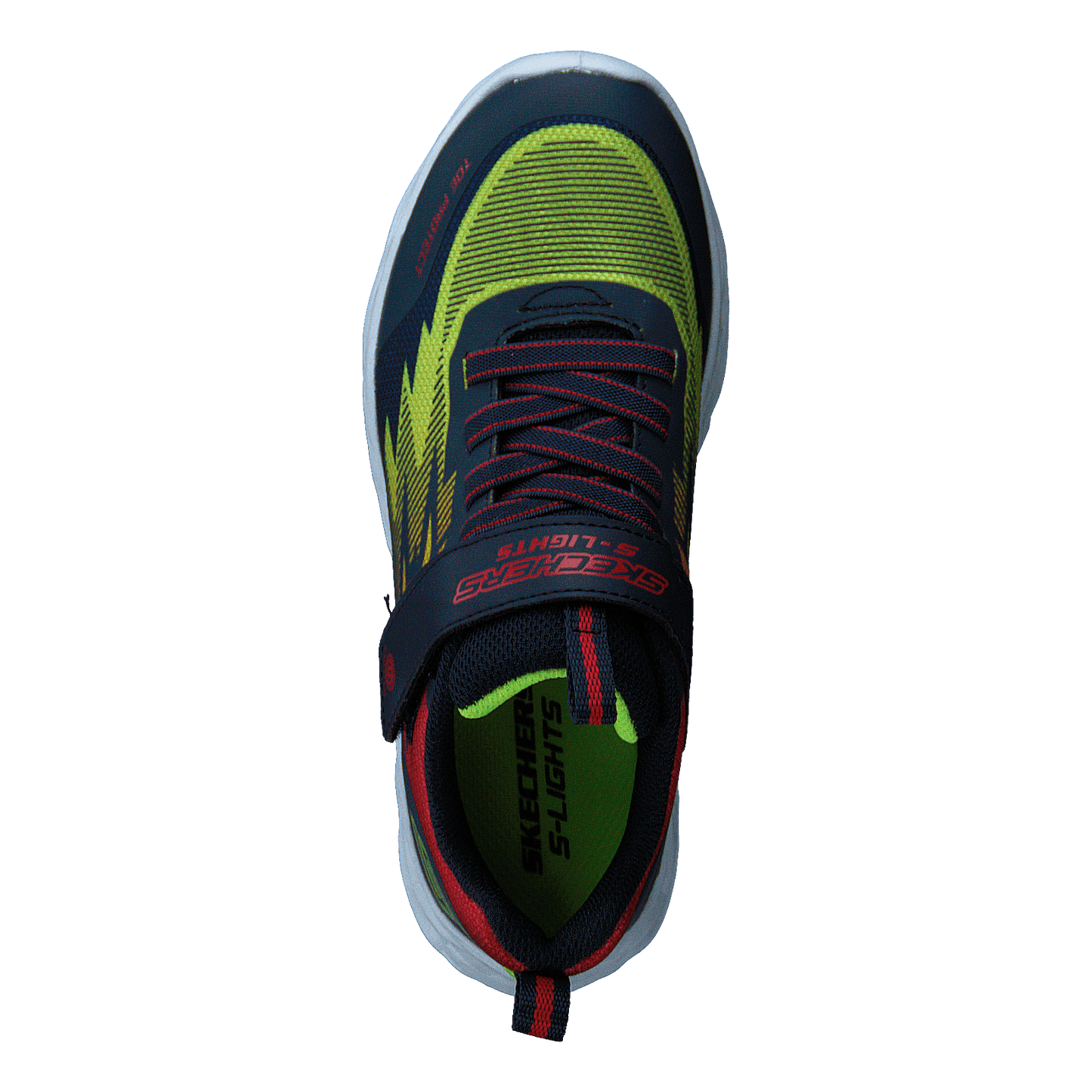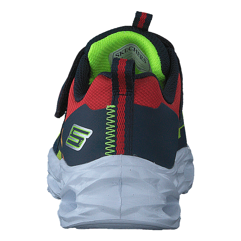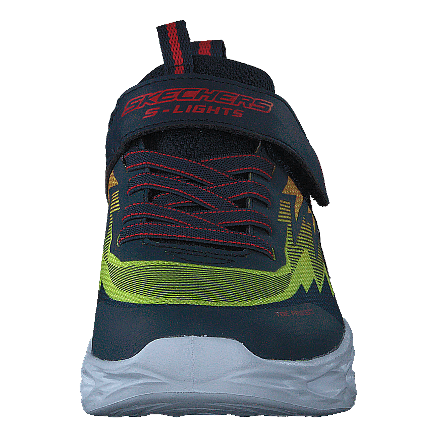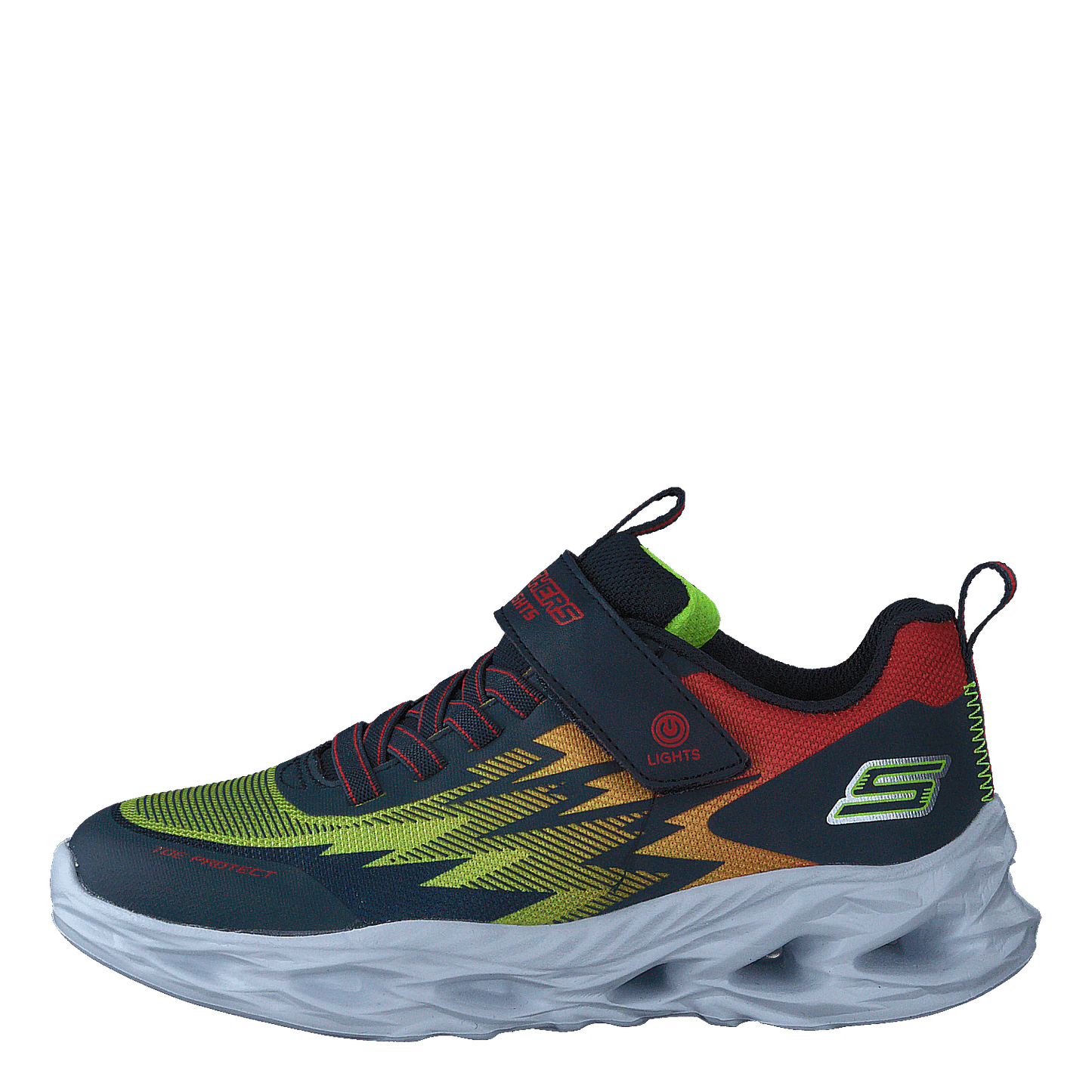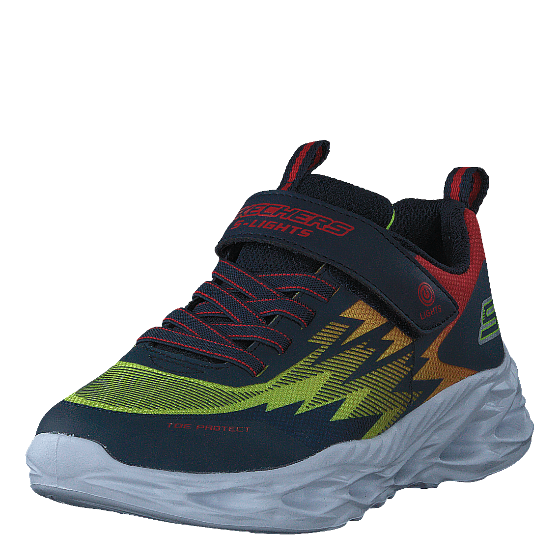 Skechers Boys Vortex-flash Nvmt combines style and functionality in a navy blue athletic shoe with vibrant multicolor accents. Featuring a velcro strap, elastic laces, and a chunky white sole, this sporty shoe offers easy wear and secure fit. The mesh and rubber construction ensures durability, while the light-up feature adds a fun element for active children.