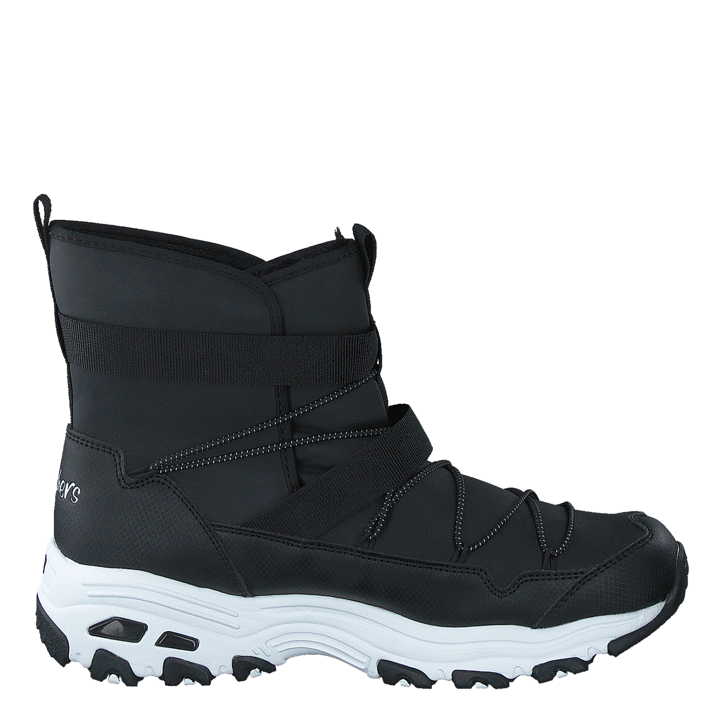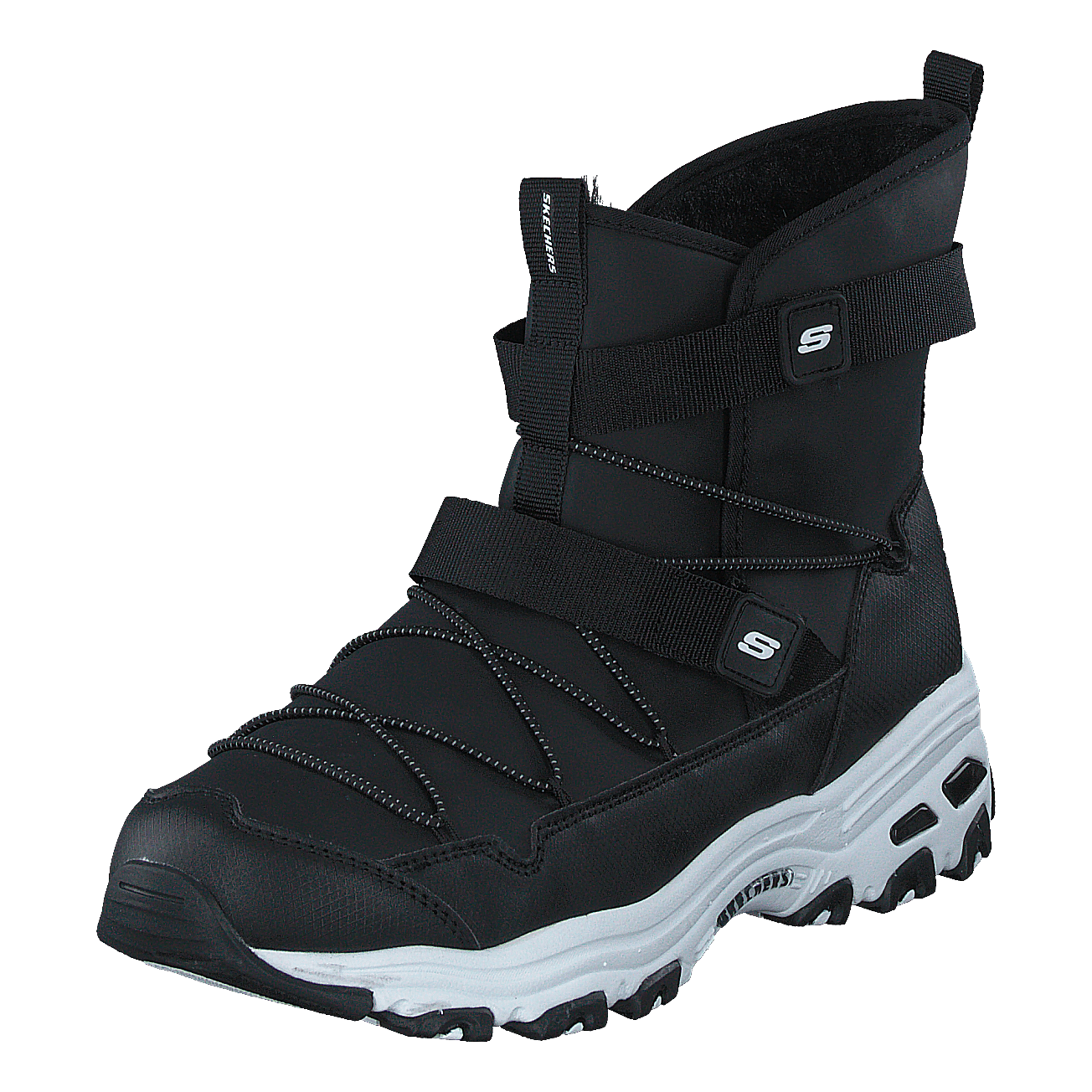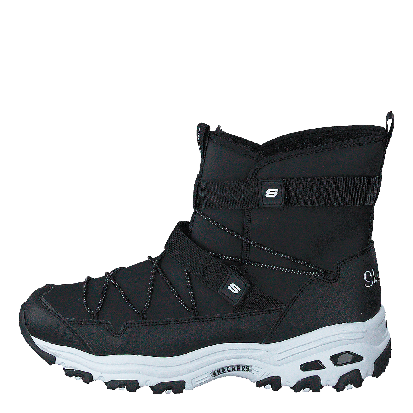 Skechers presents the Girls D'lites Snow Stomp, a stylish and functional winter boot for young adventurers. This black, high-top design features a slip-on style with adjustable straps for a secure fit. The water-resistant upper and thick, white sole with robust treads provide excellent protection and traction in snowy conditions, while the padded construction ensures warmth and comfort.