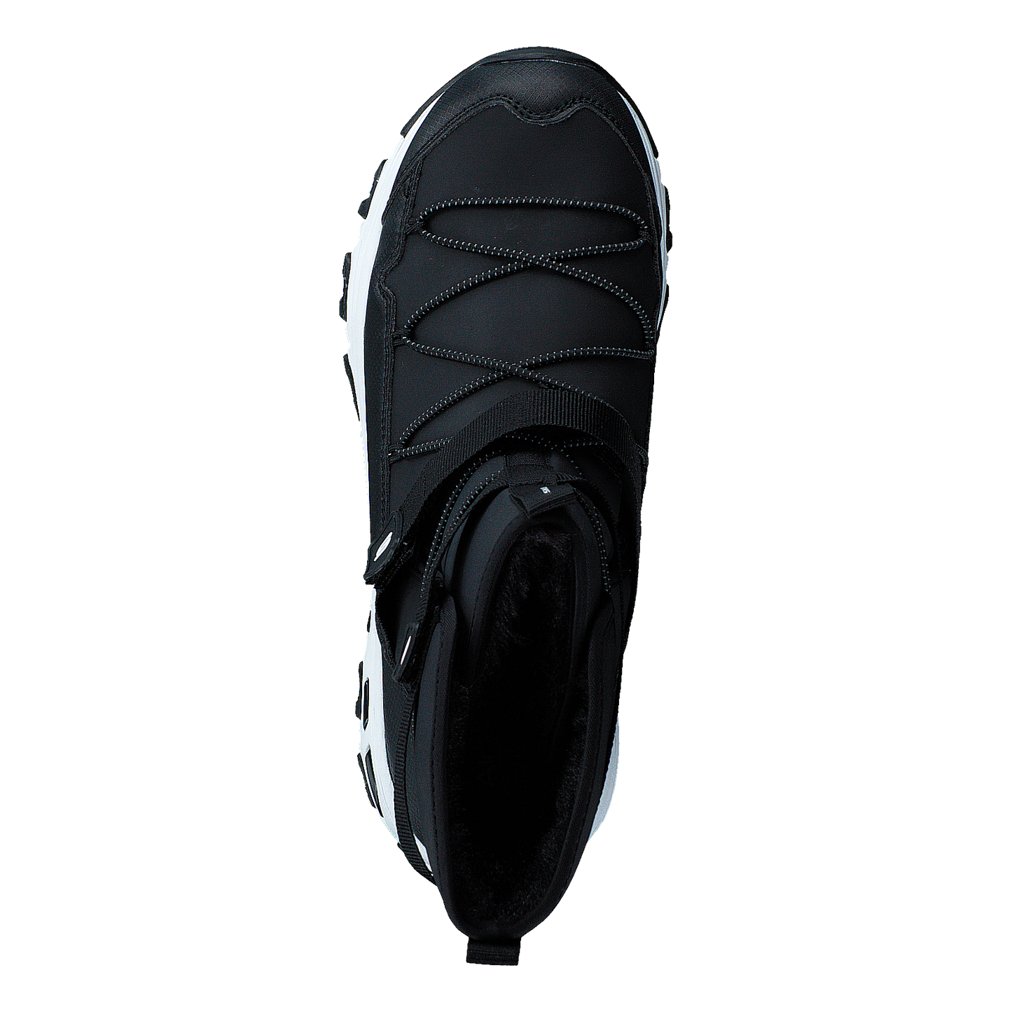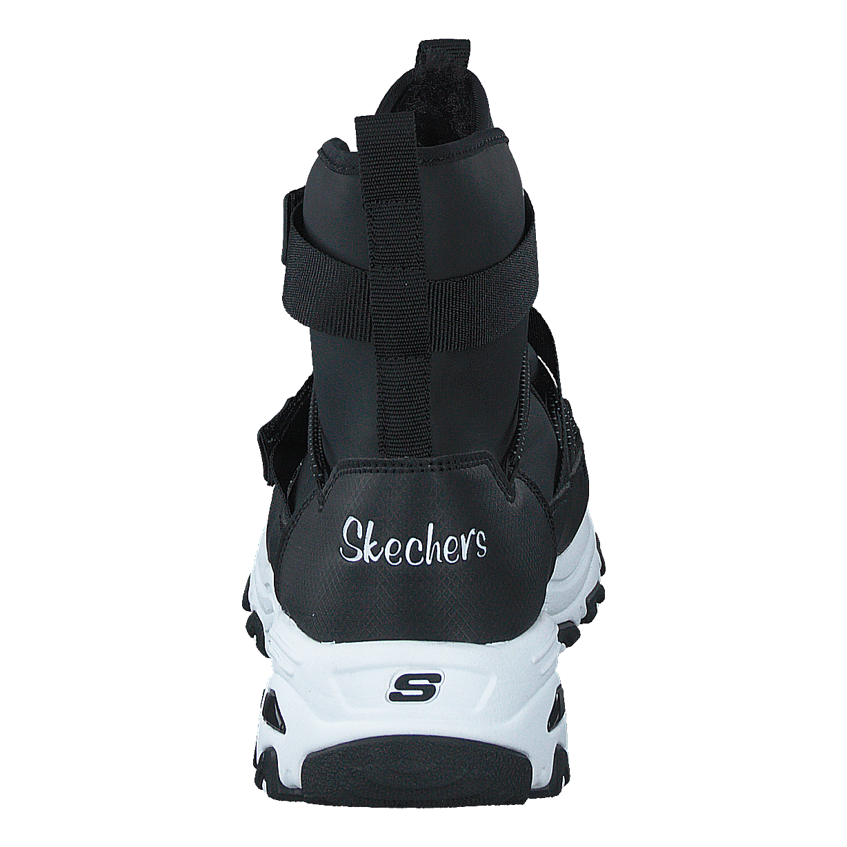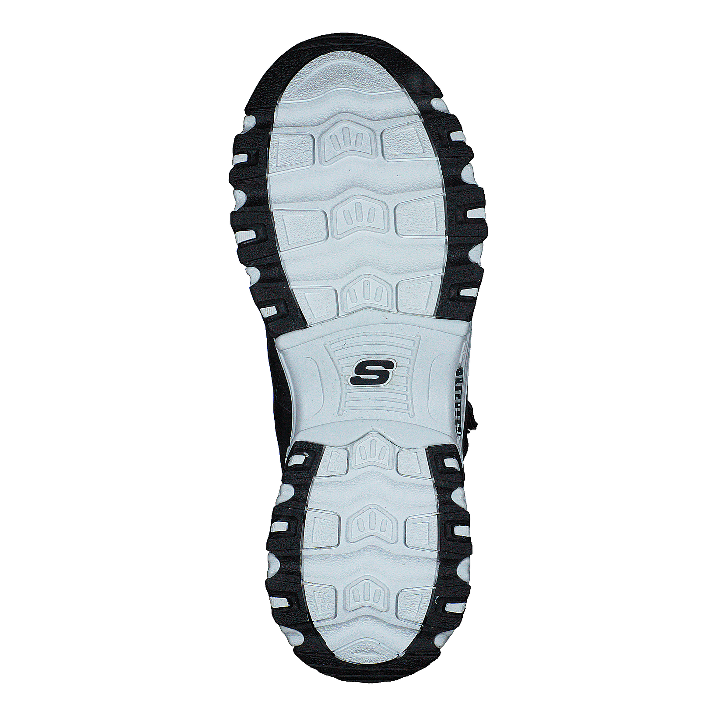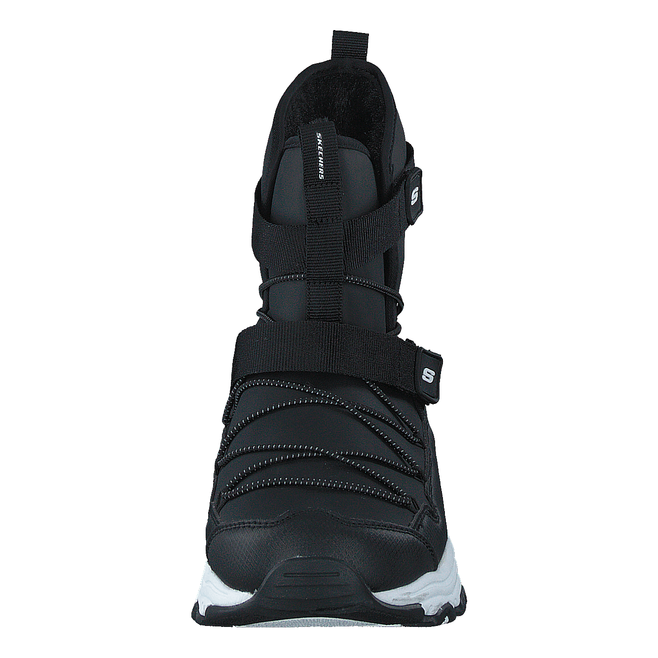 Skechers presents the Girls D'lites Snow Stomp, a stylish and functional winter boot for young adventurers. This black, high-top design features a slip-on style with adjustable straps for a secure fit. The water-resistant upper and thick, white sole with robust treads provide excellent protection and traction in snowy conditions, while the padded construction ensures warmth and comfort.