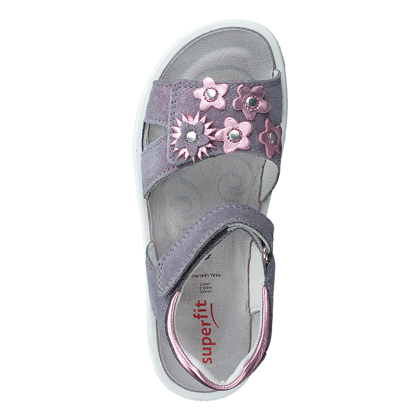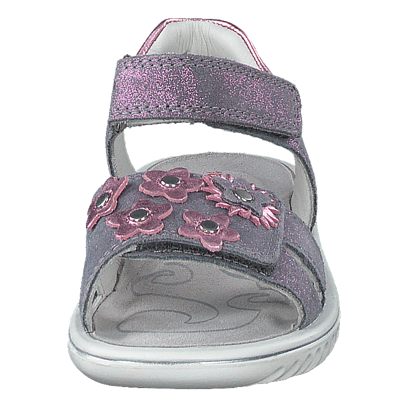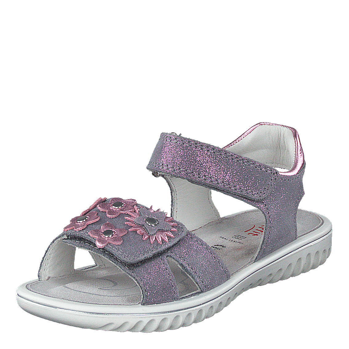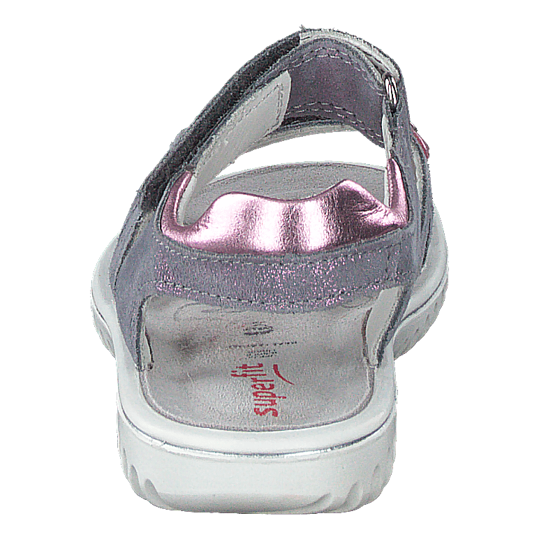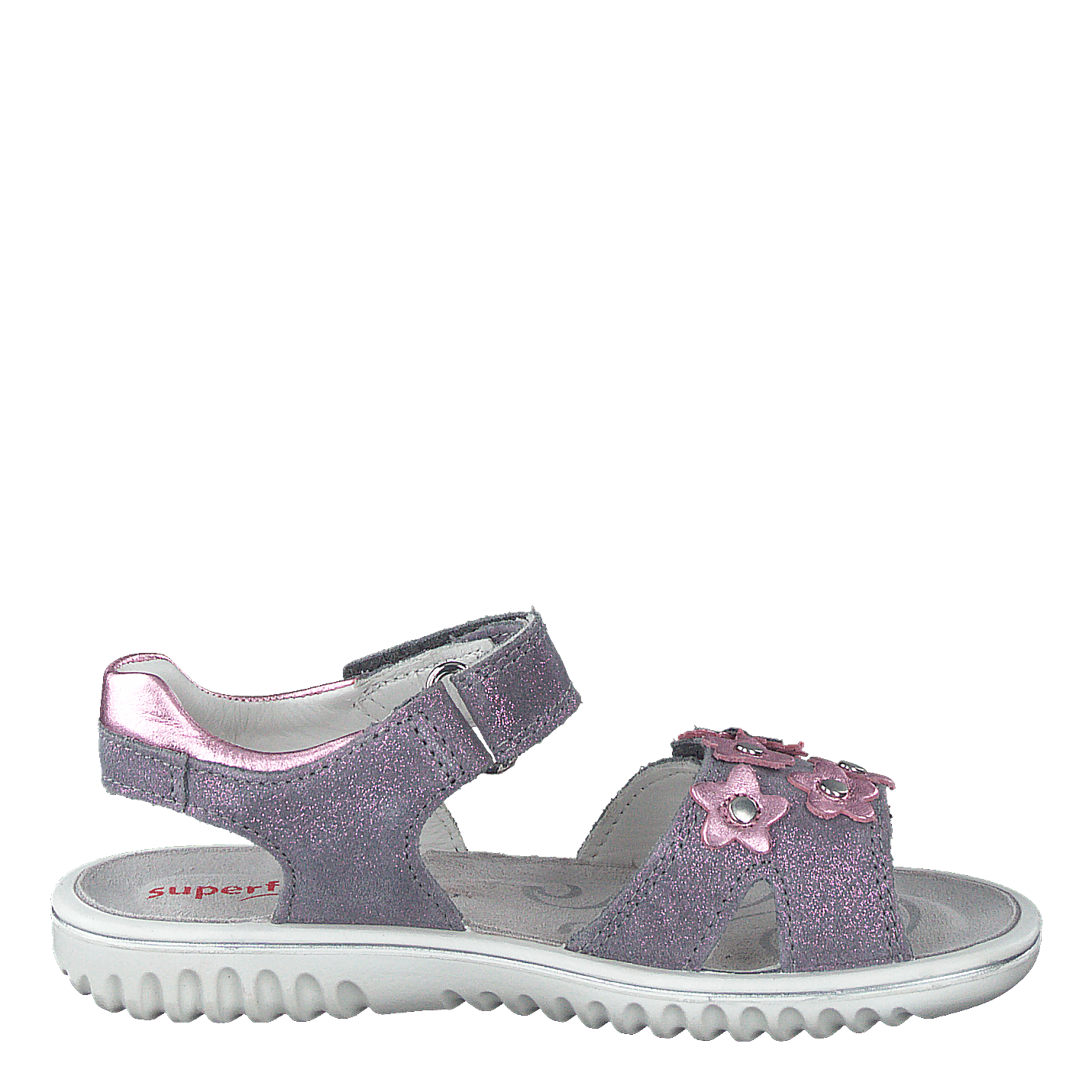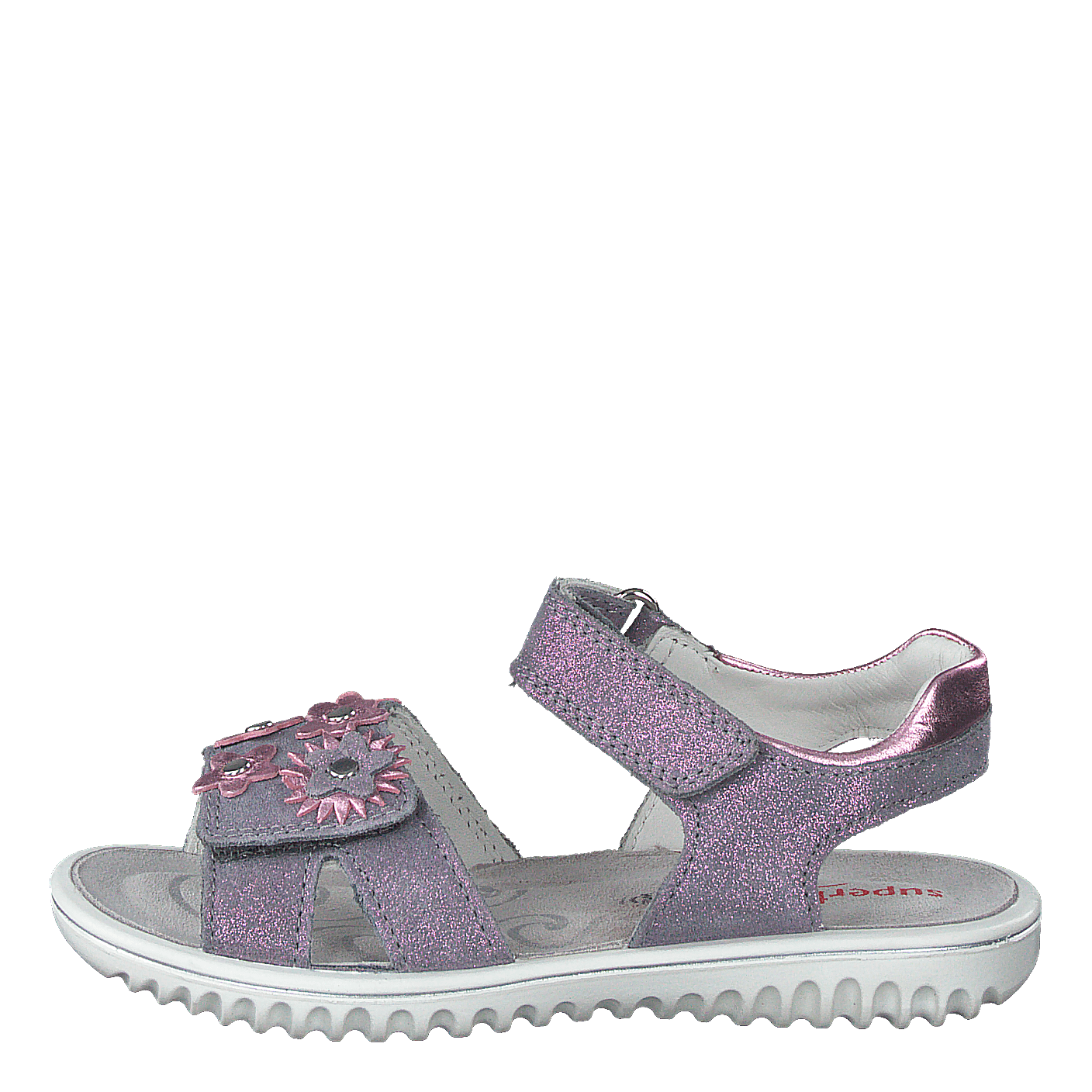 Sparkle Grey sandals by Superfit offer comfort and style for little feet. These glittery grey clogs feature pink accents, a textured suede-like upper, and an intricate floral decoration. With two adjustable straps, including a velcro ankle closure, and a grippy white sole, these sandals combine practicality with playful, feminine design for spring wardrobes.