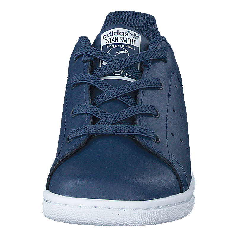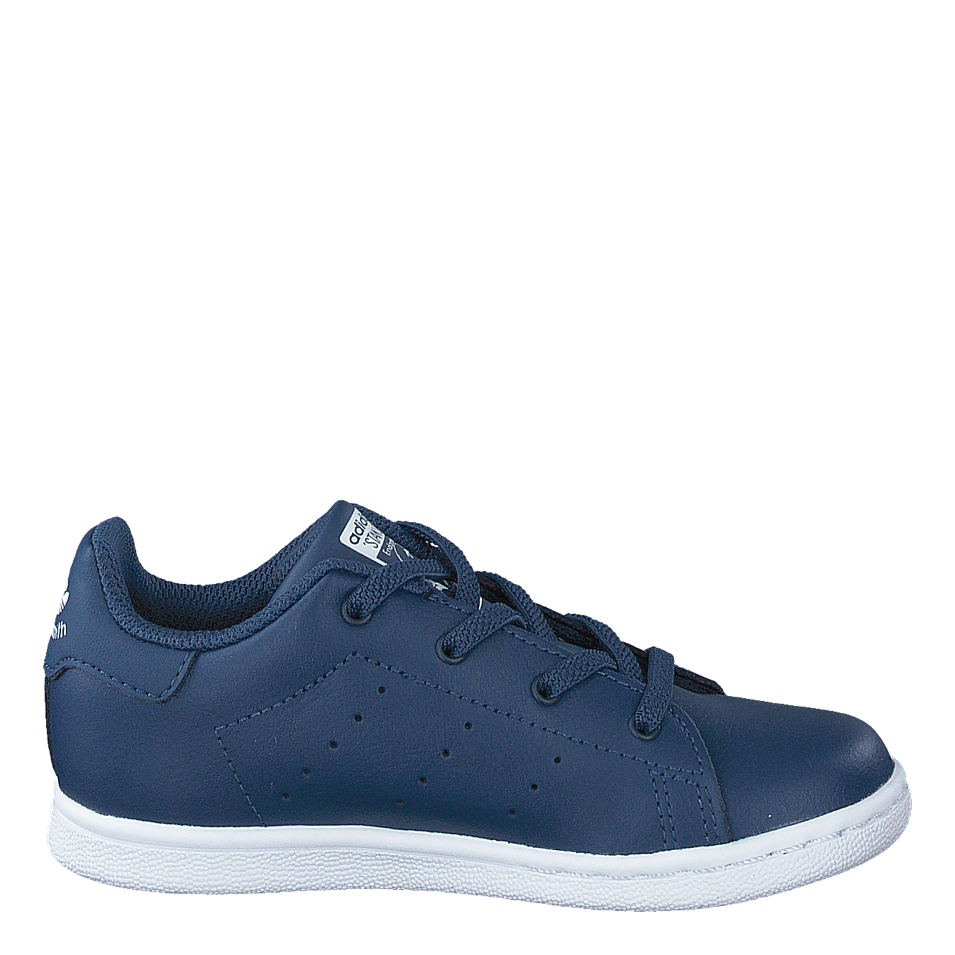 These classic Stan Smith sneakers for children feature a sleek navy blue leather upper with iconic perforated 3-stripes. The minimalist design is enhanced by a white rubber sole and Adidas trefoil logo on the tongue. With a comfortable textile lining and four-eyelet lacing system, these shoes offer both style and practicality for young feet.
