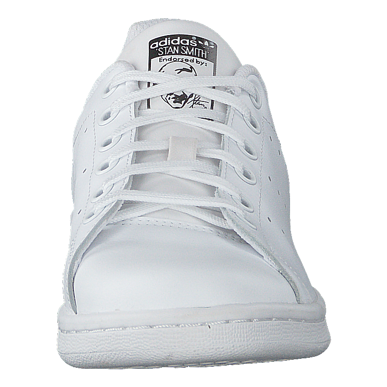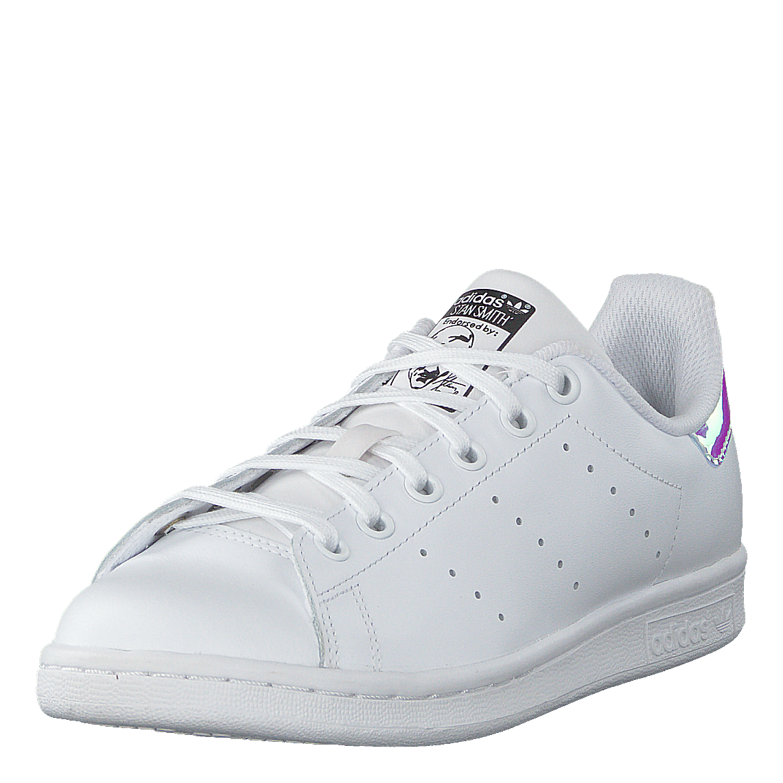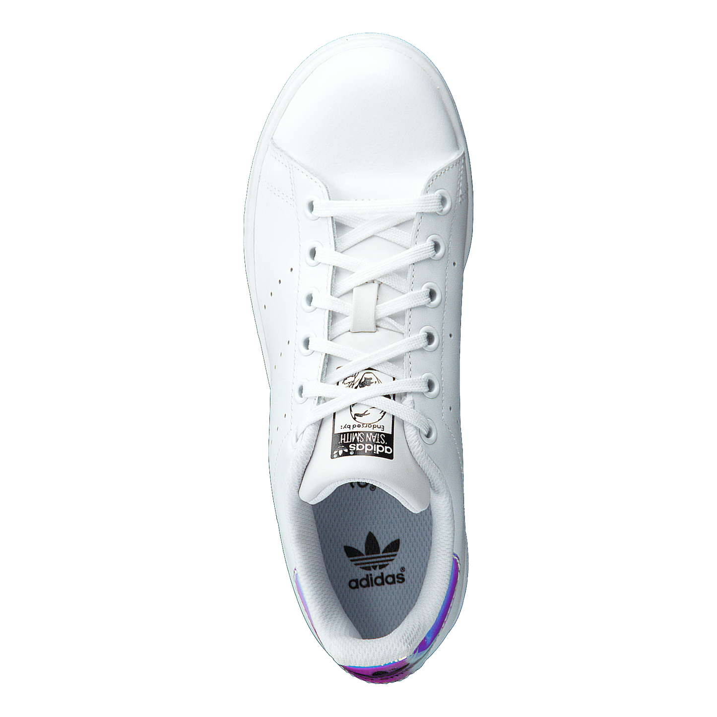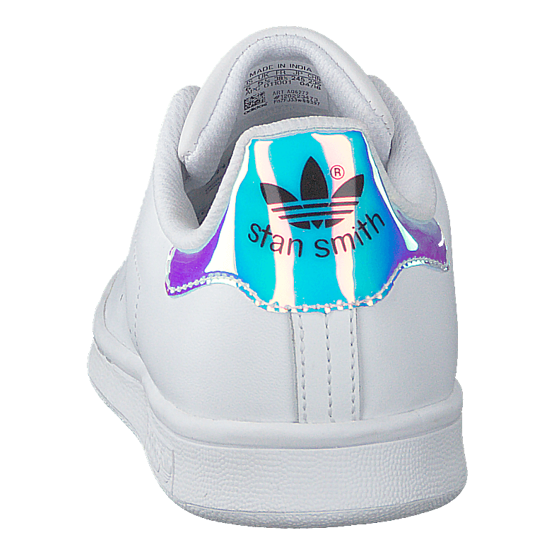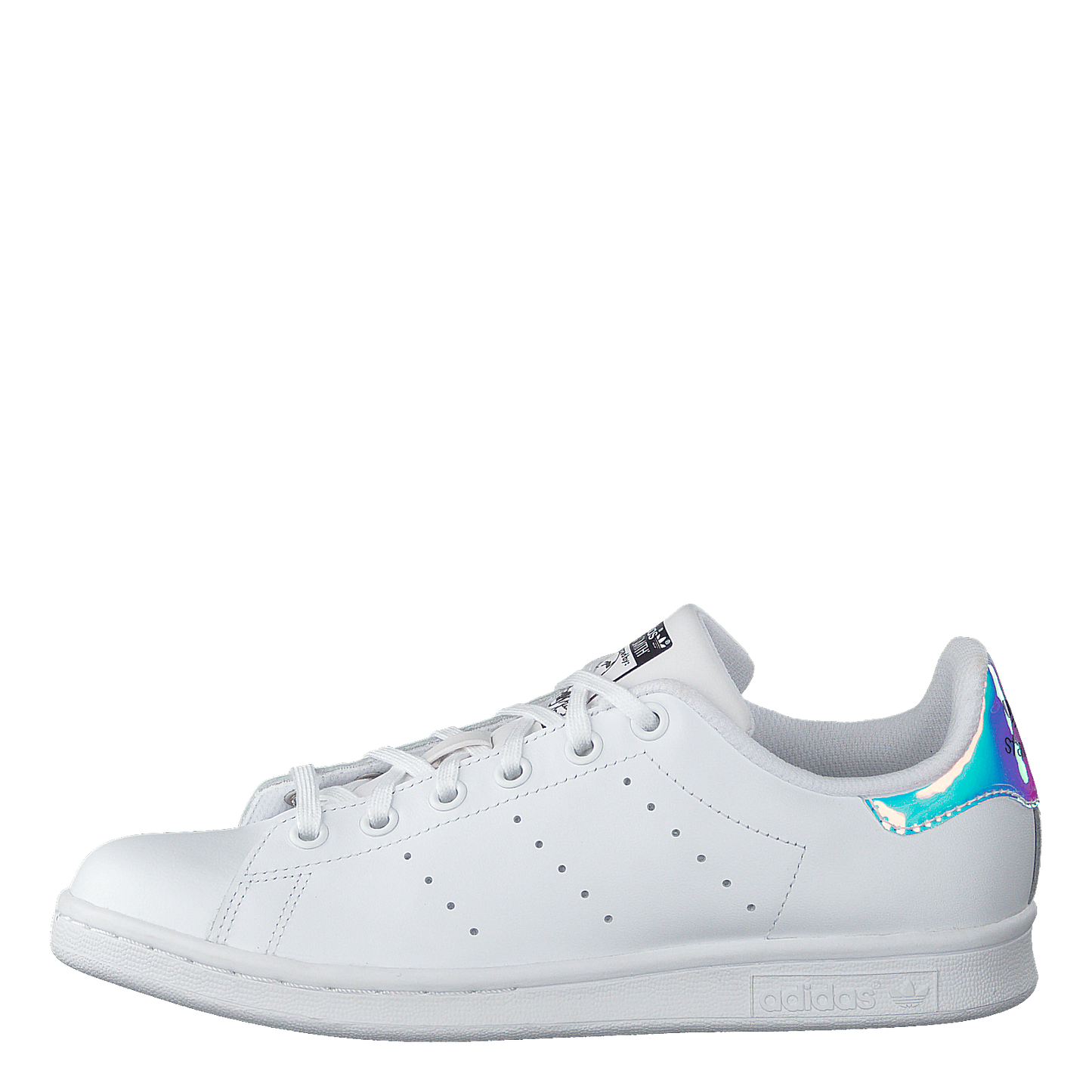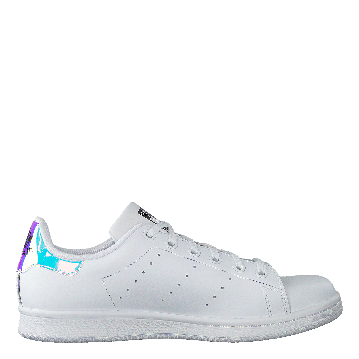 Classic Adidas Stan Smith J sneakers in white leather with a modern twist. Features the iconic perforated three-stripe design and a striking iridescent heel tab that shimmers in multiple colors. This updated version combines timeless style with a contemporary holographic accent, all while maintaining the shoe's sleek silhouette and comfortable fit.