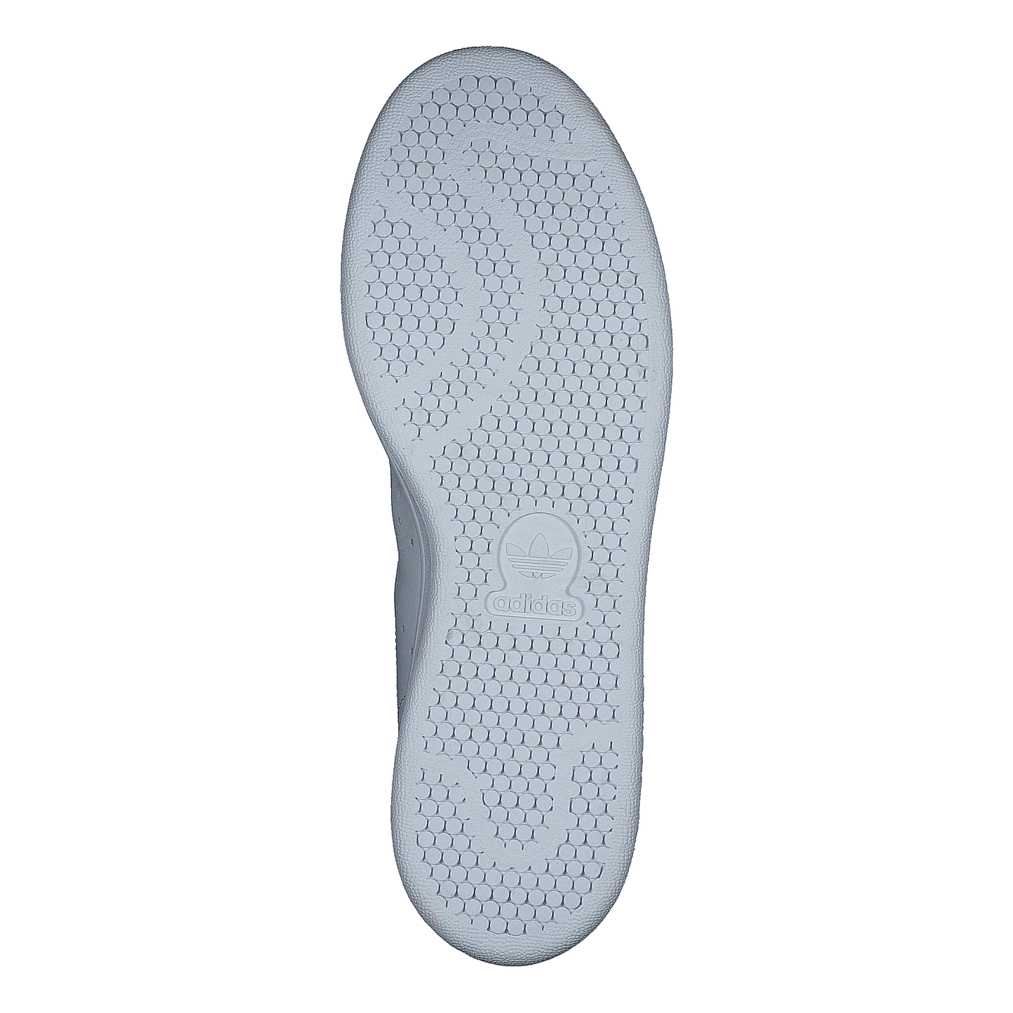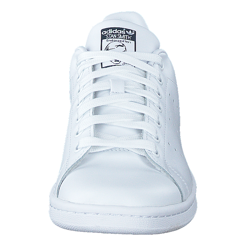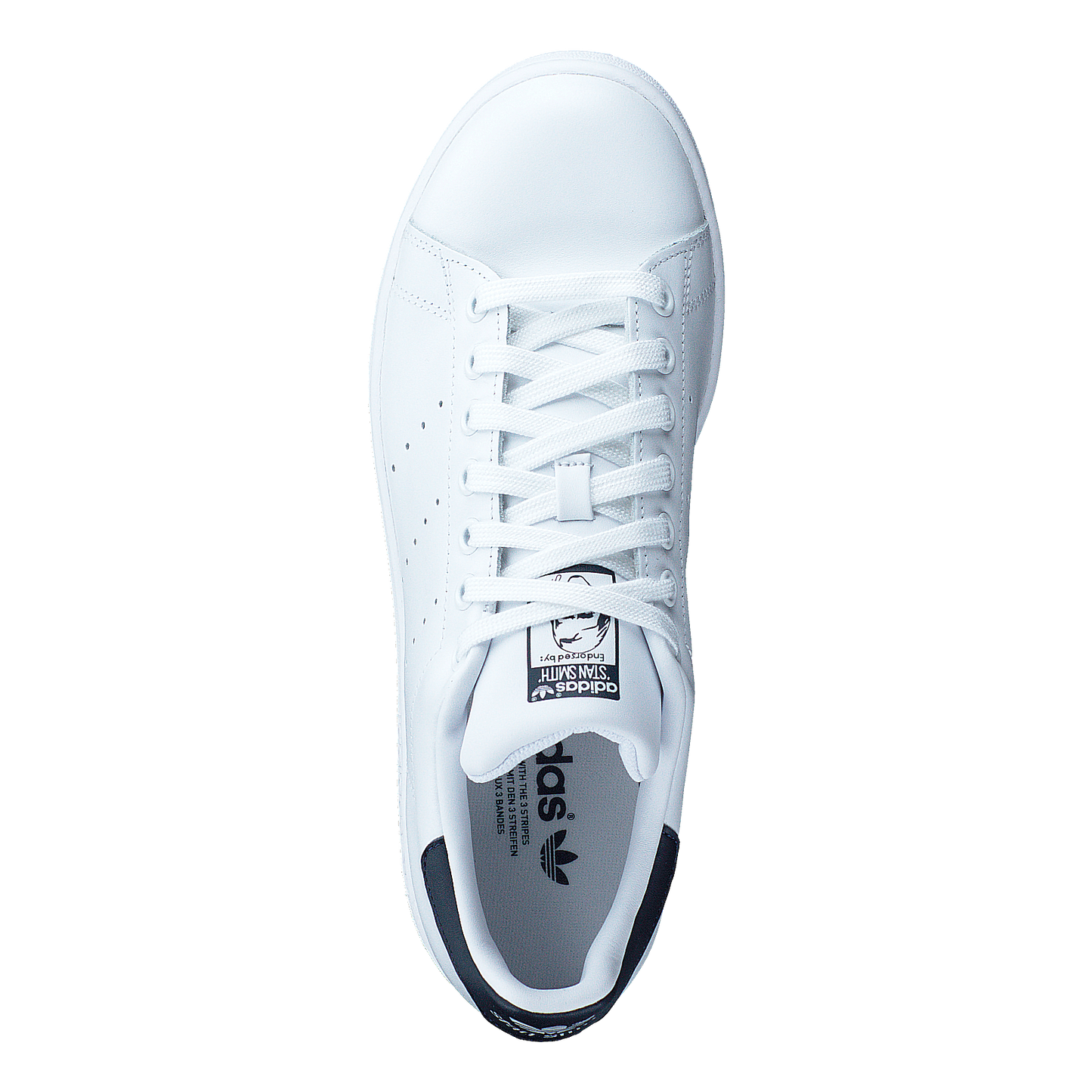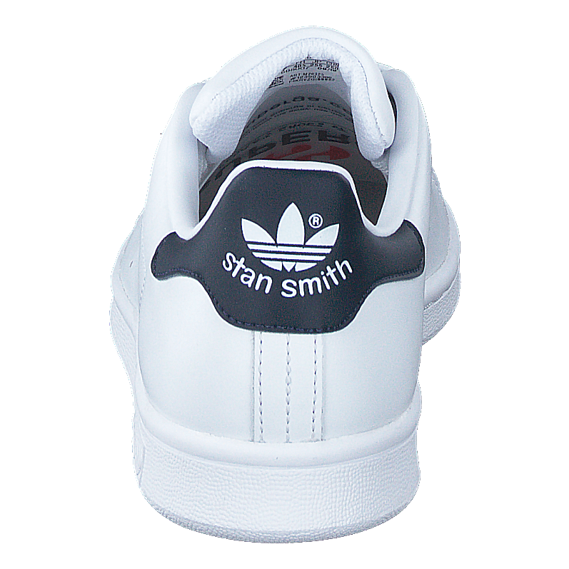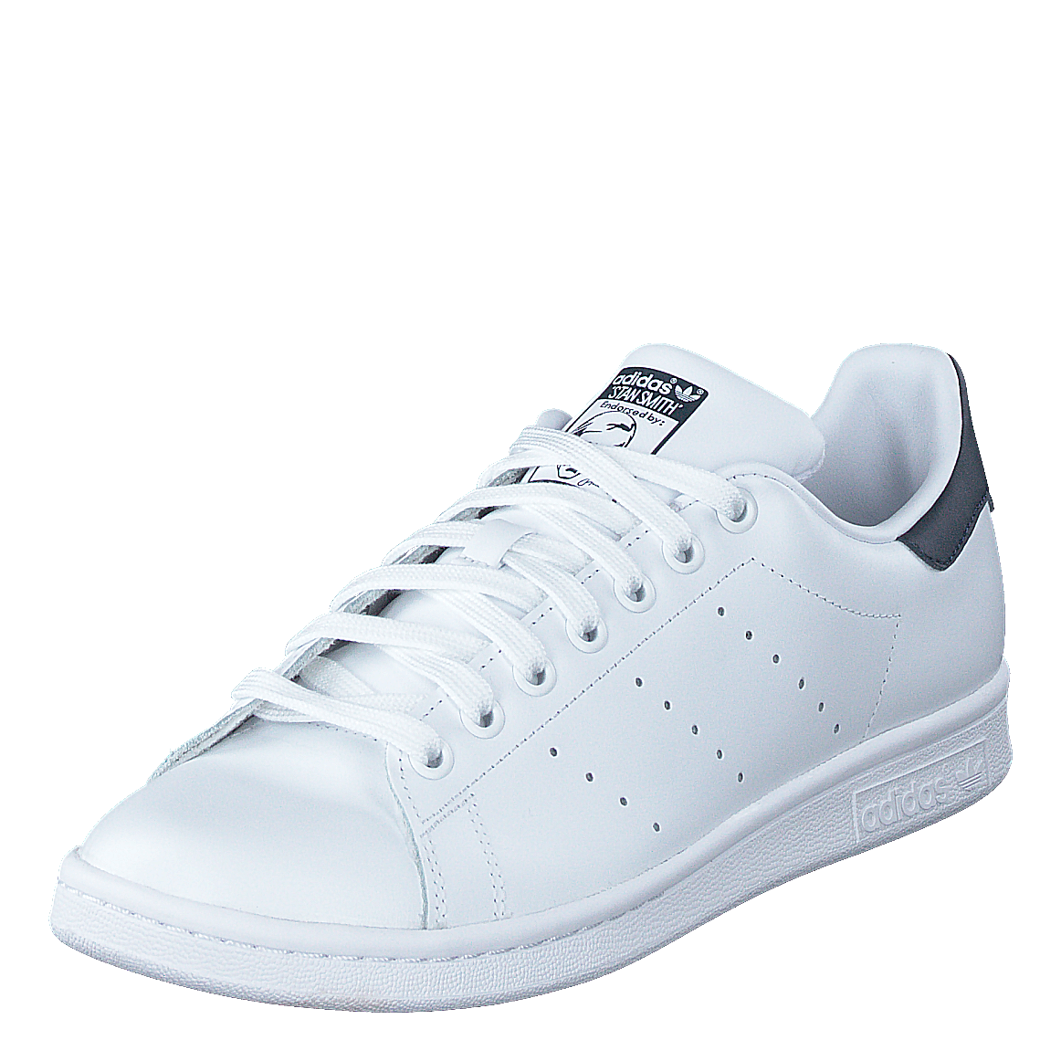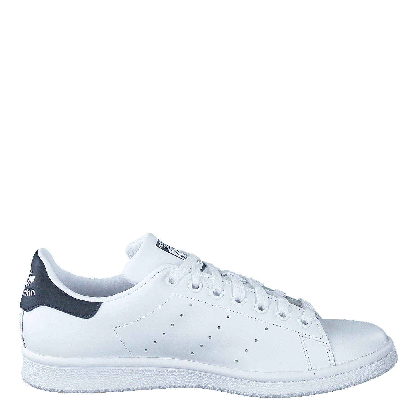 Classic Adidas Stan Smith sneaker in white leather with navy blue heel tab. Features minimalist design, low-top profile, and iconic three-stripe perforation. Versatile for athletic and casual wear, this timeless shoe offers a clean, polished look with a comfortable fit suitable for various foot widths.