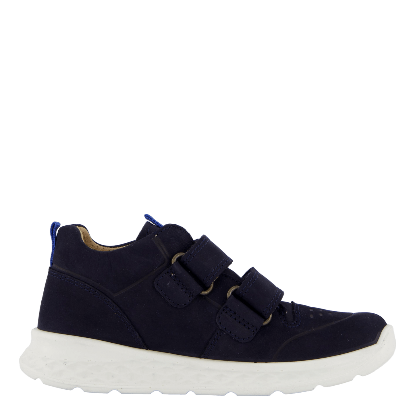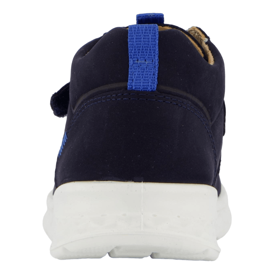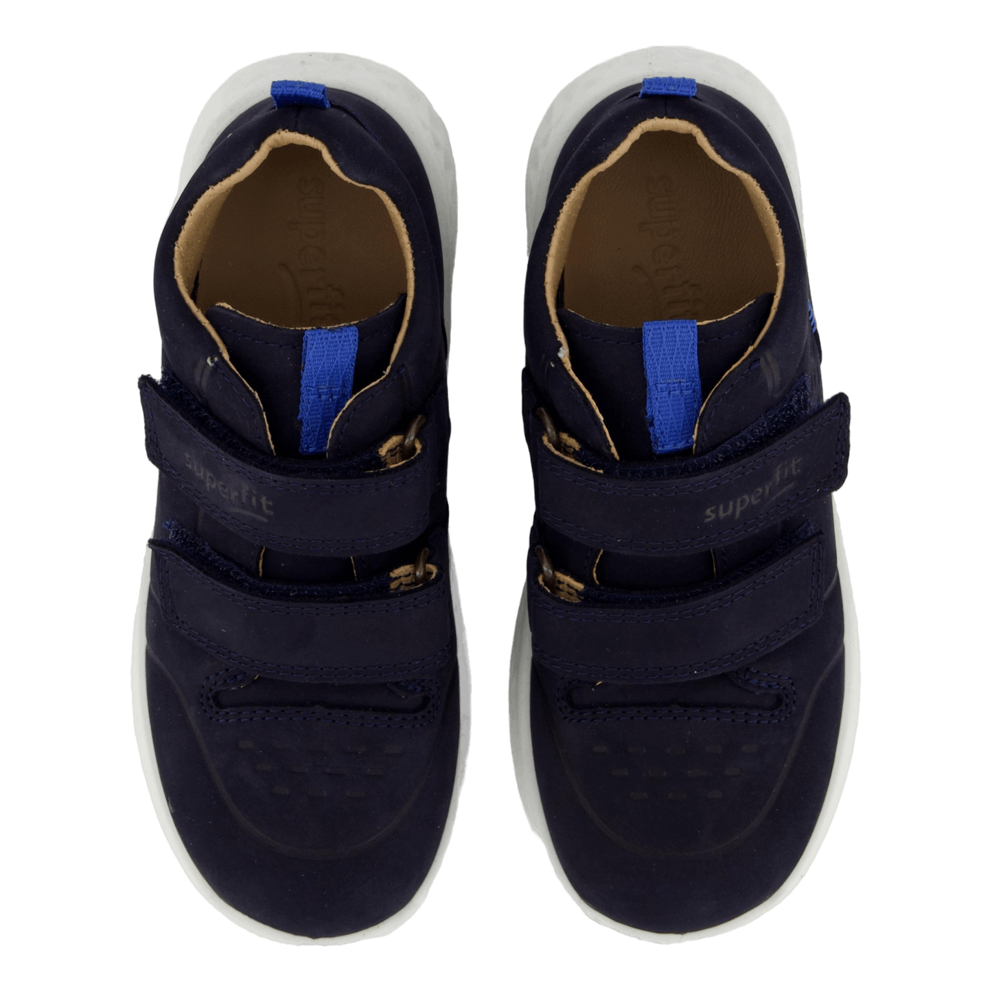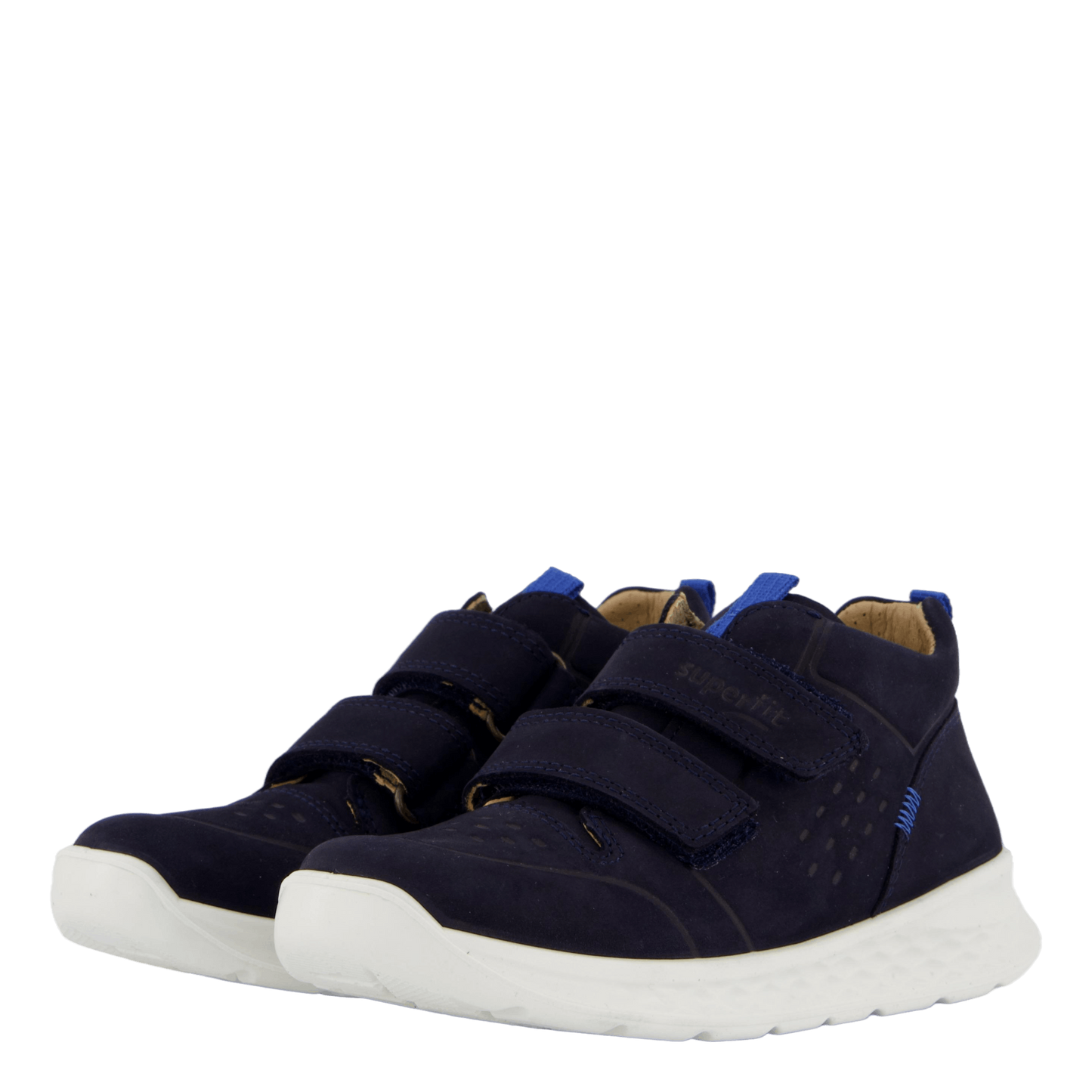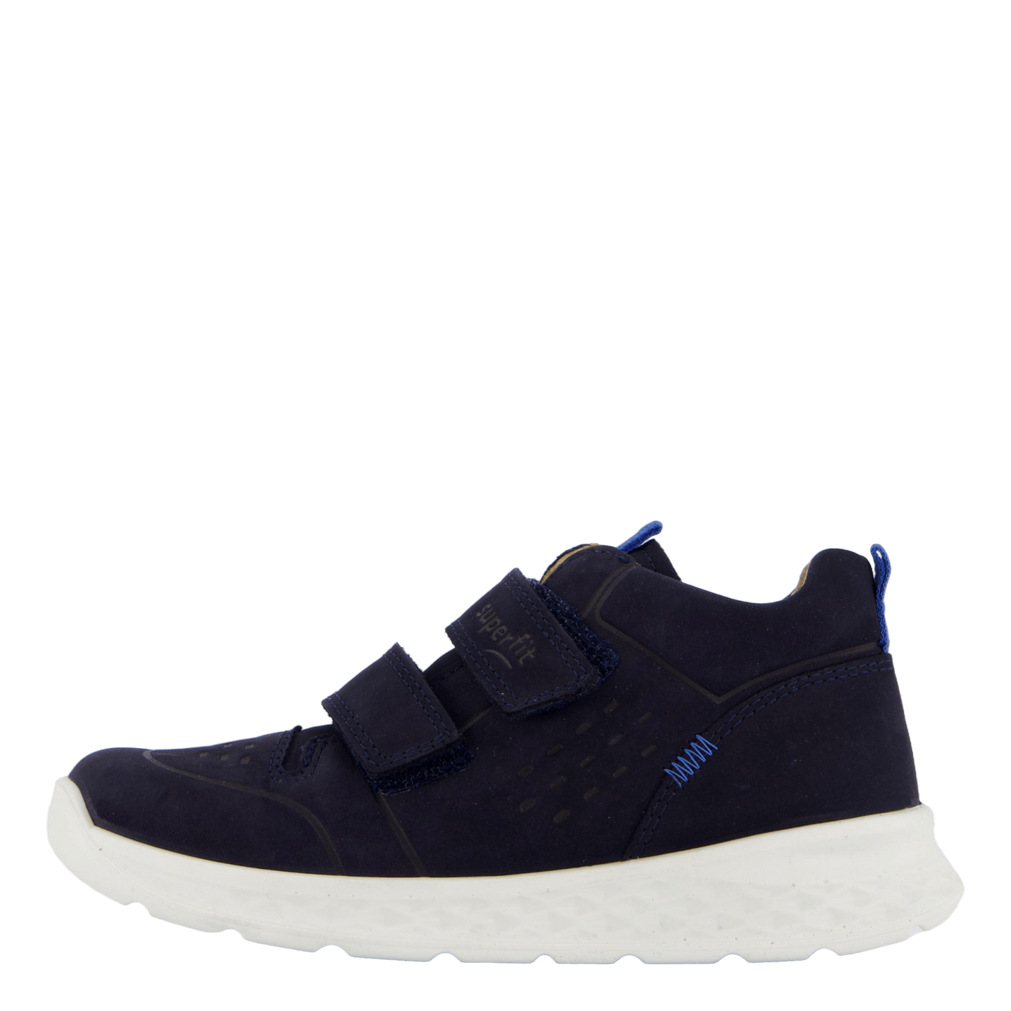 Superfit's Breeze Blue is a stylish children's high-top sneaker in deep navy blue. Made from soft suede or nubuck leather, it features two convenient velcro straps for easy fastening. The thick white sole contrasts beautifully with the dark upper, while a royal blue heel tab adds a subtle pop of color. This modern, sleek design combines sporty aesthetics with practical elements, ensuring comfort and ease of use for active kids.