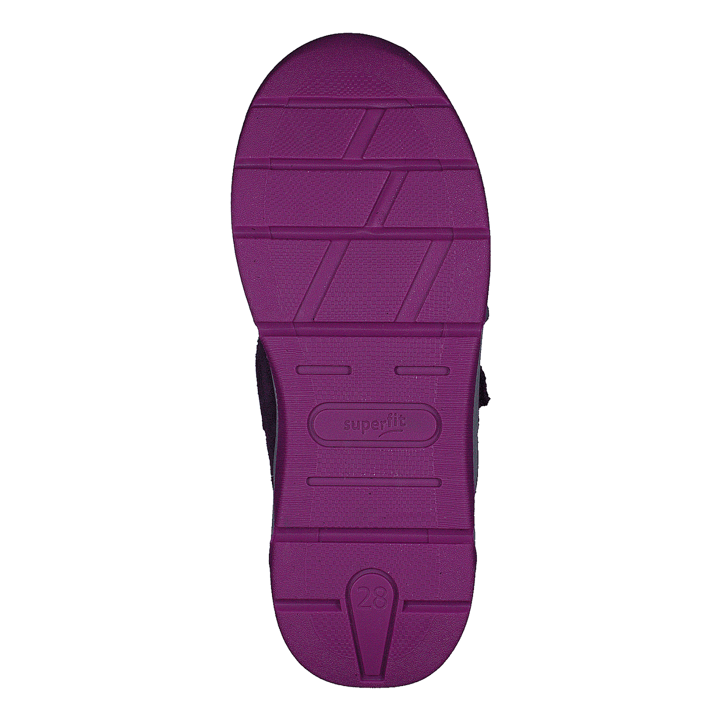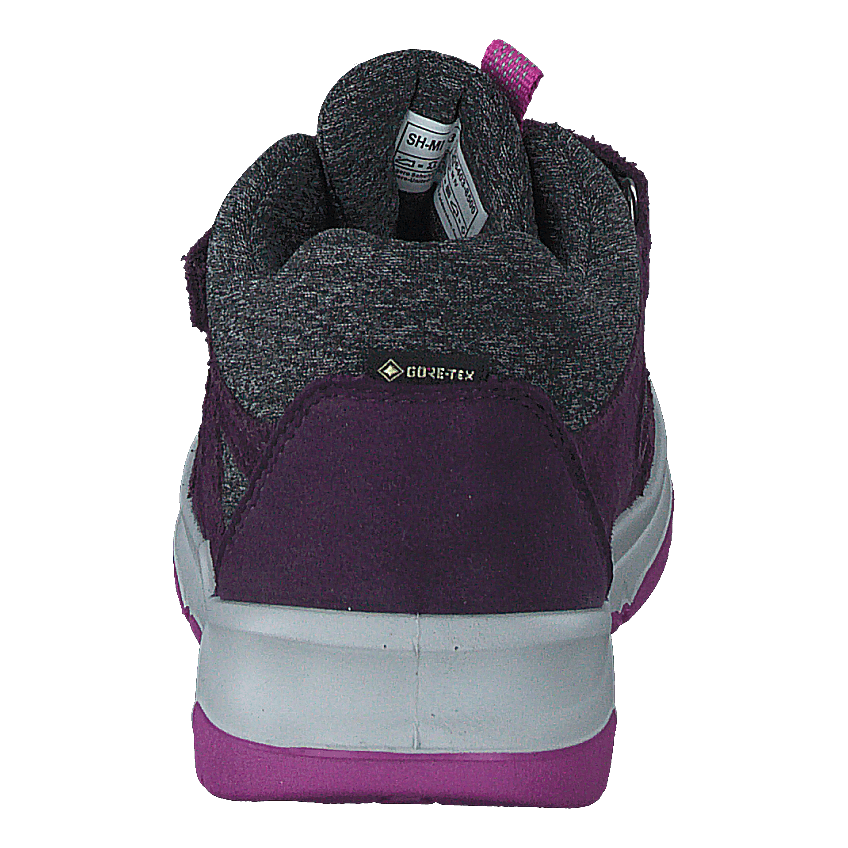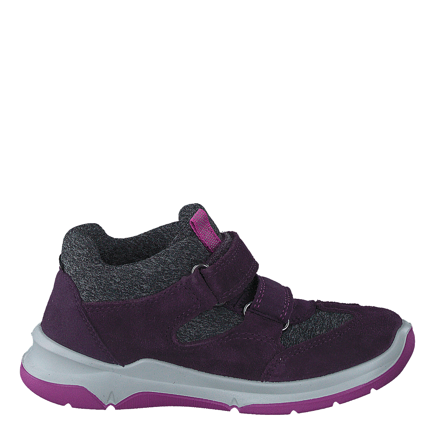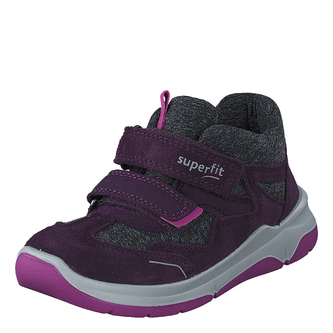 Superfit's Cooper Blue is a stylish first walker shoe designed for active children. This sporty ankle boot features a deep purple suede and textile upper with dark gray accents, complemented by a single velcro strap for easy adjustment. The chunky, supportive sole in light gray with a purple outsole provides excellent traction and comfort. With GORE-TEX lining and a removable insole, it ensures dry, warm feet and optimal fit.