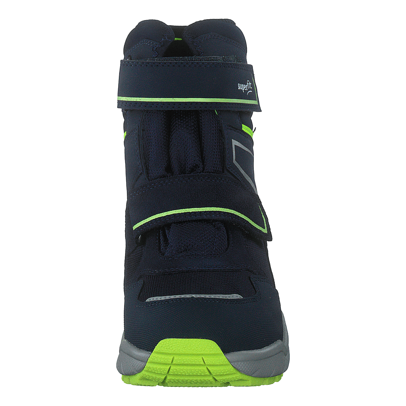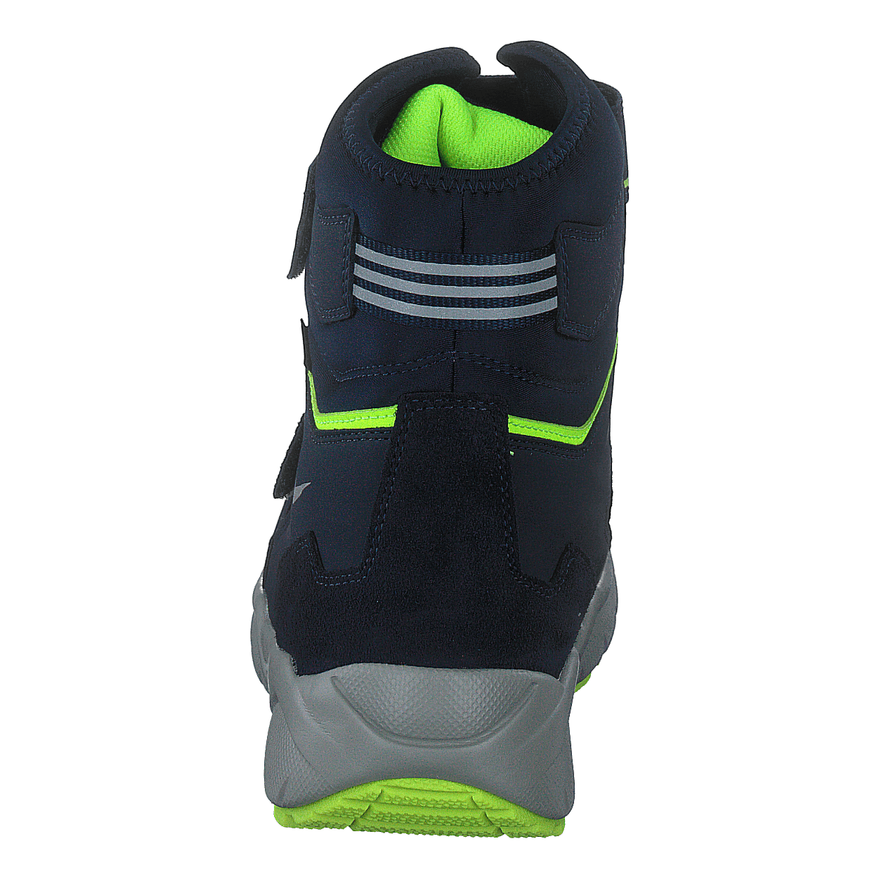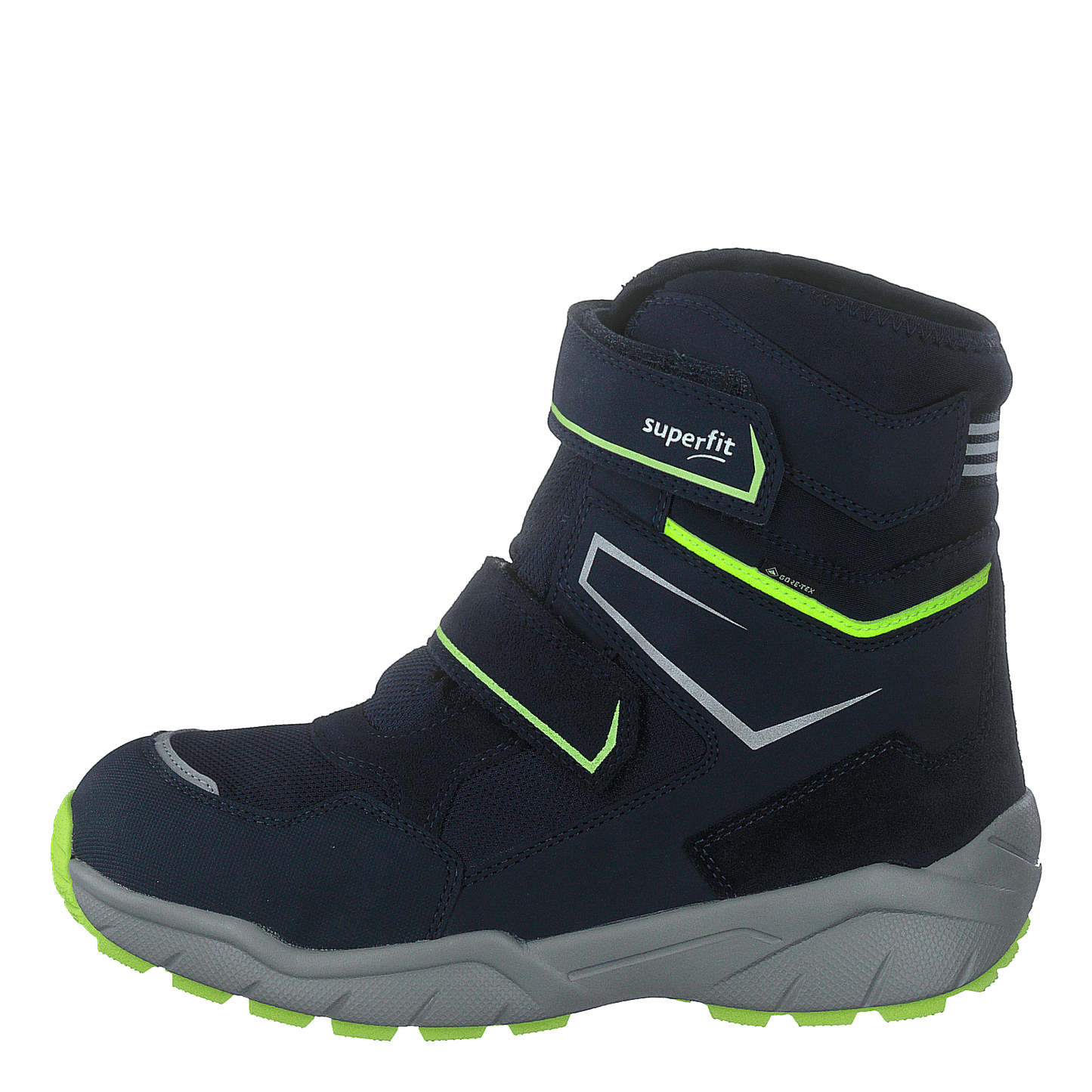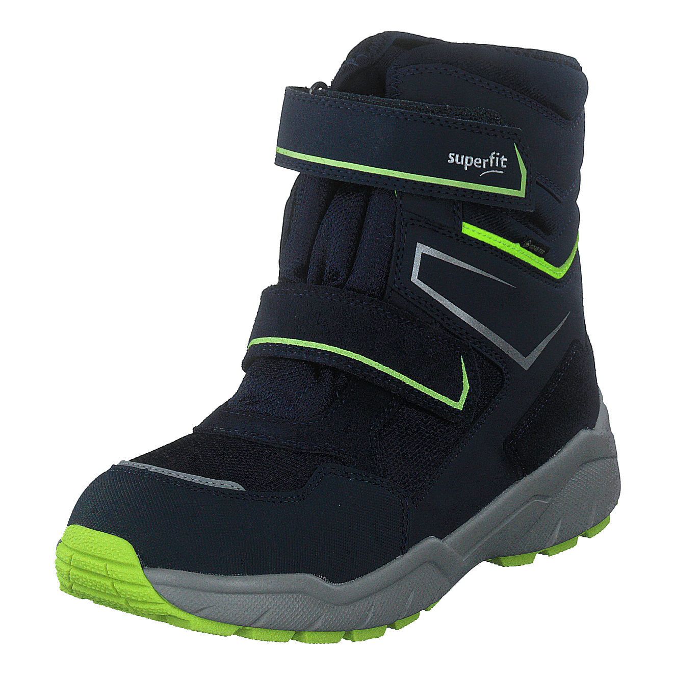 Superfit's Culusuk 2.0 Blue winter boot combines style and functionality for children. This high-top boot features a dark blue water-resistant upper with neon green accents and reflective elements for safety. Two Velcro straps ensure easy entry and a secure fit. The GORE-TEX lining provides warmth and waterproofing, while the rugged sole offers excellent traction in winter conditions.