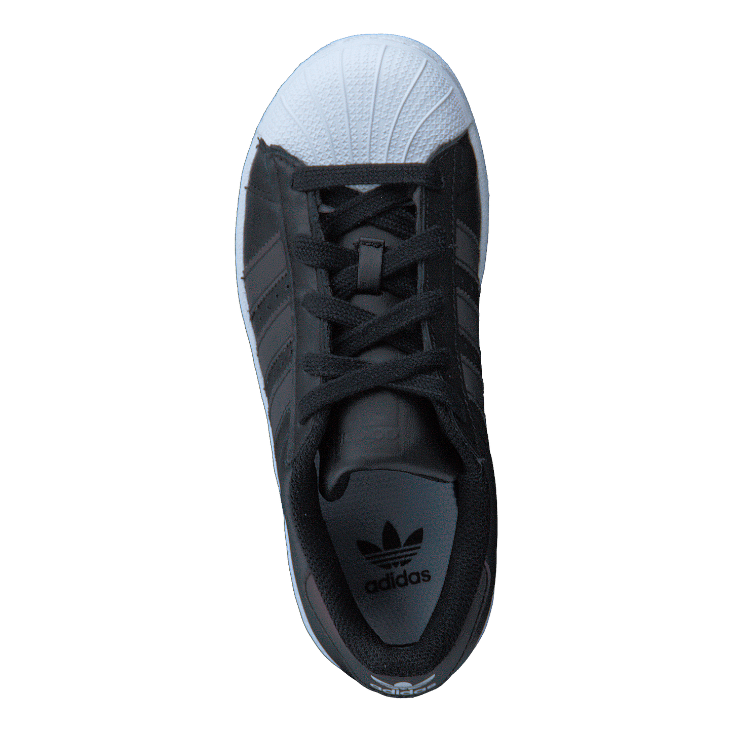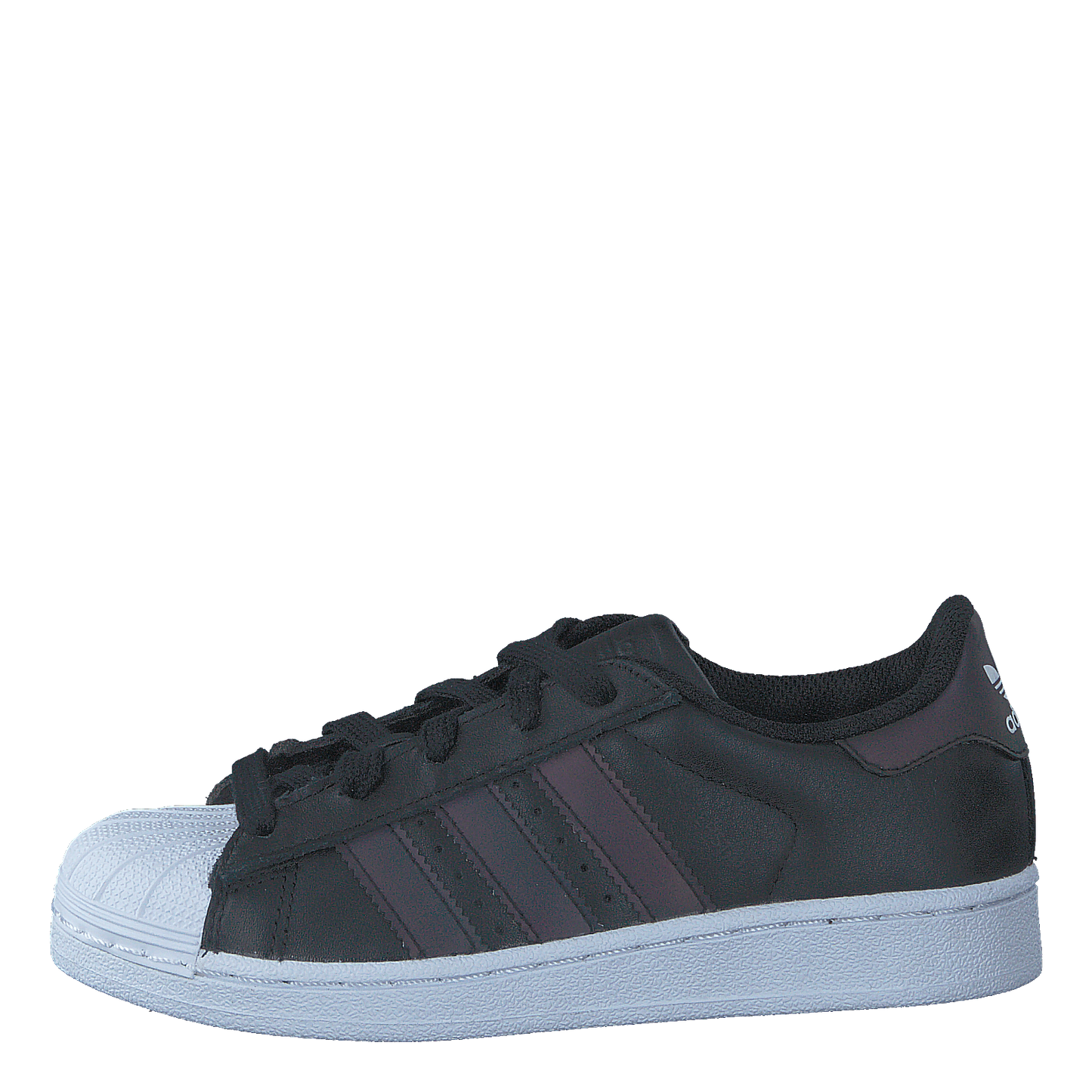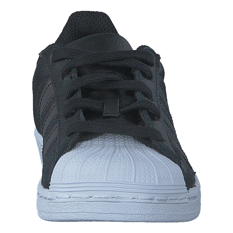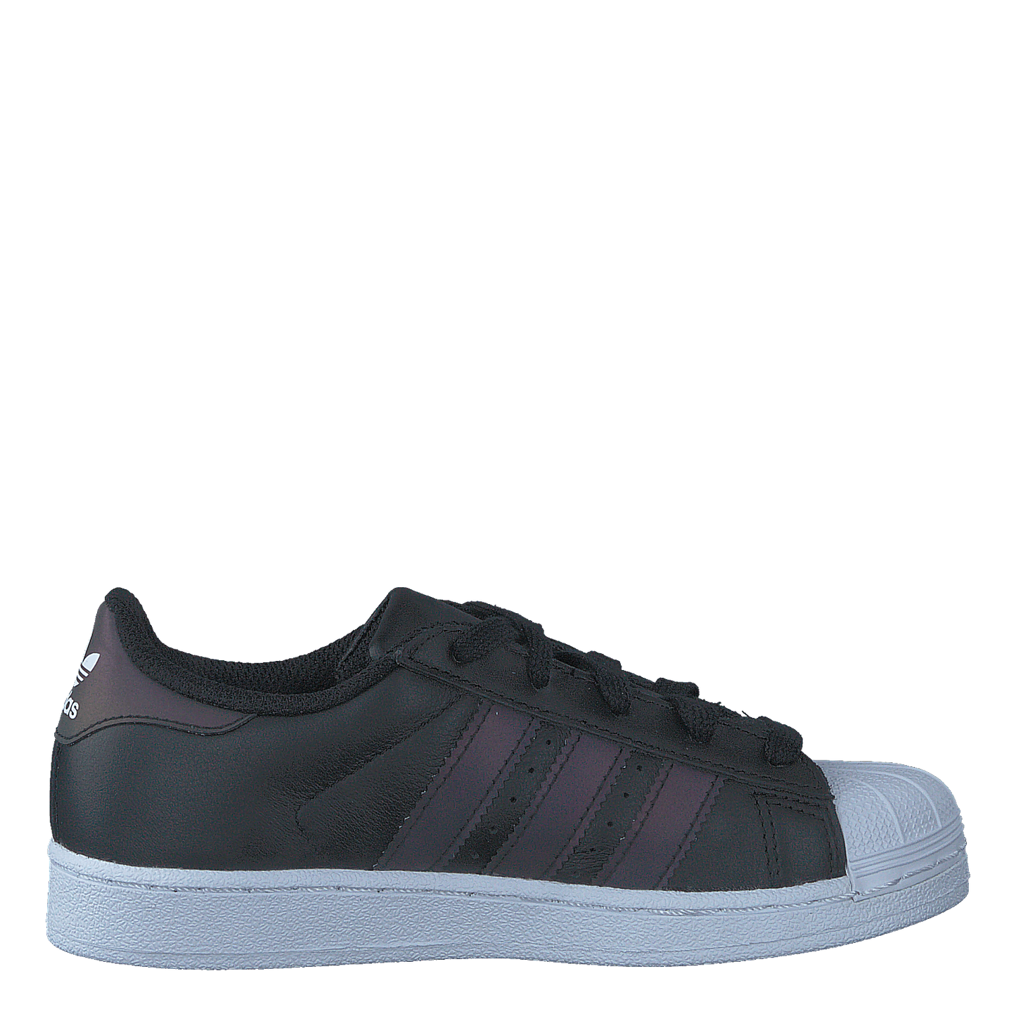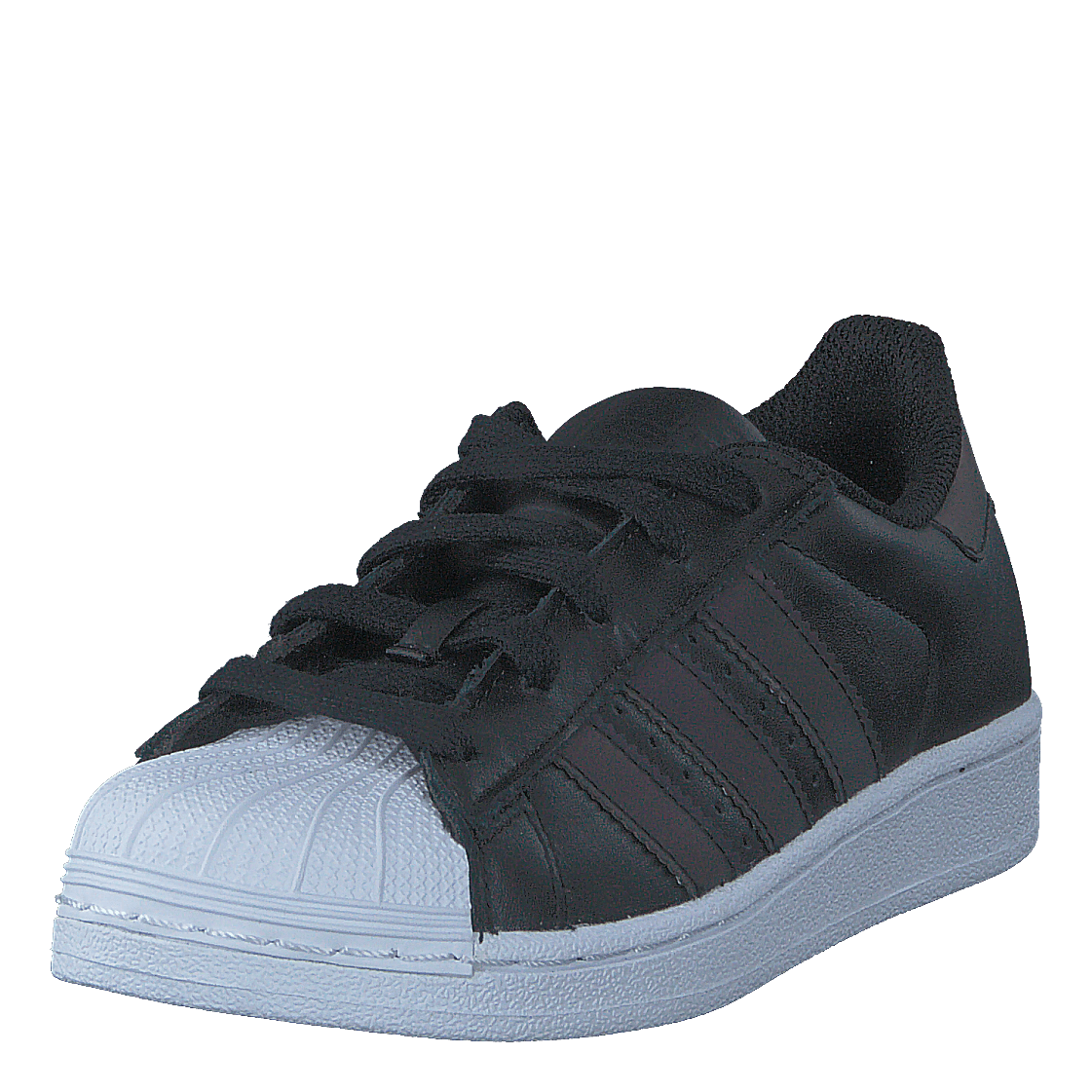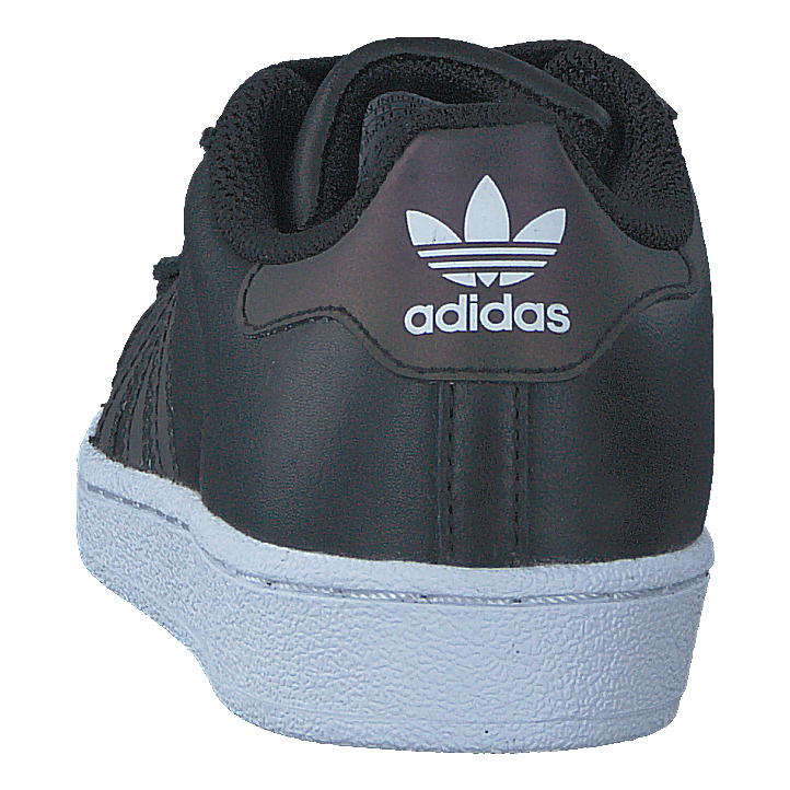 Iconic Adidas Superstar sneakers featuring a sleek black leather upper with signature three-stripe design. Contrasting white shell toe and sole add classic style. Comfortable textile lining and padded collar enhance wearability. Versatile for both sport and street fashion, these shoes blend retro charm with modern aesthetics for timeless appeal.