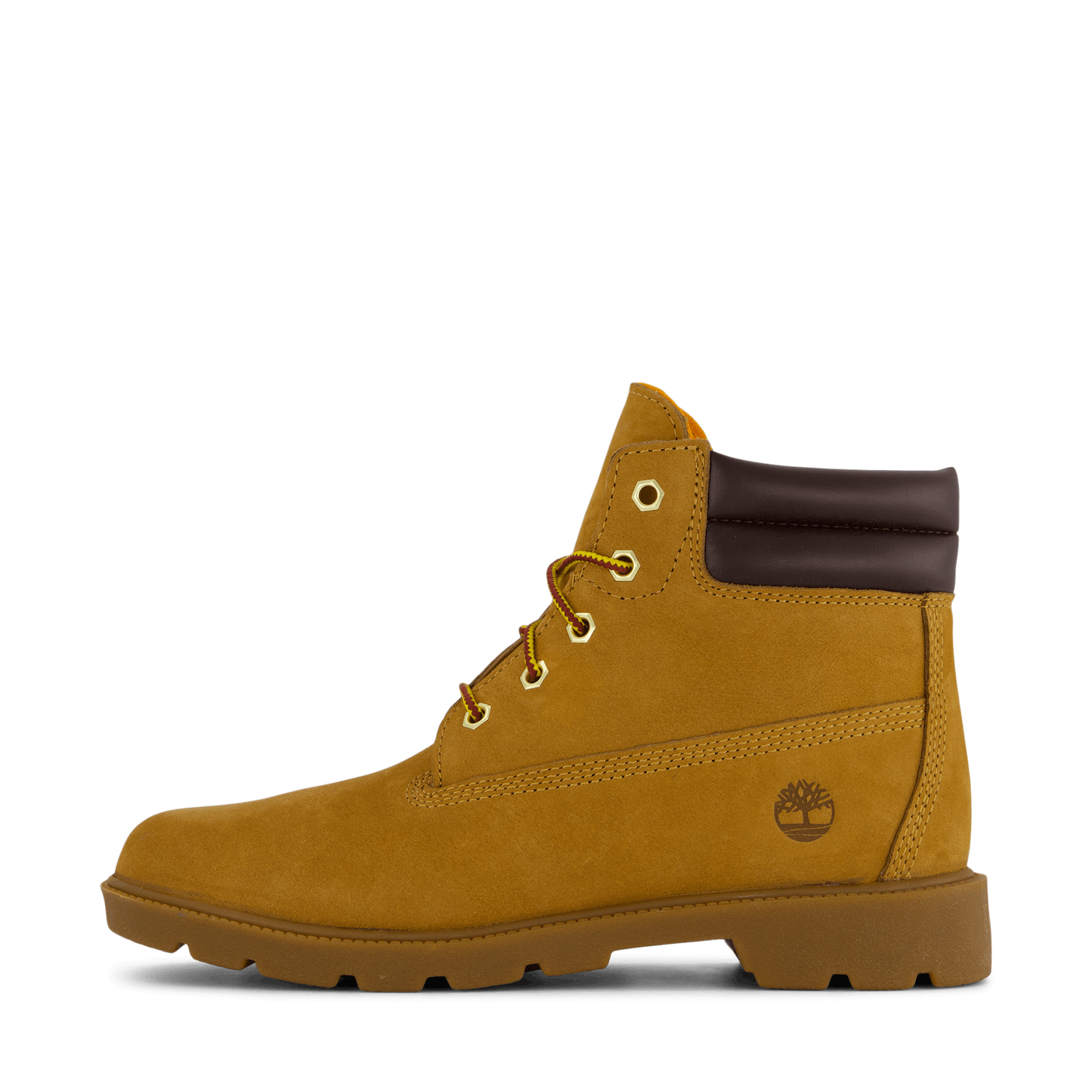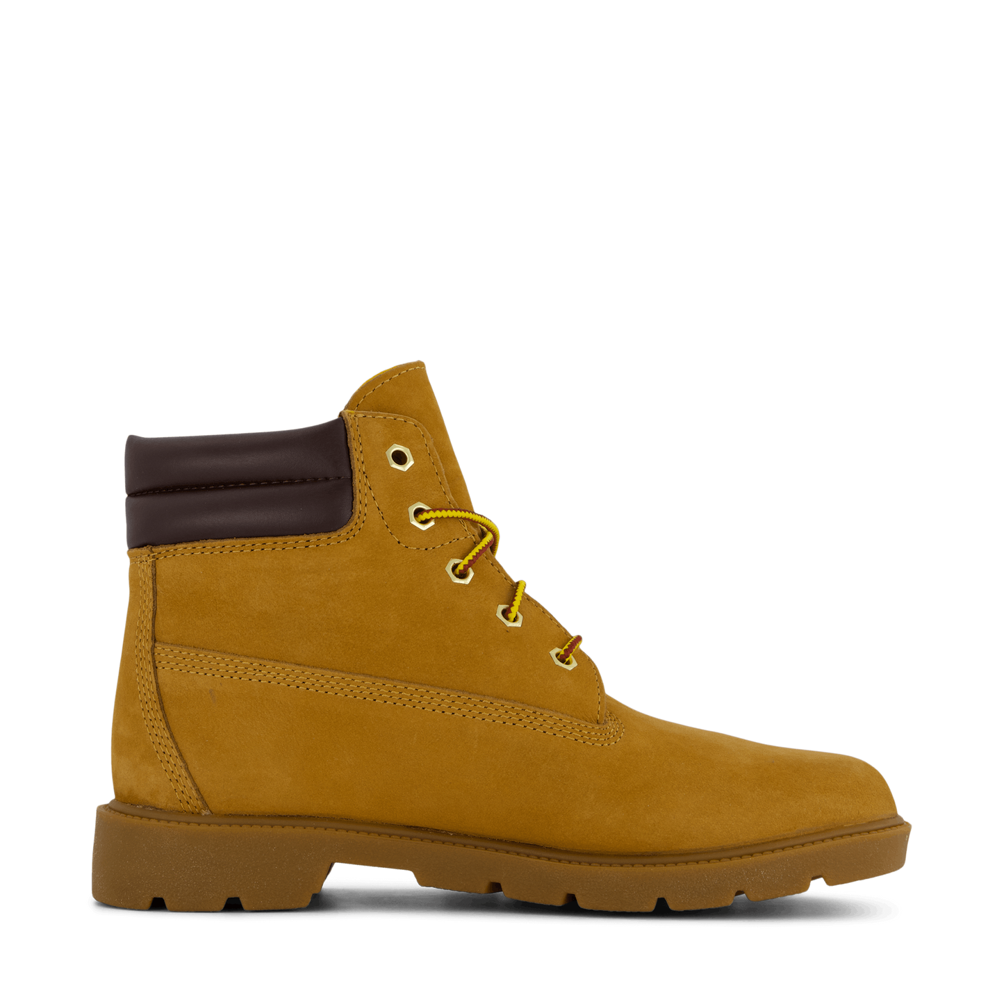 Timberland's 6-inch wheat-colored boots offer rugged durability and timeless style. Crafted from suede or nubuck leather, these versatile work or hiking boots feature a lace-up design with metal eyelets, a sturdy rubber sole, and a darker brown leather collar. Perfect for outdoor activities or casual wear, they combine functionality with classic appeal.