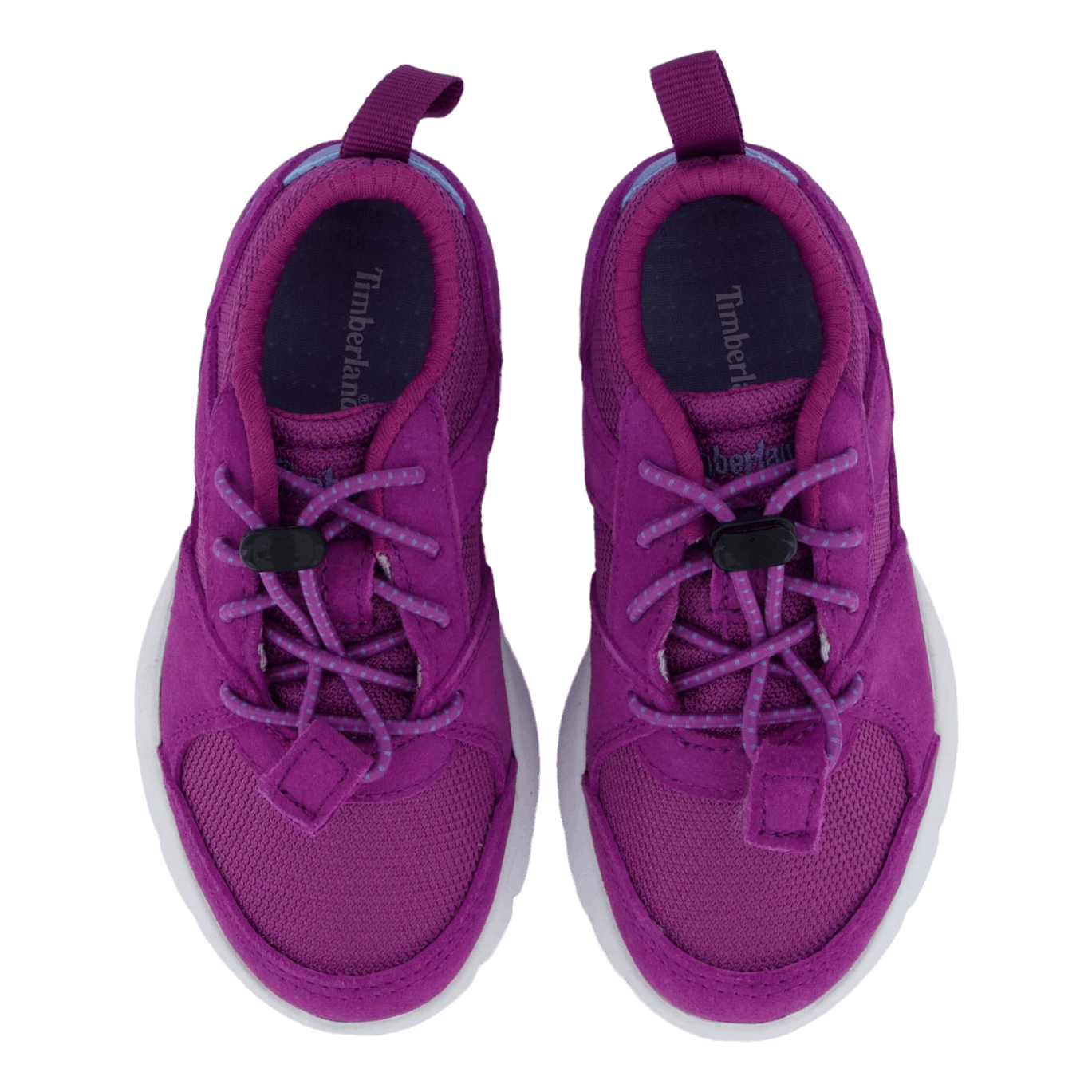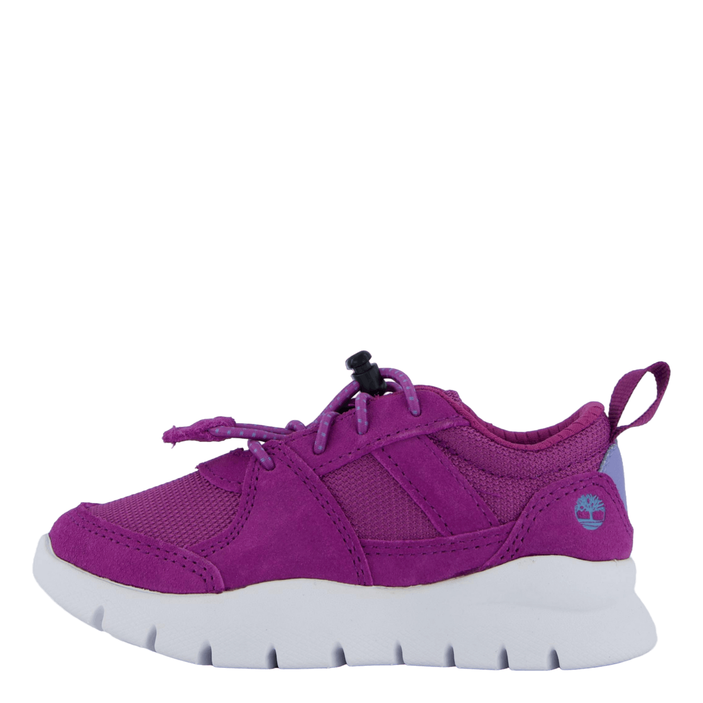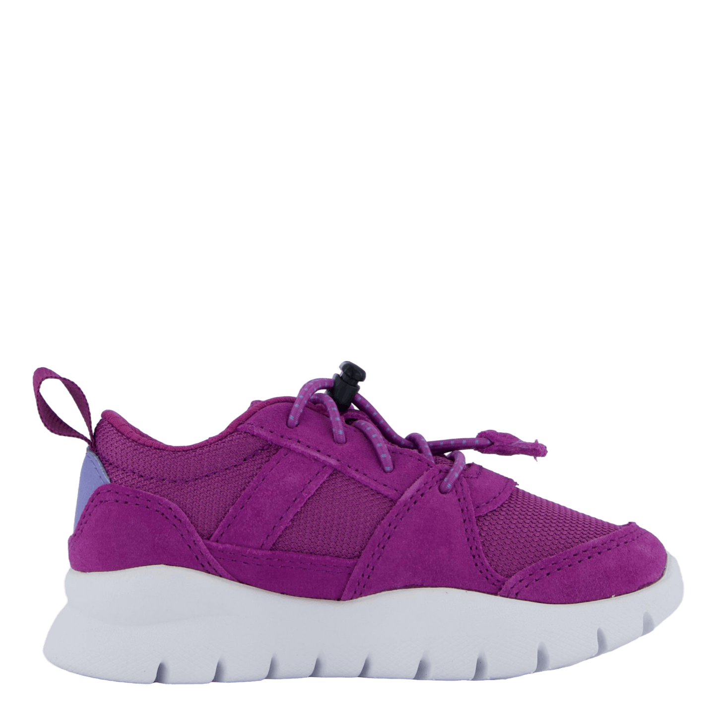 Striking purple kids' sneaker featuring a toggle lacing system for easy on/off. Made with premium leather and ReBOTL™ fabric lining containing at least 50% recycled plastic. Includes a "Does It Fit?" footbed and ground-contact EVA midsole for comfort and support. Sporty mesh and suede design with a contrasting white sole, perfect for active children.