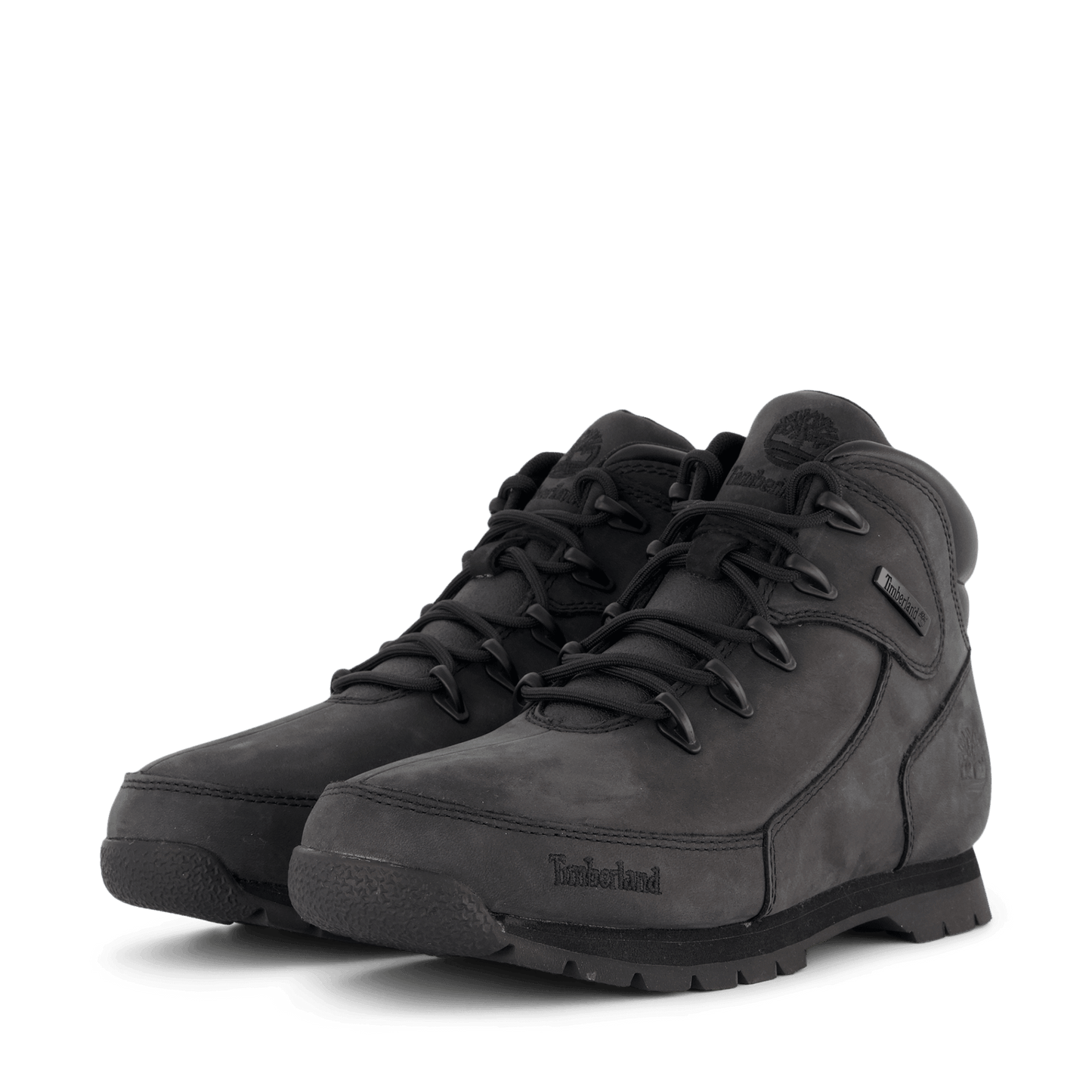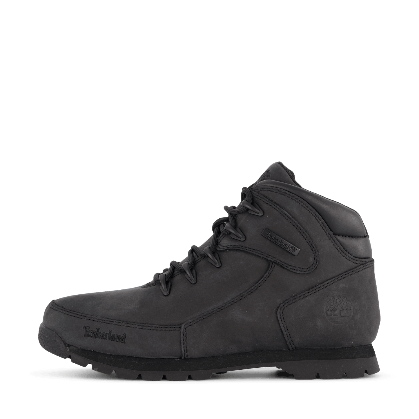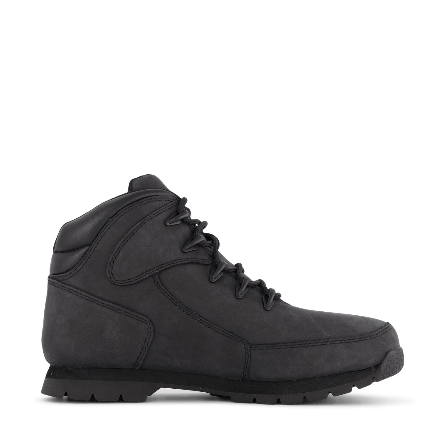 Timberland's Euro Rock Blk Black is a rugged men's ankle boot designed for both urban and outdoor environments. Crafted from durable black leather with a matte finish, it features a lace-up closure with four eyelets for a secure fit. The boot boasts a padded collar and tongue for comfort, a thick, sturdy sole for traction, and a sleek monochromatic style that pairs well with various outfits.