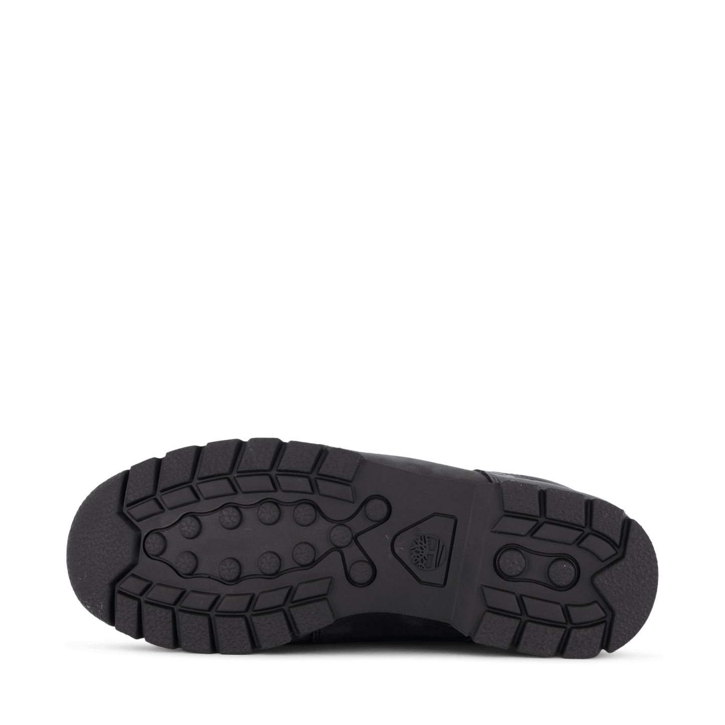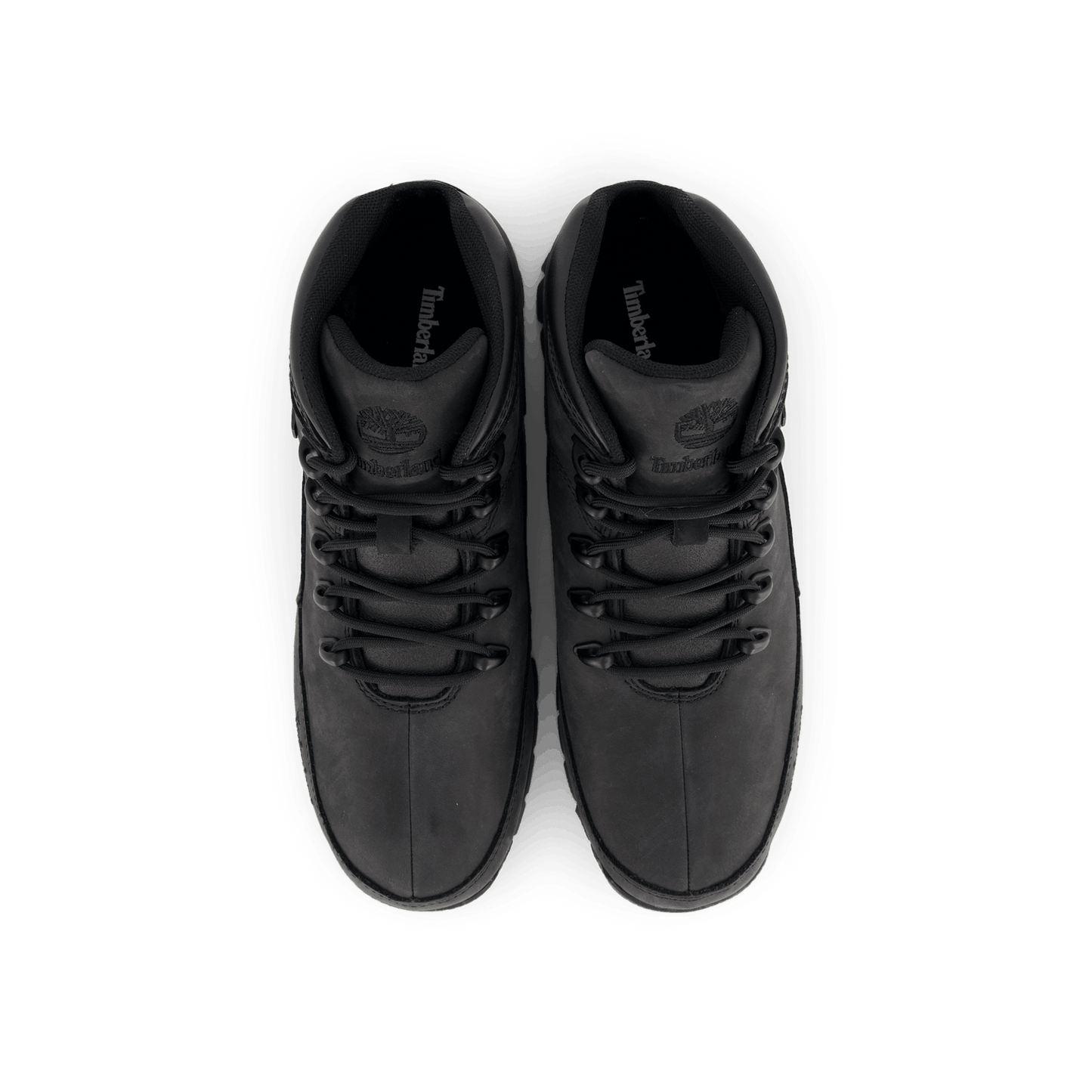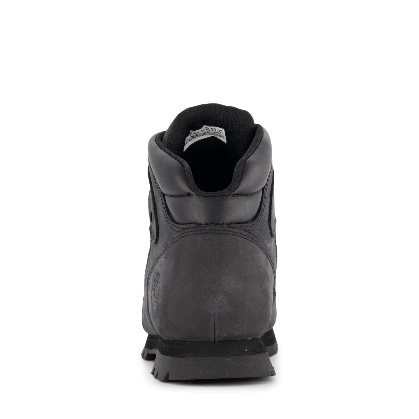Timberland's Euro Rock Blk Black is a rugged men's ankle boot designed for both urban and outdoor environments. Crafted from durable black leather with a matte finish, it features a lace-up closure with four eyelets for a secure fit. The boot boasts a padded collar and tongue for comfort, a thick, sturdy sole for traction, and a sleek monochromatic style that pairs well with various outfits.