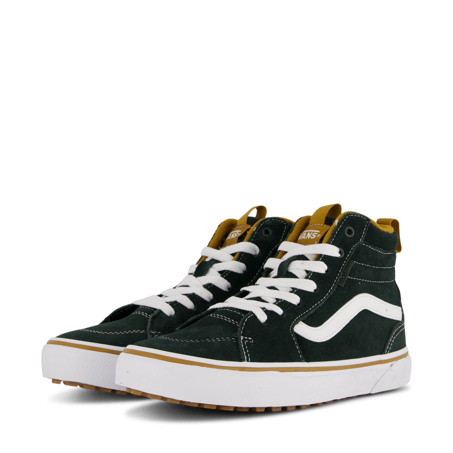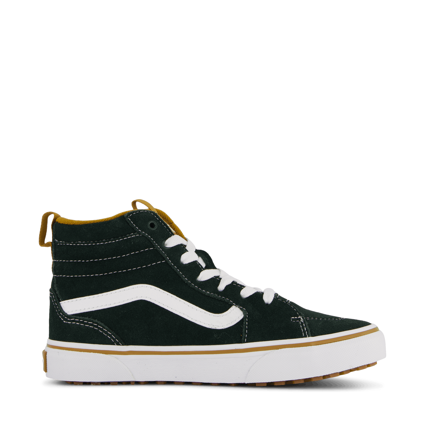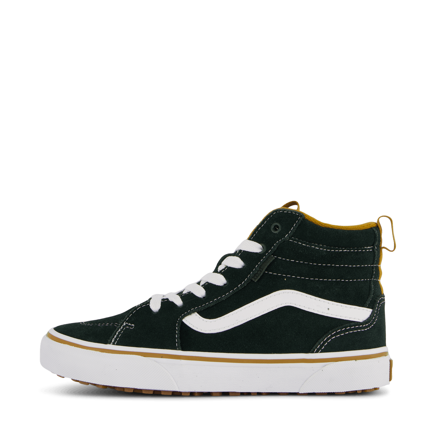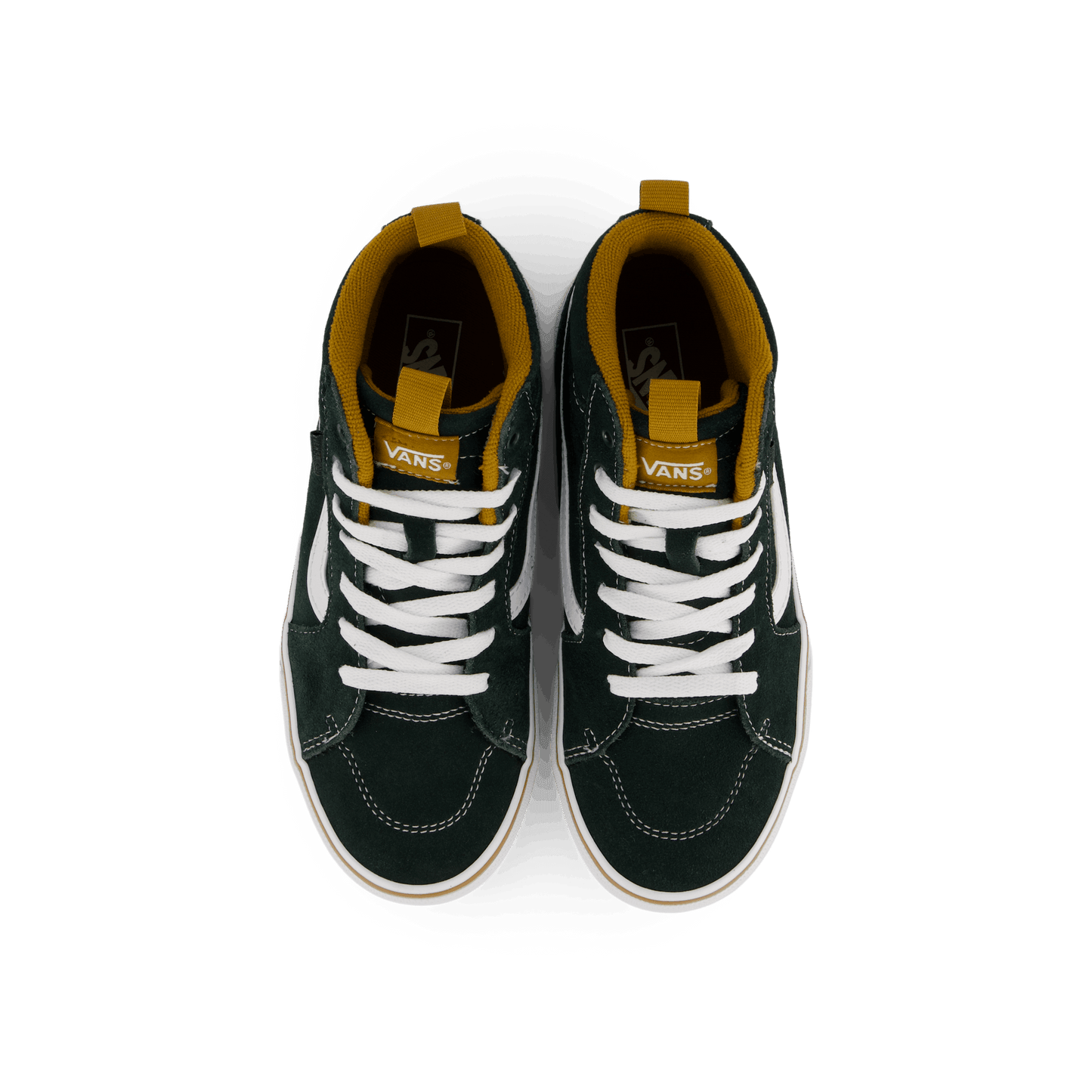 Elevate your style with Vans' Yt Filmore Hi Vansguard Suede in Dark Forest. This high-top sneaker features a weather-resistant suede upper in deep green, complemented by the iconic white side stripe. With white laces, stitching details, and a mustard yellow ankle lining, it offers a classic skate-inspired look with modern functionality. The white sole with gum rubber edge completes this sleek, sporty silhouette.