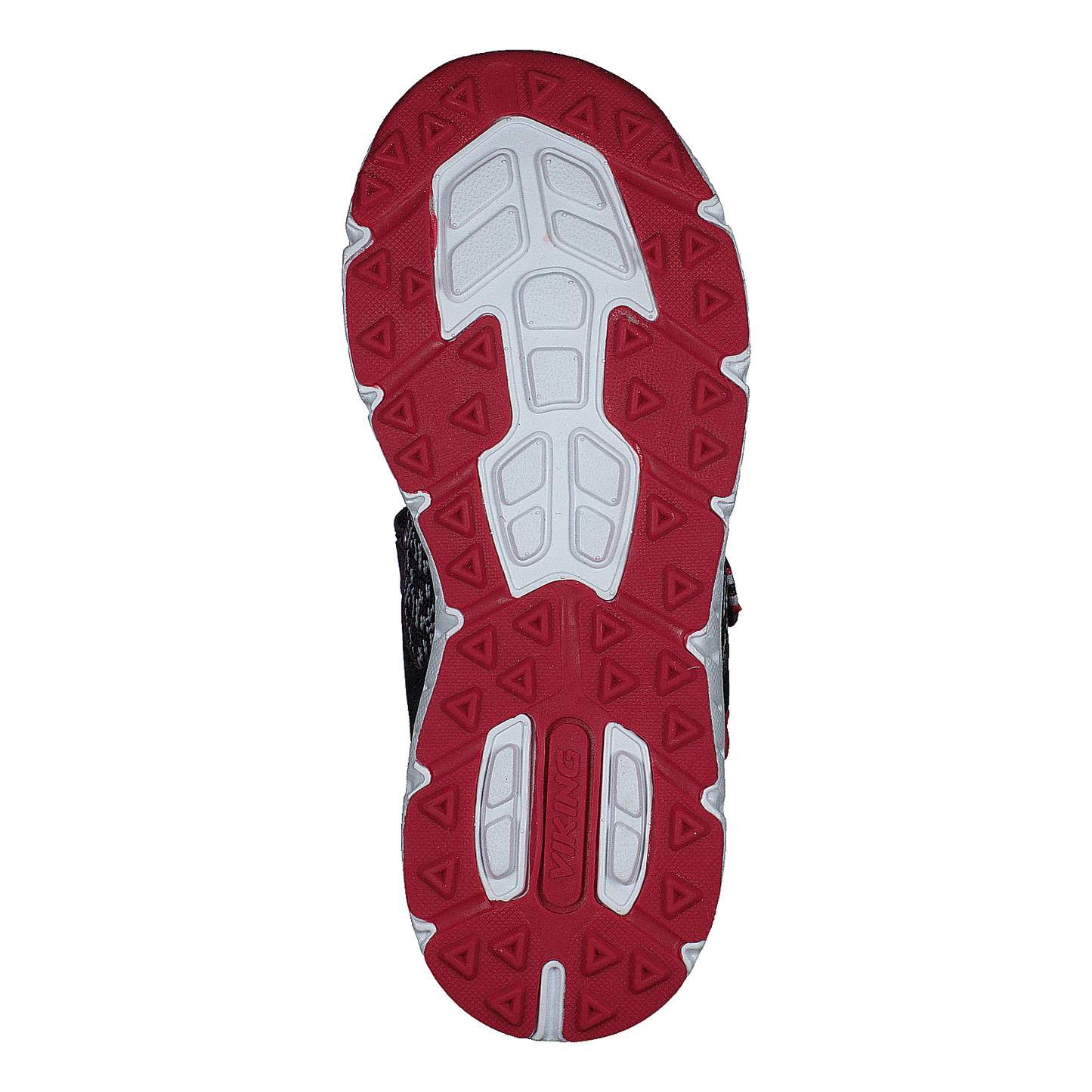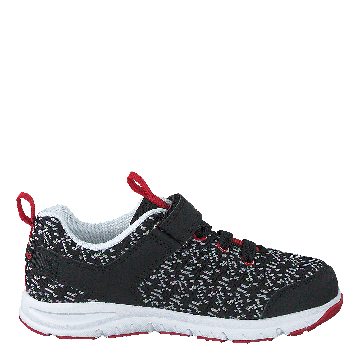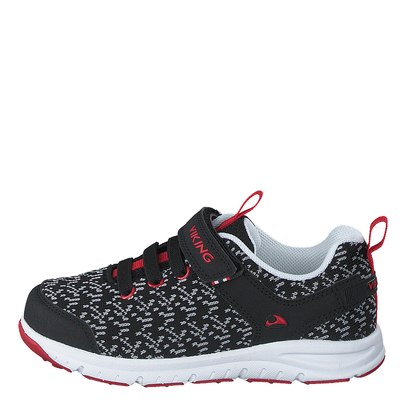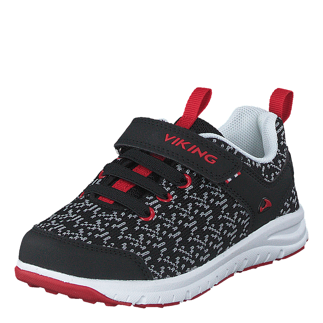 The Veil Black/red children's athletic shoe by Viking combines style and functionality. Featuring a breathable black mesh upper with speckled white pattern, red accents, and a secure velcro strap, these shoes offer comfort and a modern look. The white cushioned sole provides support for active kids, while the elastic laces and pull loop ensure easy wear.