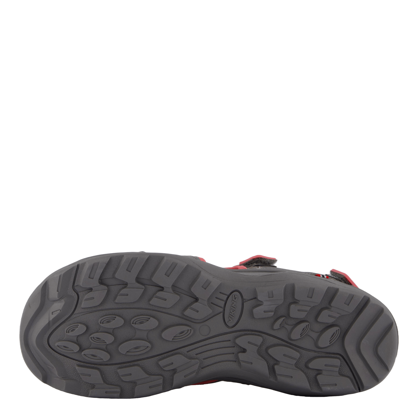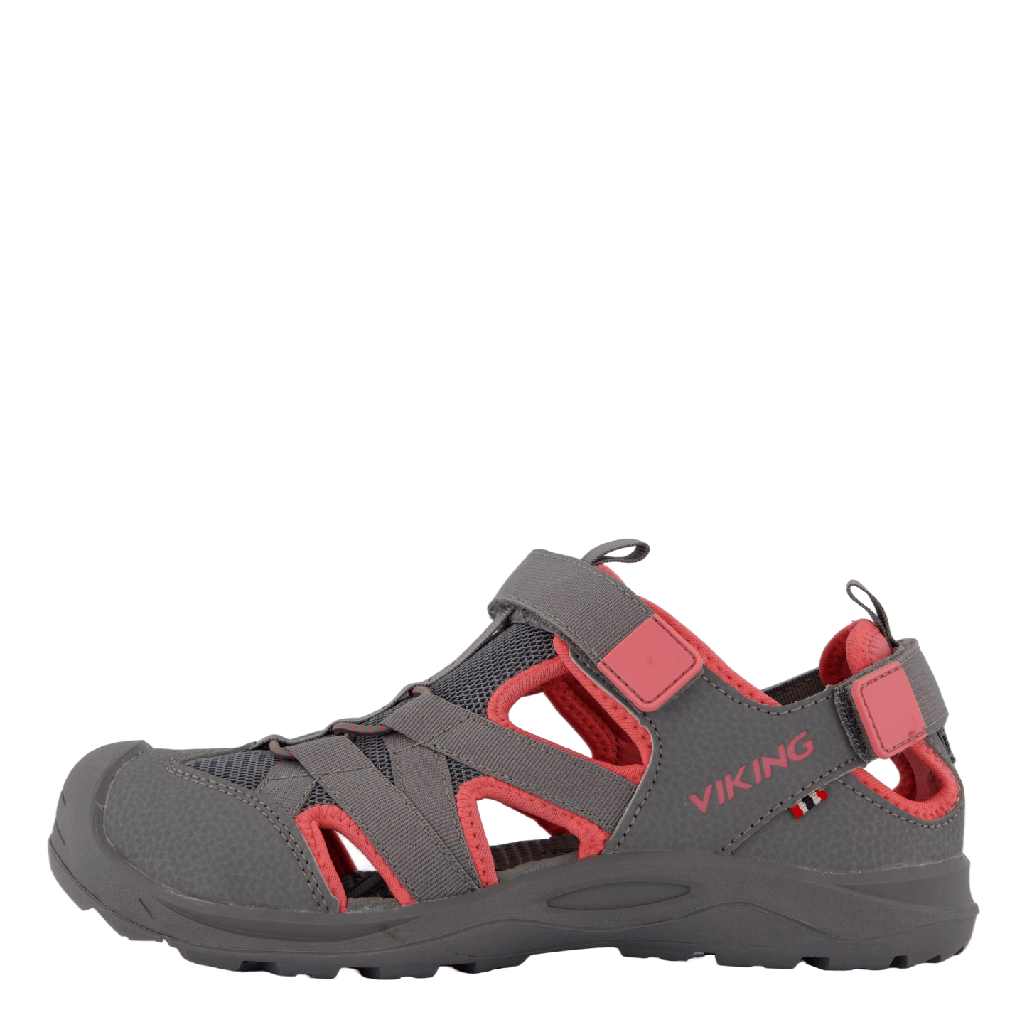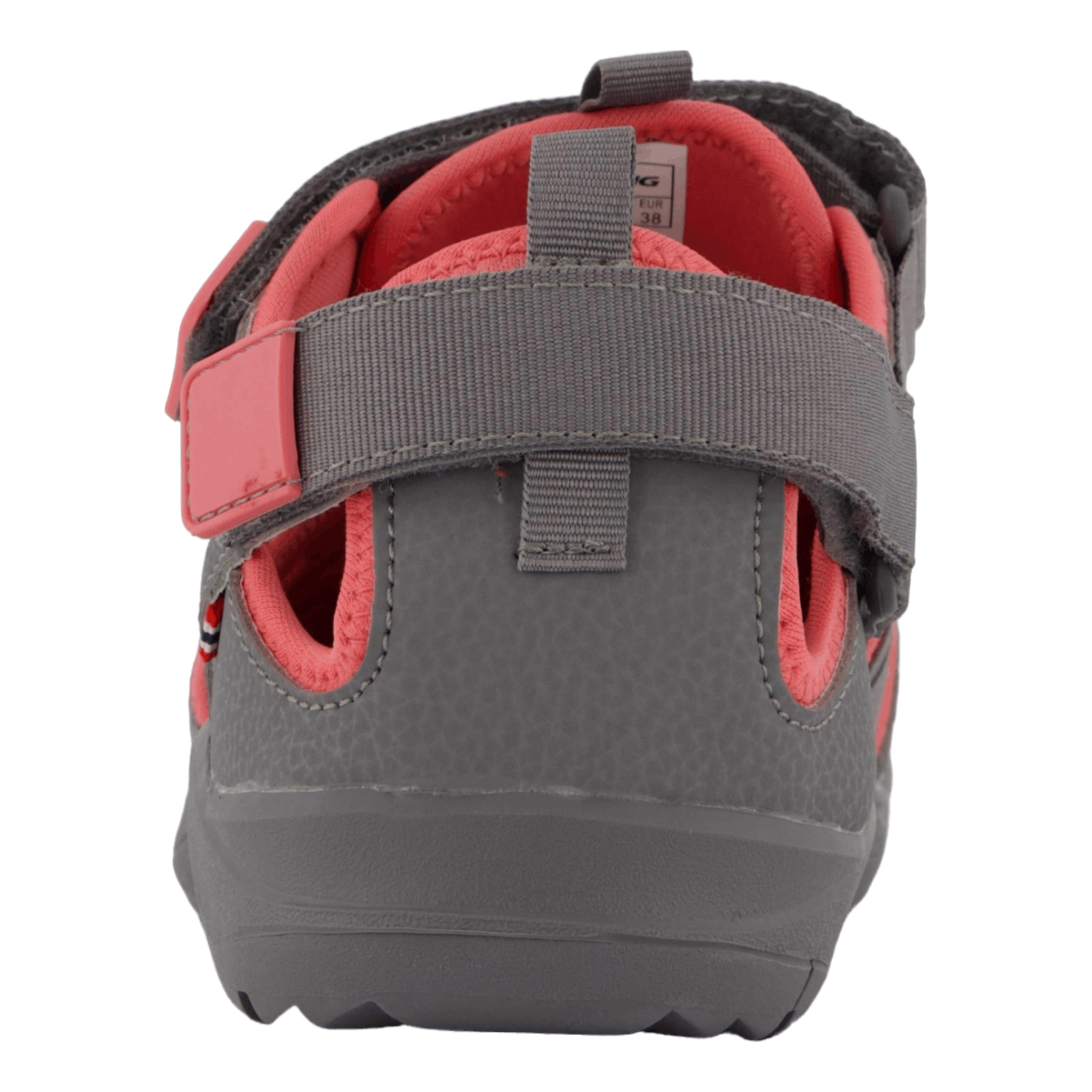 Viking's Adventure Sandal 2v in pearlgrey/pink combines style and functionality for outdoor enthusiasts. This sporty sandal features a protective closed-toe design, breathable mesh and synthetic upper, and adjustable velcro straps for a custom fit. With its sturdy, textured sole for excellent grip and multiple ventilation cutouts, it's ideal for active use on various terrains.