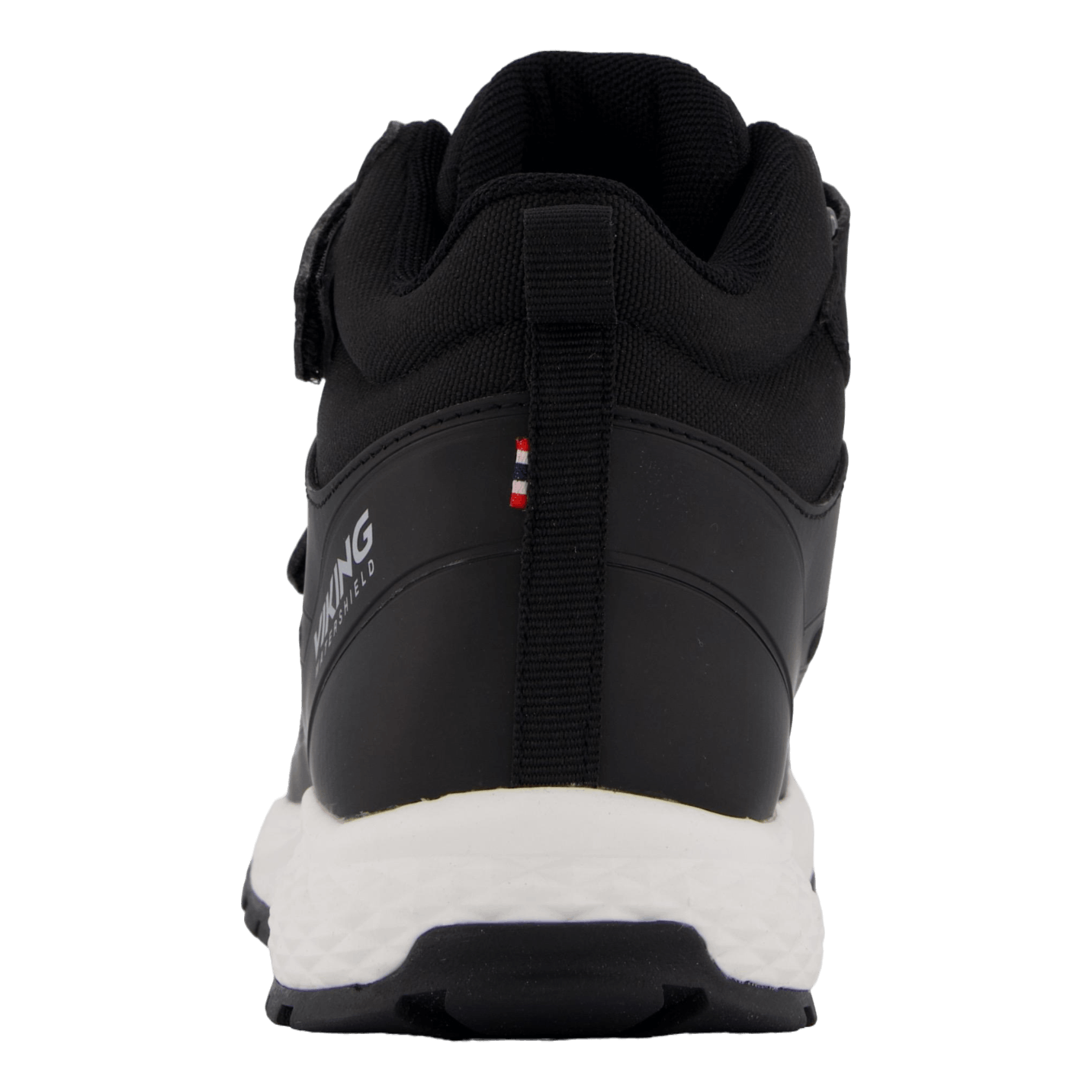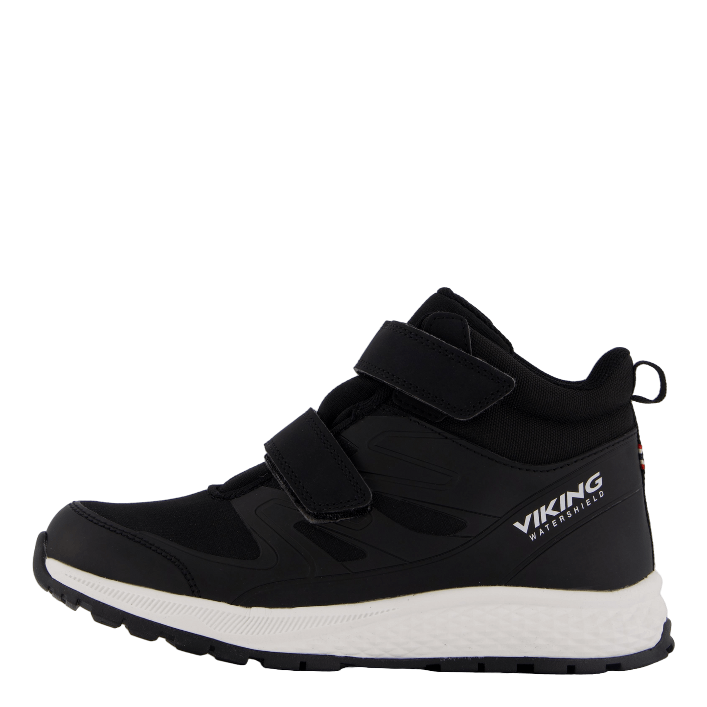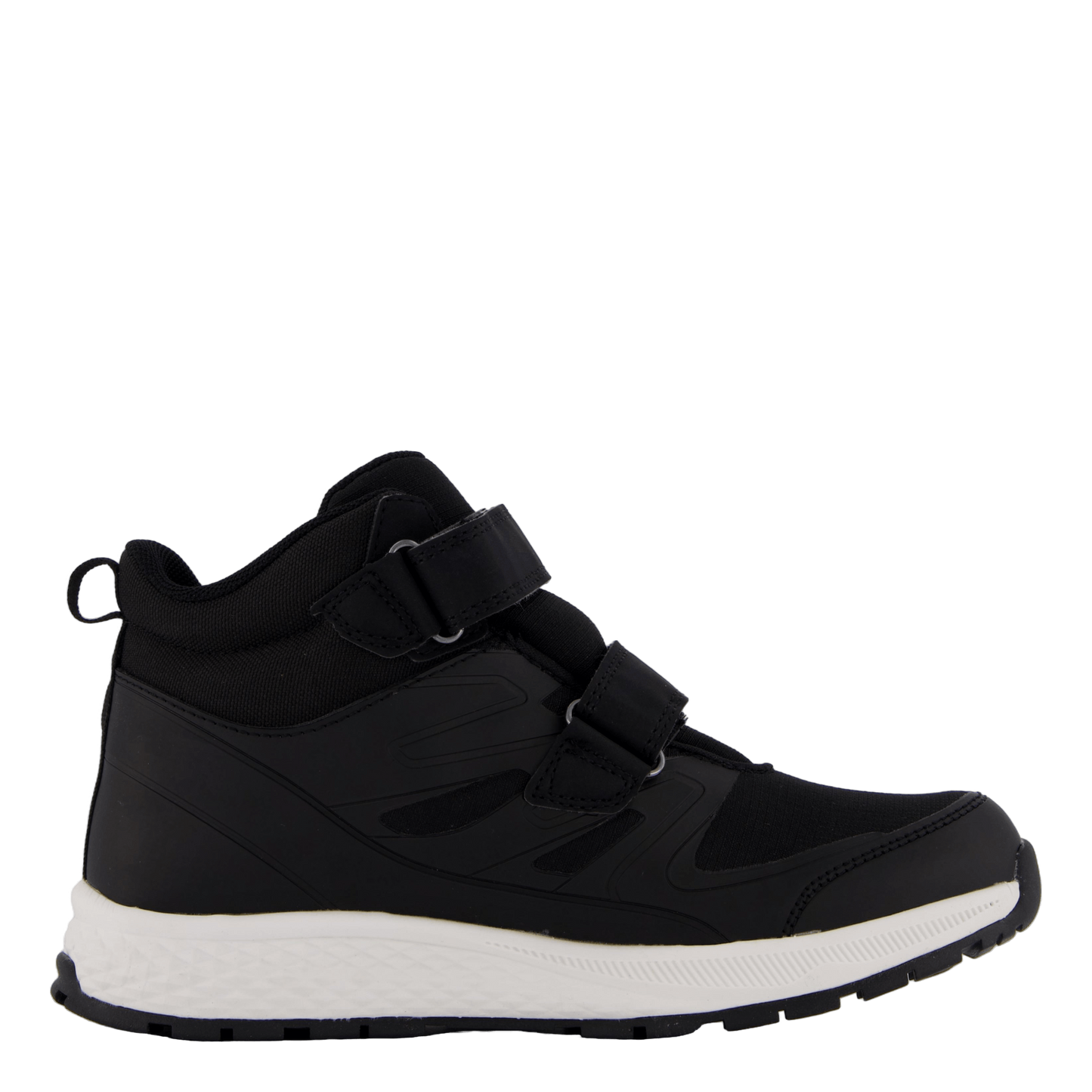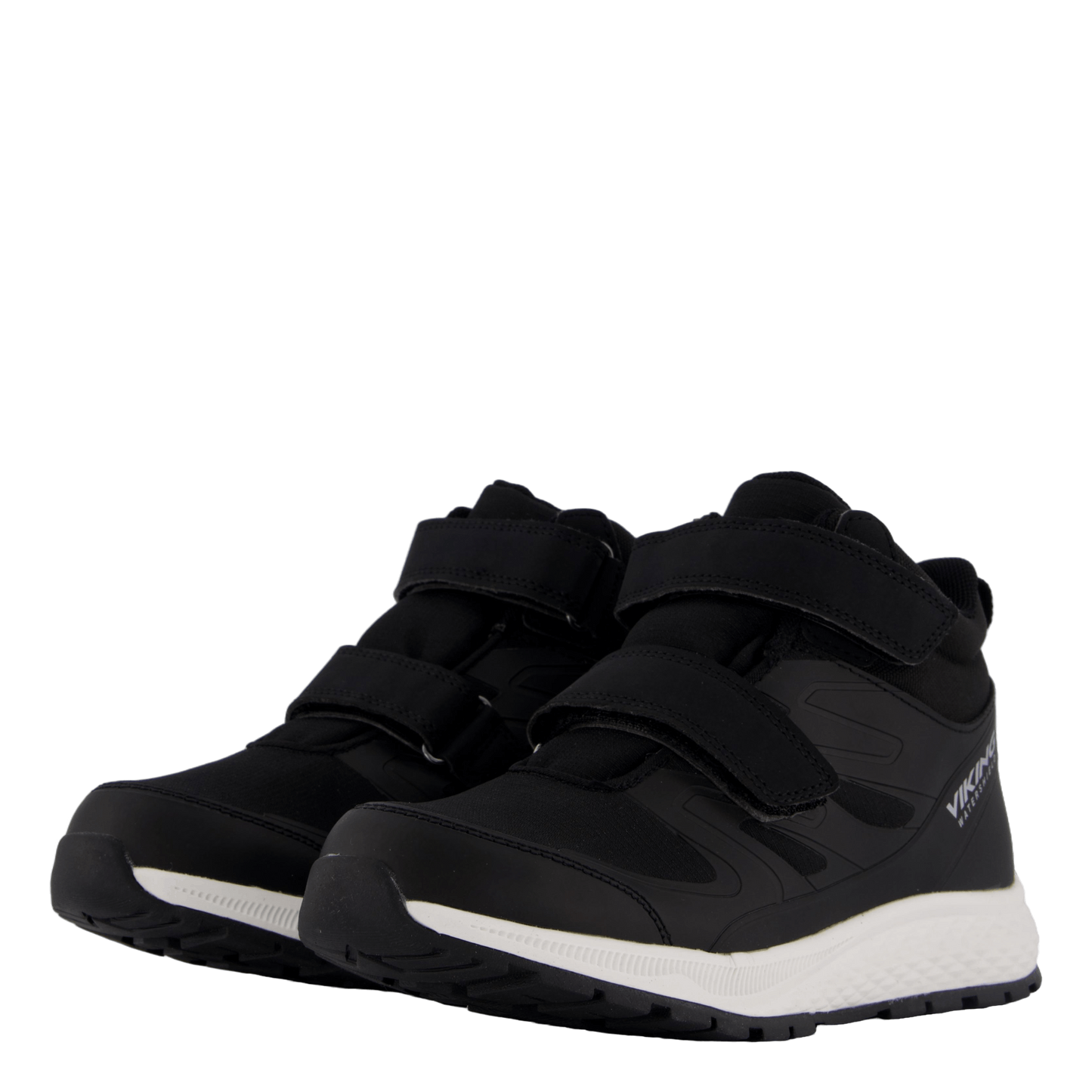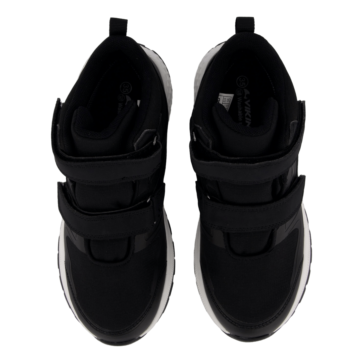 The Equip Mid Wp 2v Black by Viking is a versatile mid-top athletic shoe designed for comfort and functionality. Featuring two velcro straps for easy adjustment, a padded ankle collar, and a breathable synthetic and mesh upper, this waterproof shoe offers both style and practicality. The thick white rubber sole provides excellent traction and cushioning, making it suitable for various outdoor activities or casual wear.
