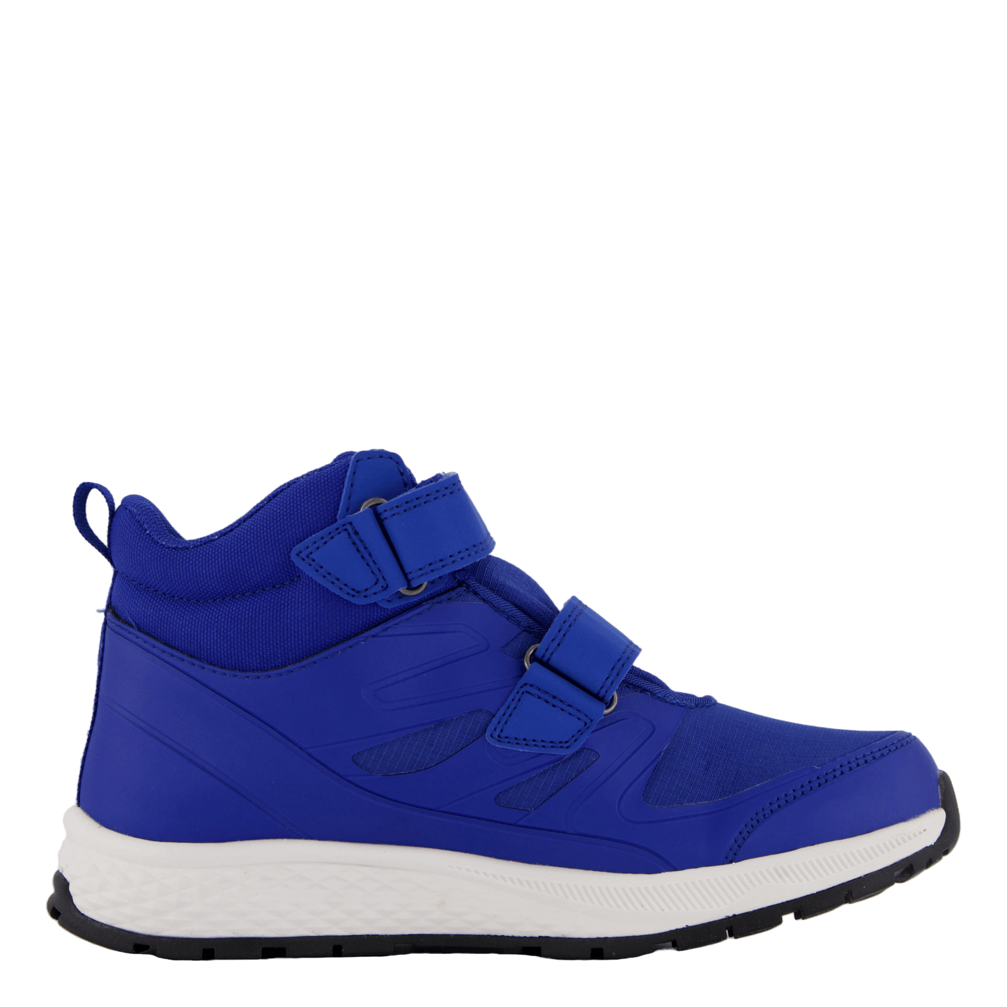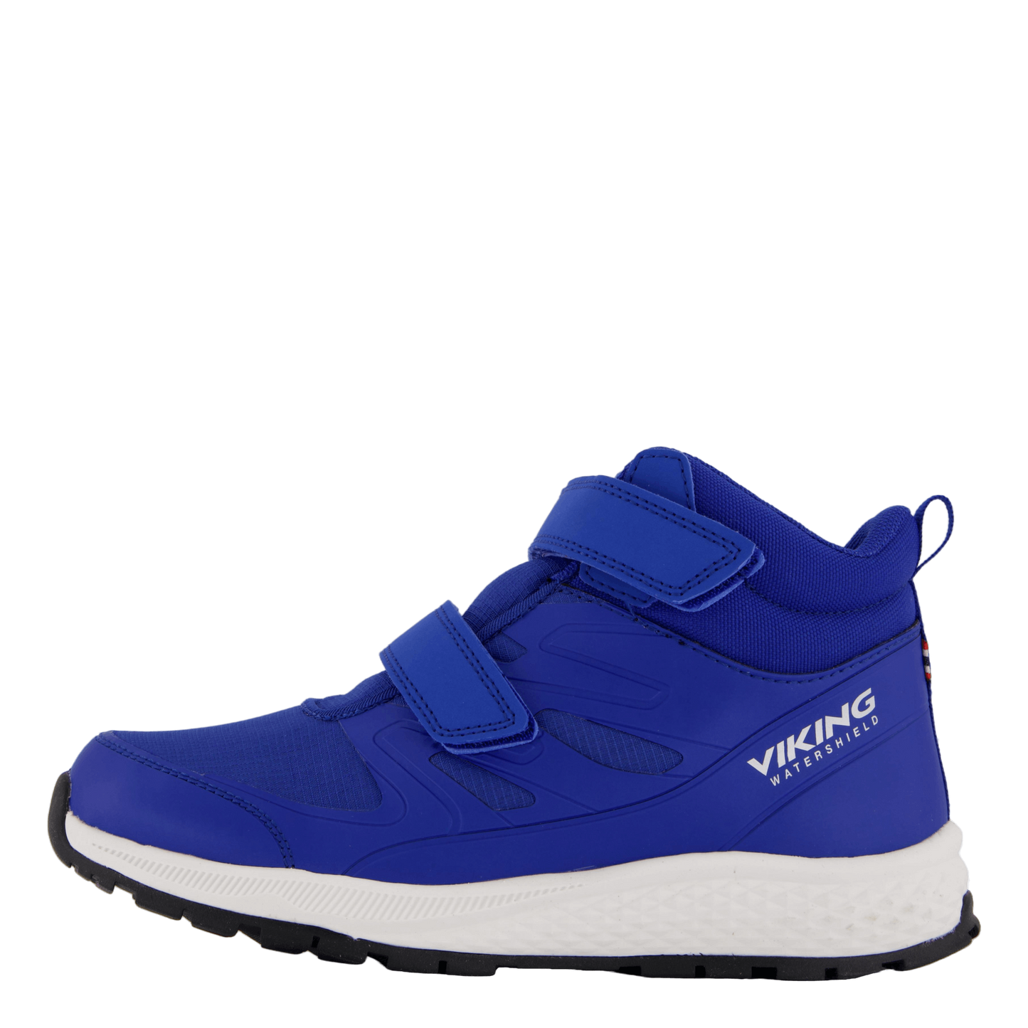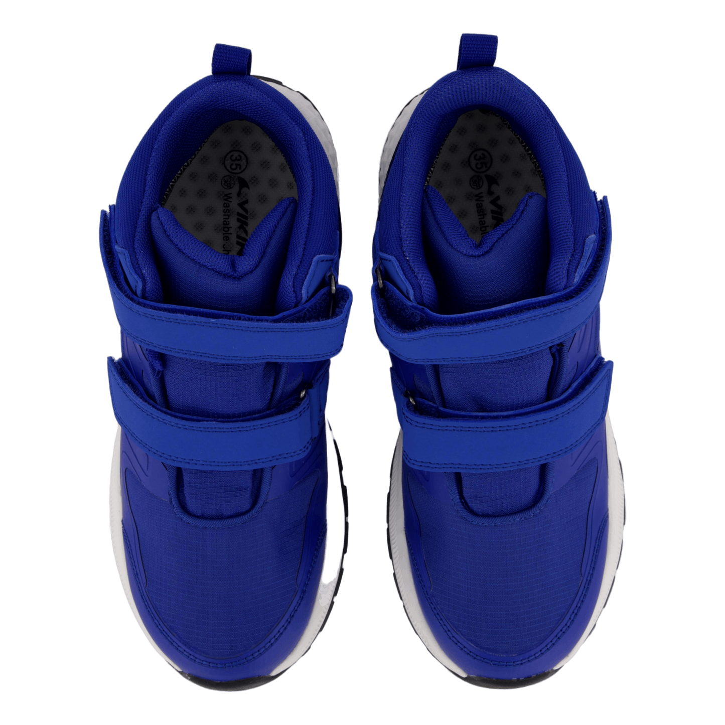 Viking's Equip Mid Wp 2v Blue is a children's athletic shoe designed for active lifestyles. This mid-top sneaker features a vibrant royal blue upper with breathable mesh and synthetic materials. Two wide velcro straps offer easy fastening, while the padded collar provides ankle support. With WATERSHIELD technology, these shoes are water-resistant, making them ideal for outdoor adventures.