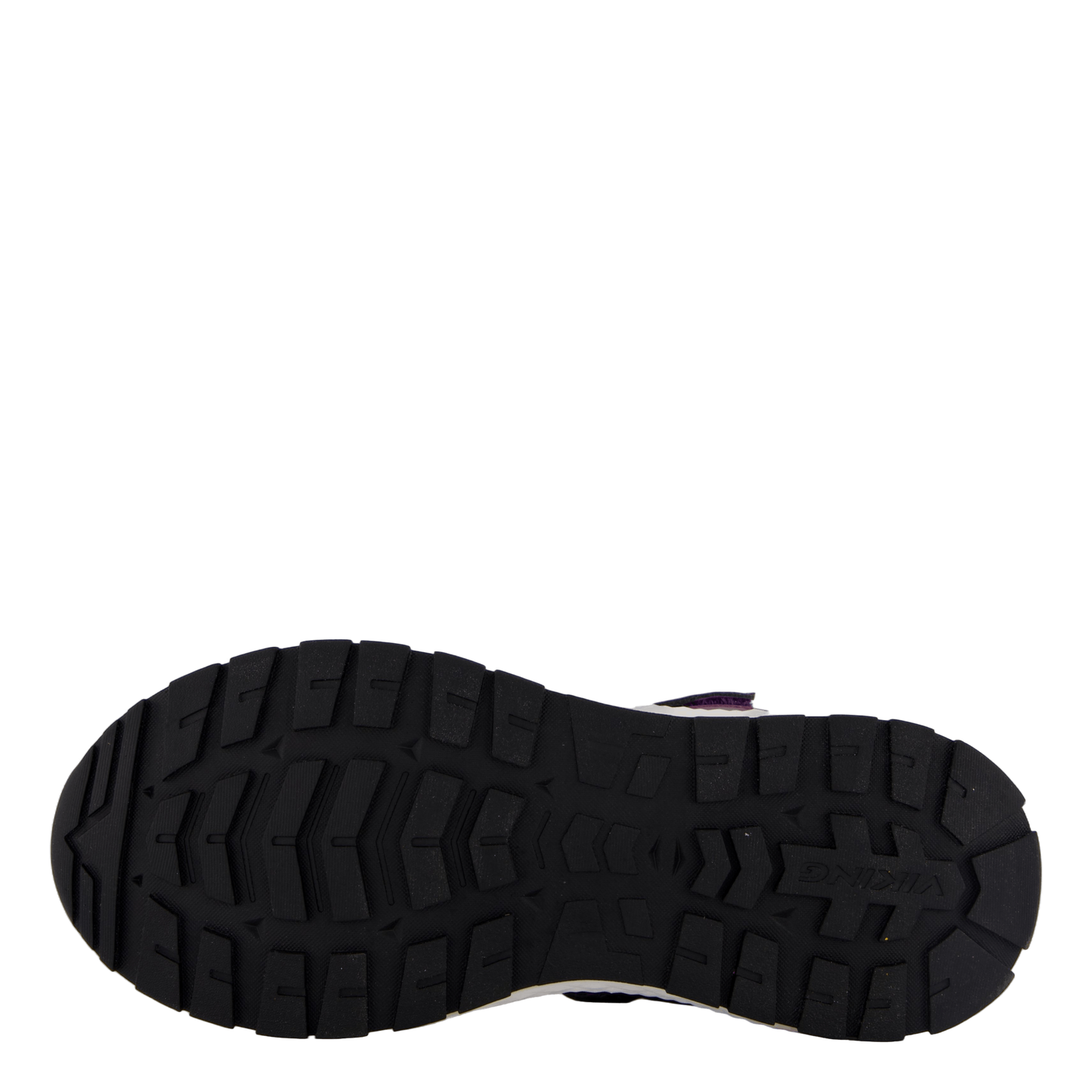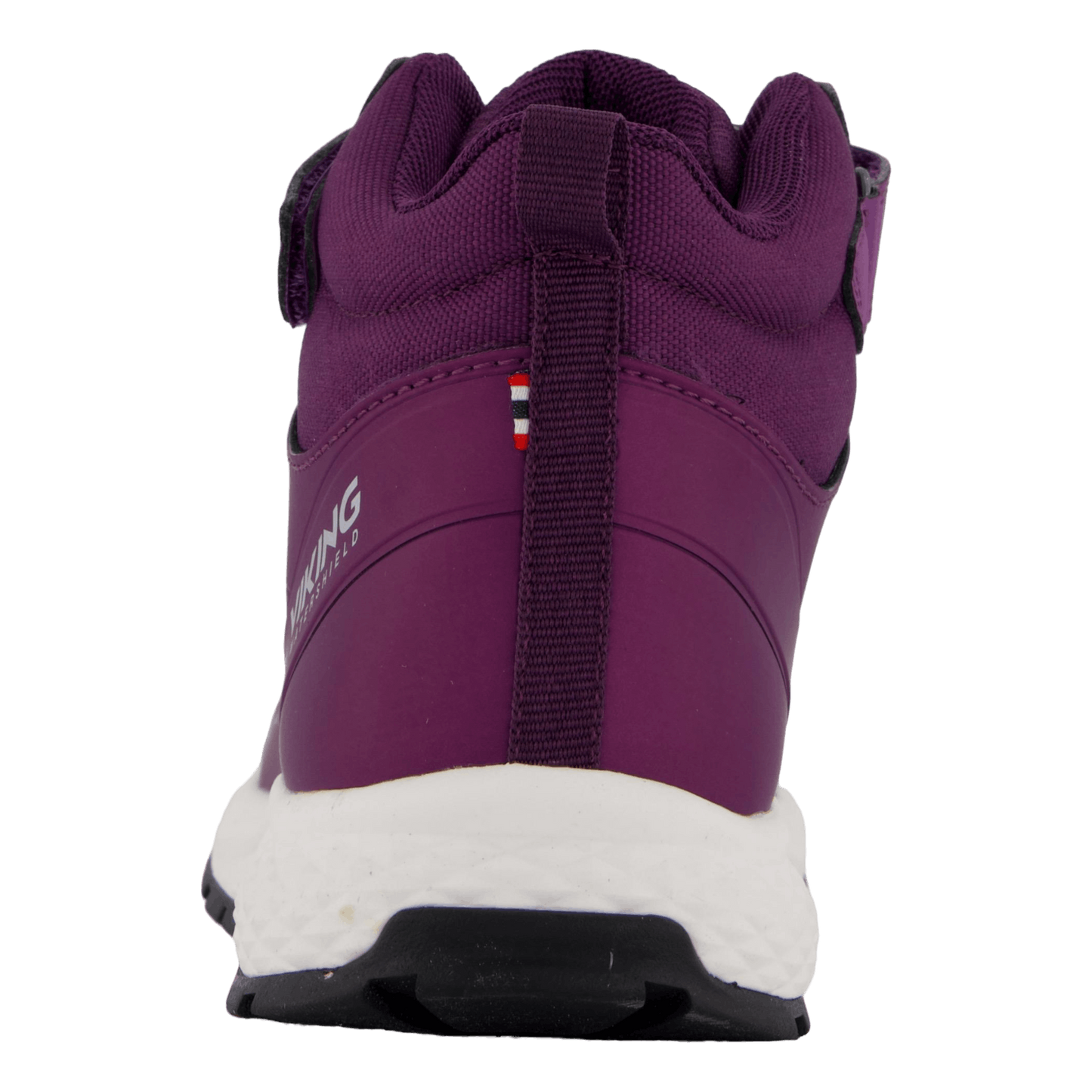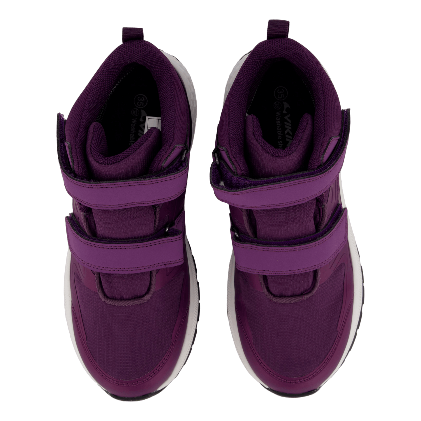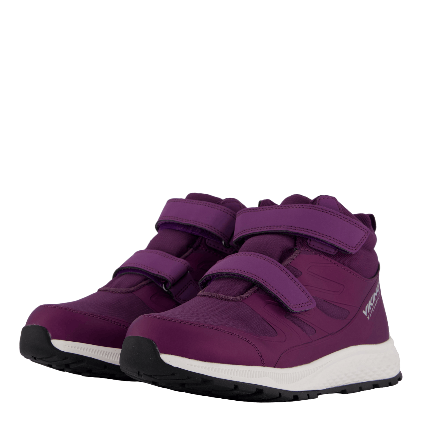 Viking's Equip Mid Wp 2v Purple is a stylish and functional children's athletic shoe. This mid-top sneaker features a vibrant purple upper with breathable mesh and durable synthetic materials. Two velcro straps ensure easy fastening, while the padded collar provides ankle support. The white rubber sole offers excellent traction, making it ideal for outdoor activities. Water-resistant properties and a sporty design make this shoe perfect for active kids.