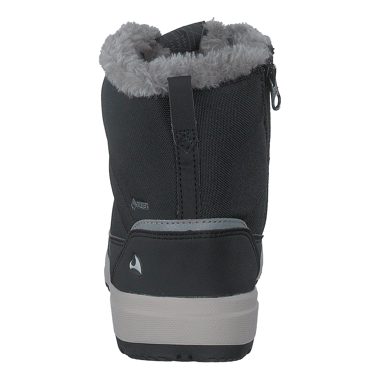 The Montebello Gtx Black by Viking is a durable winter boot designed for kids. Featuring a waterproof Gore-Tex membrane, warm insulative liner, and easy-access zipper, it ensures comfort in cold conditions. The black boot boasts a fur-like lining, reinforced toe and heel, and a chunky, grippy sole for stability. Machine washable and stylish, it's perfect for urban winter wear.