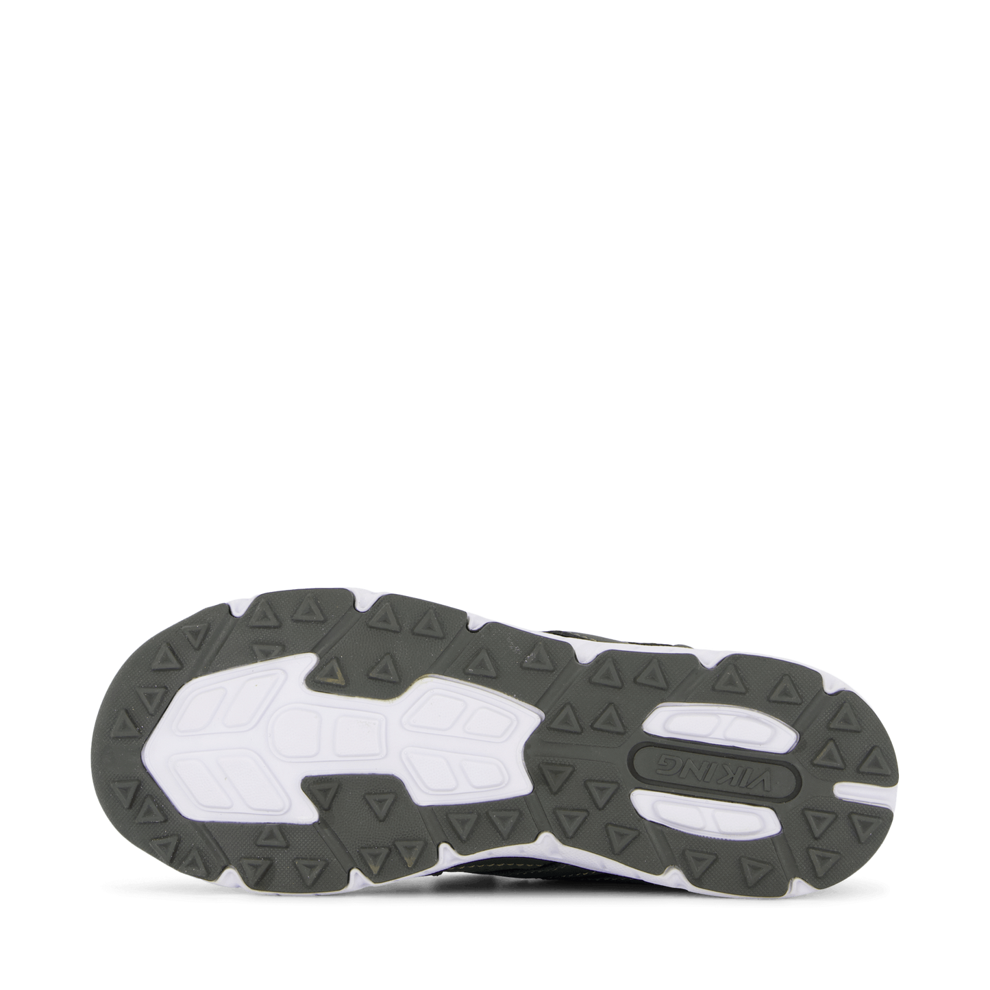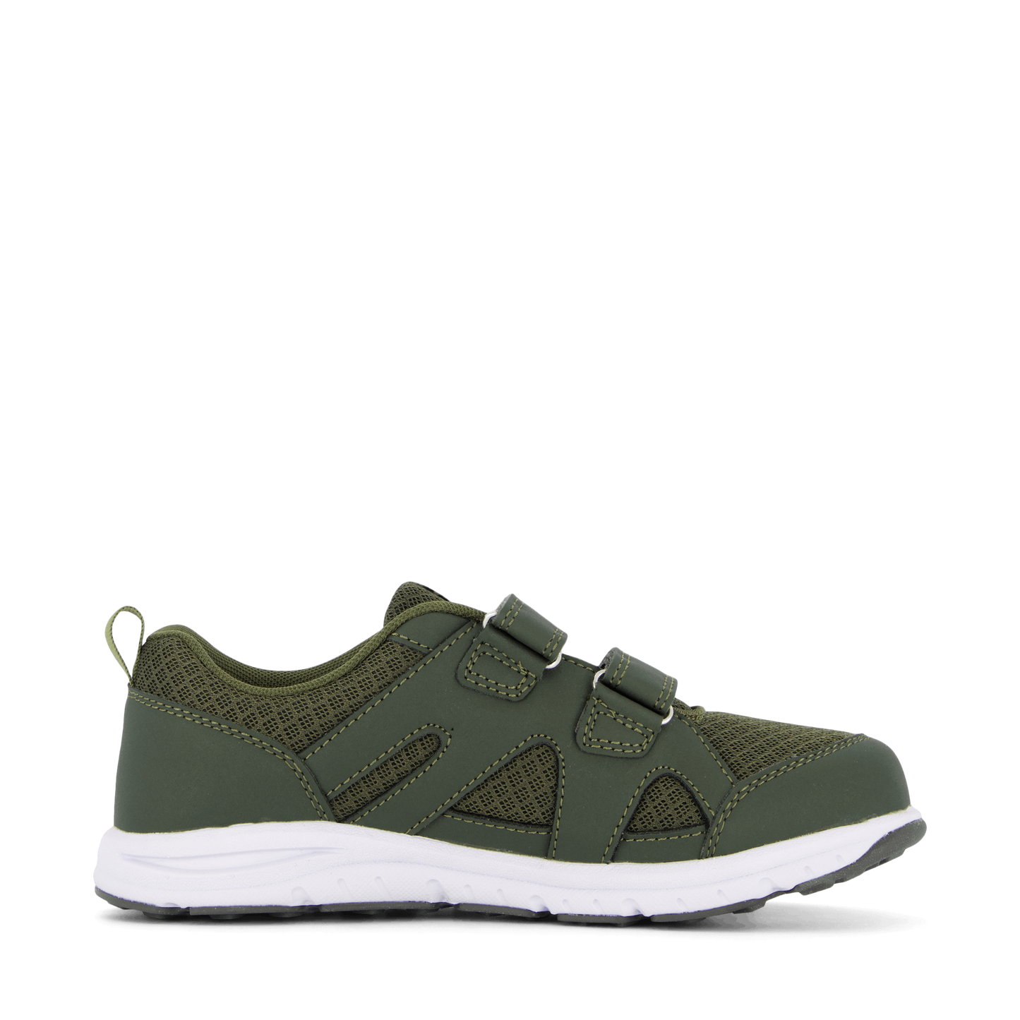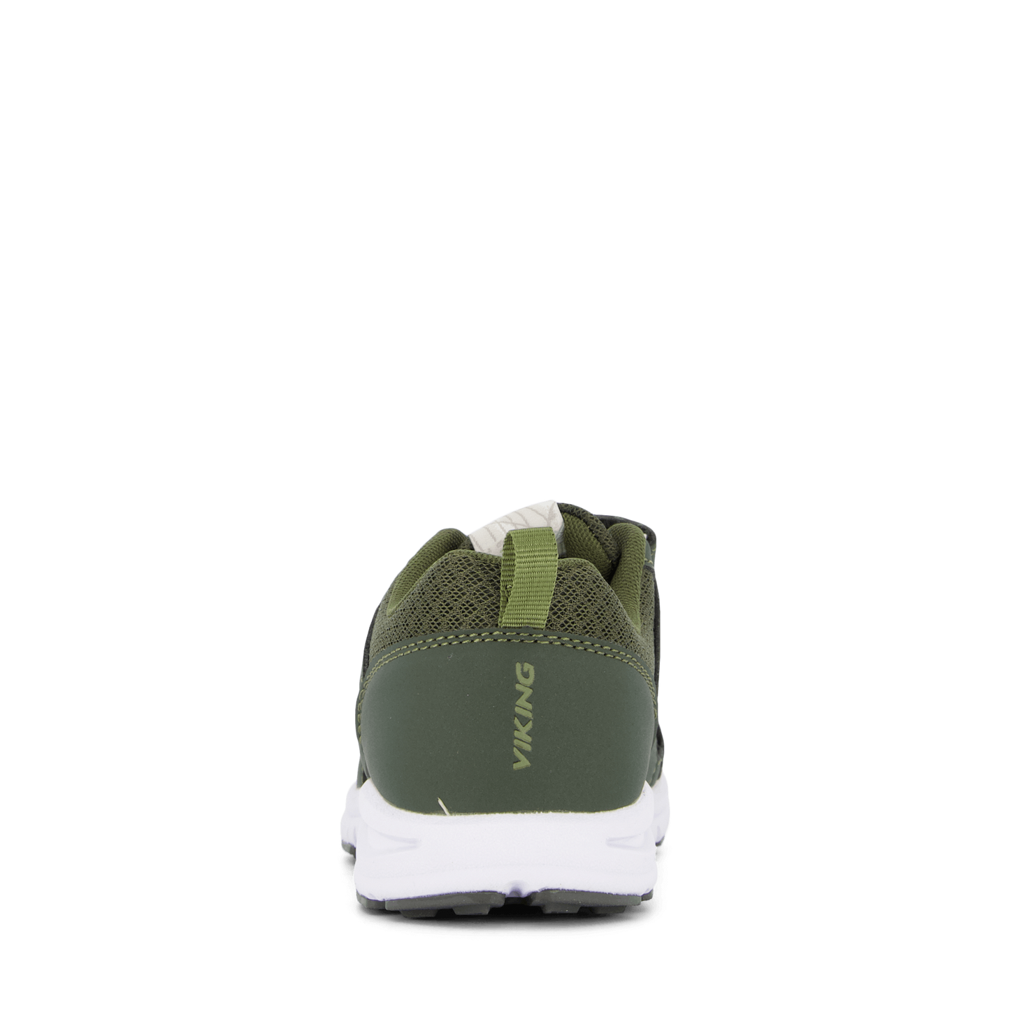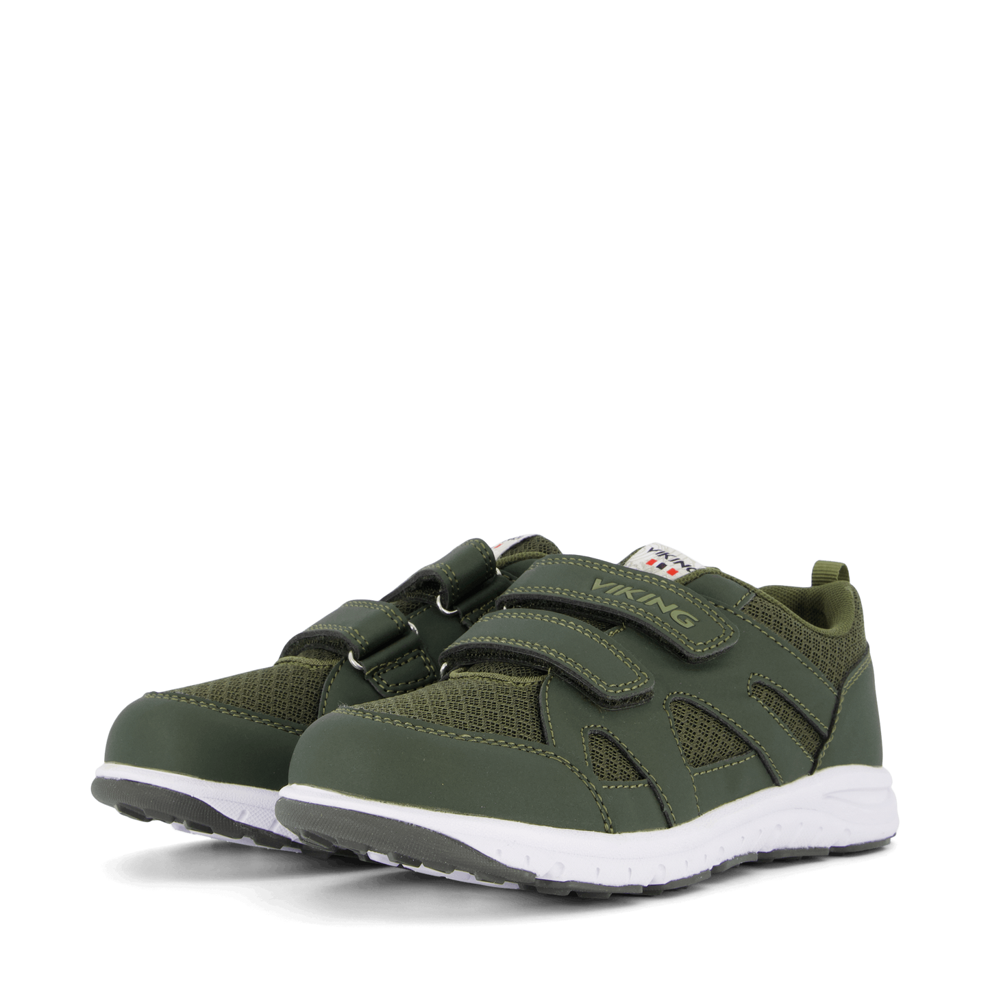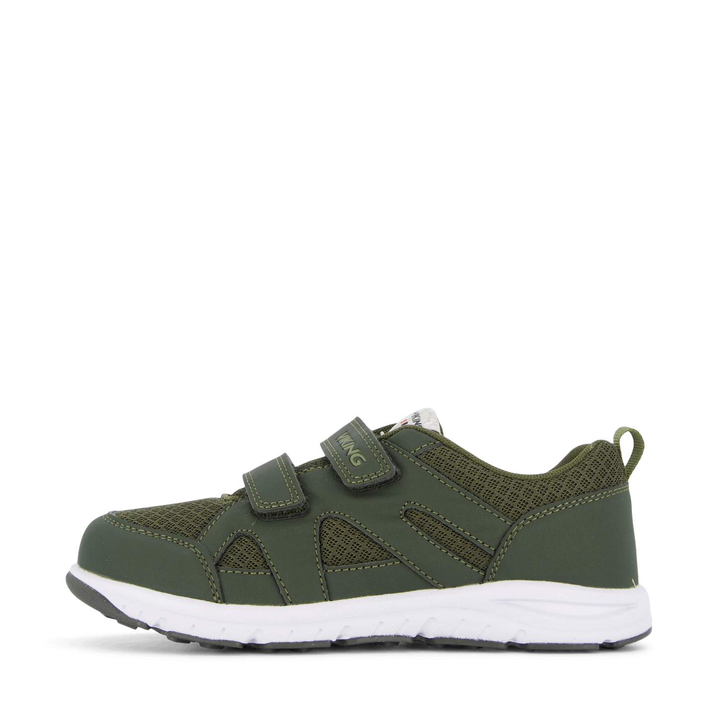 Viking's Odda 2v Huntinggreen/khaki children's athletic shoe combines style and functionality. Featuring a sleek dark green upper with mesh and synthetic leather-like materials, this low-top design offers comfort and breathability. Two Velcro straps ensure easy fastening, while the padded collar provides ankle support. The contrasting white sole complements the modern aesthetic, making it ideal for casual wear or light athletic activities.