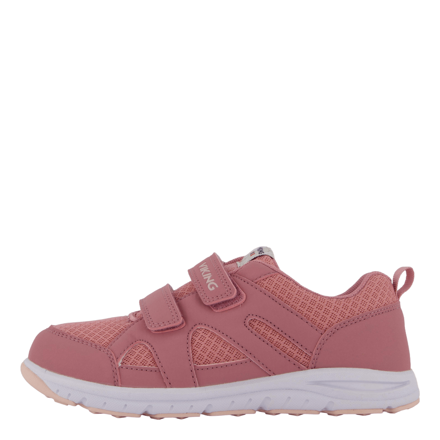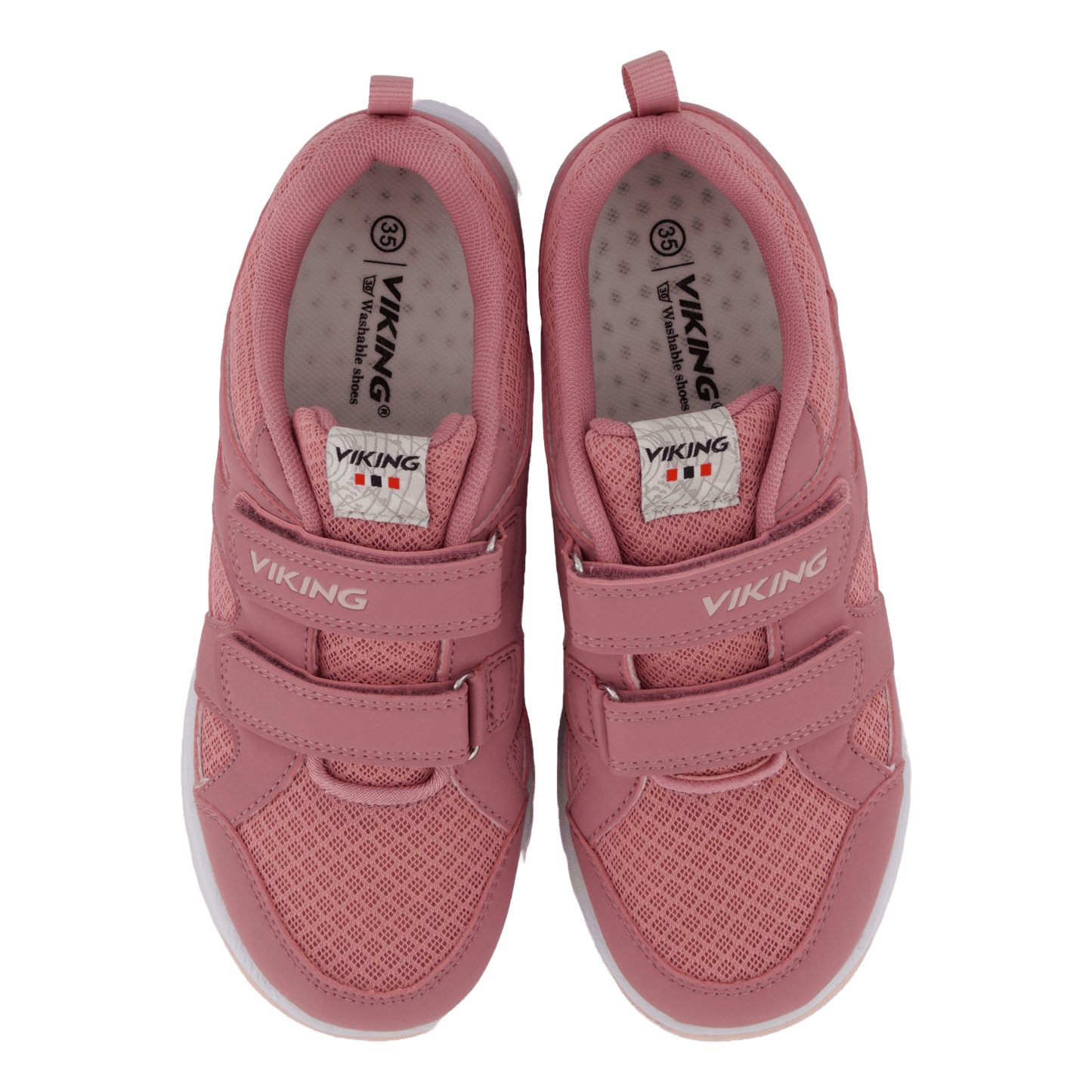 Viking's Odda Low children's athletic shoe in antique rose/light pink combines style and functionality. Featuring a low-top design with two velcro straps for easy fastening, this shoe is perfect for active kids. The breathable mesh and synthetic leather upper, coupled with reinforced toe and heel areas, offer comfort and durability. Its sporty, modern aesthetic makes it ideal for everyday wear.