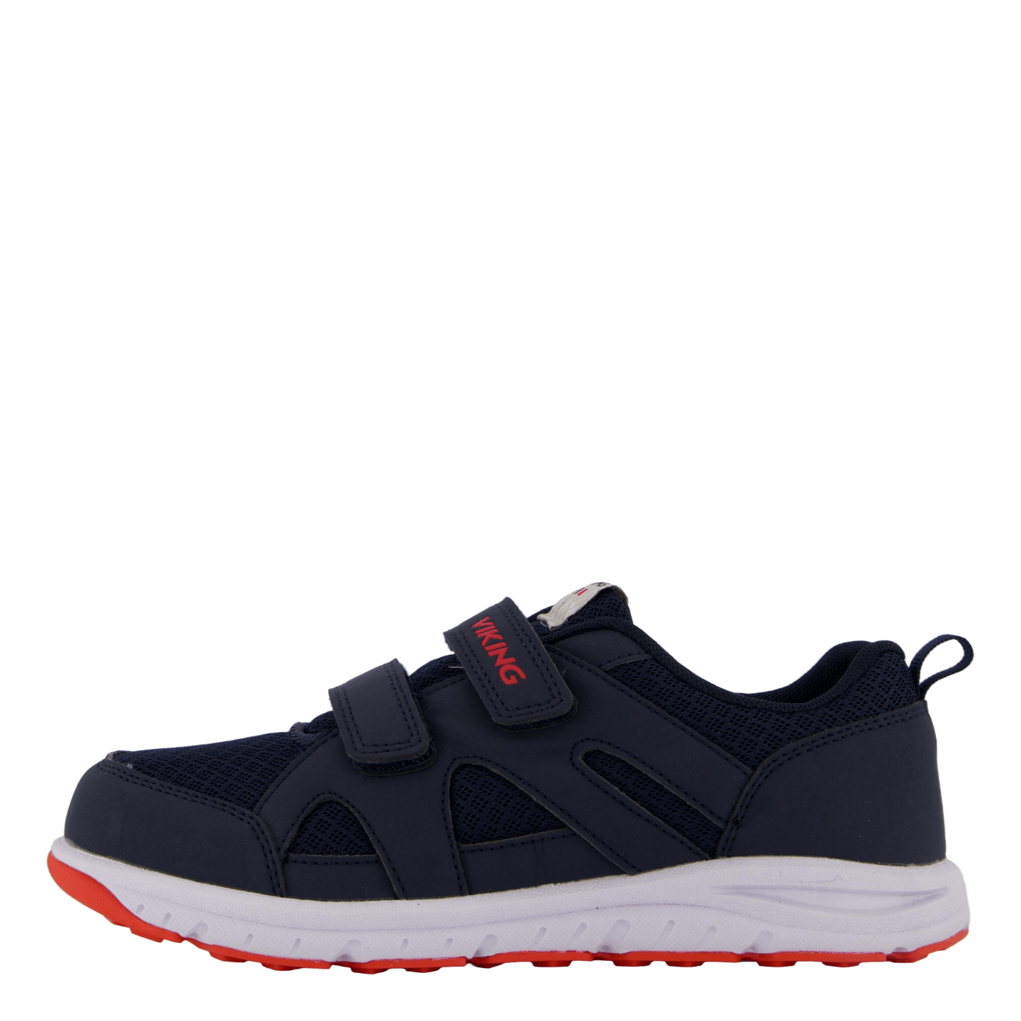 Viking's Odda Low Navy/red children's athletic shoe combines style and functionality. Featuring a navy blue mesh and synthetic upper with red accents, this low-top sneaker offers breathability and support. Two velcro straps ensure easy adjustment and secure fit, while the chunky white midsole and red outsole provide comfort and traction for active kids.