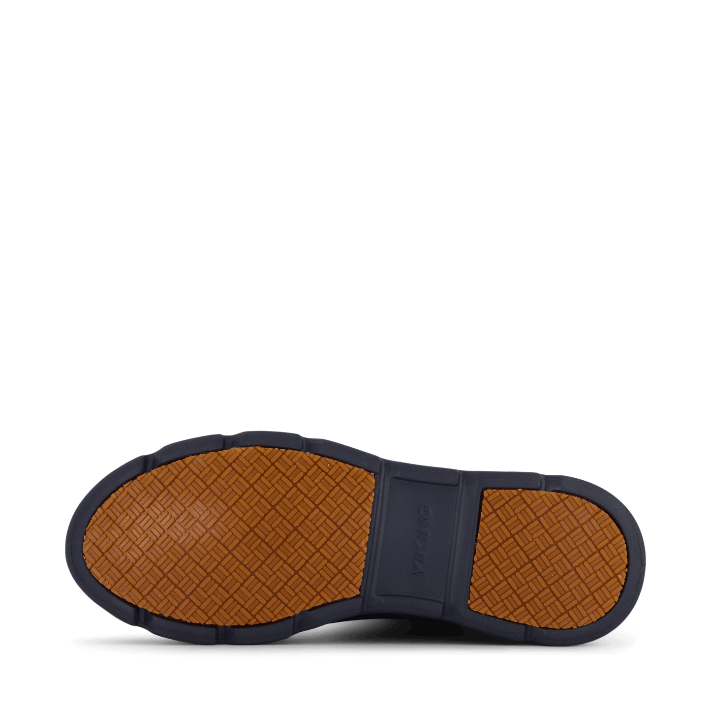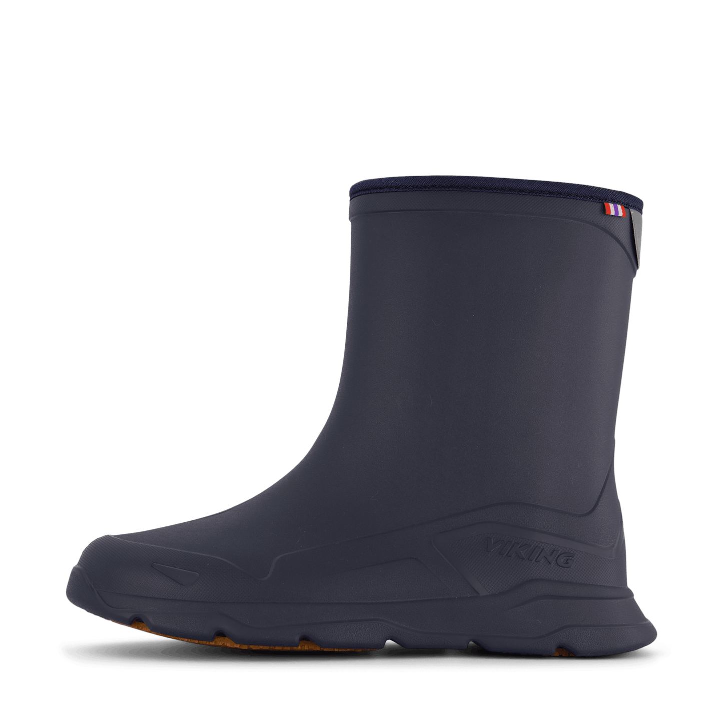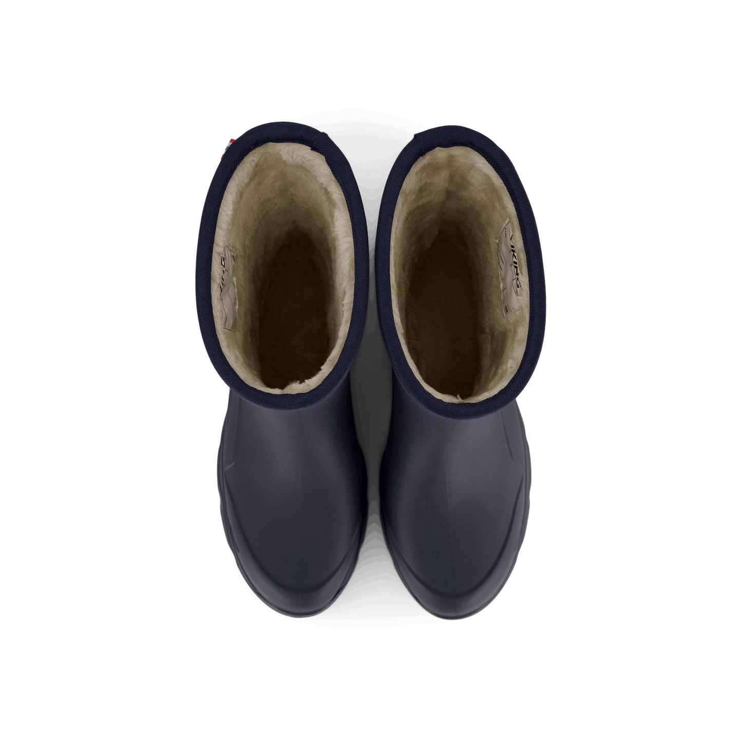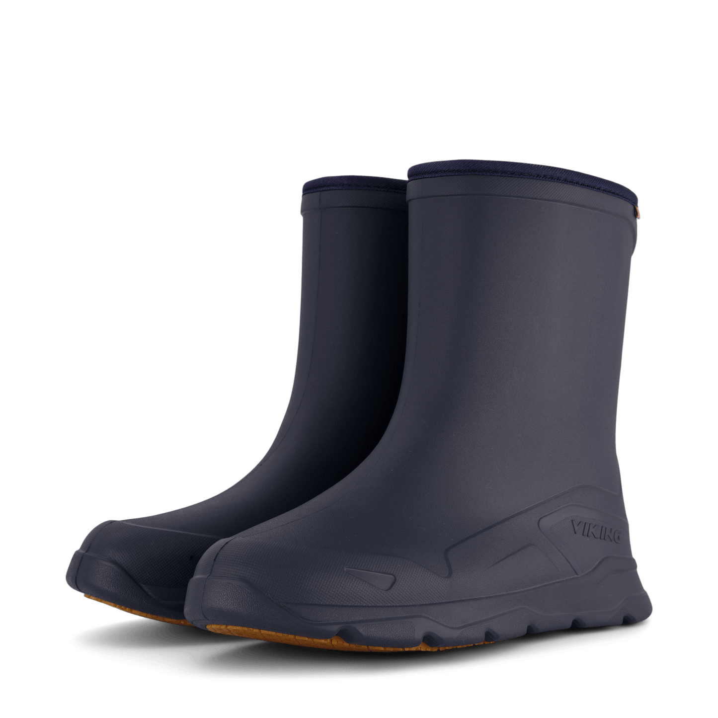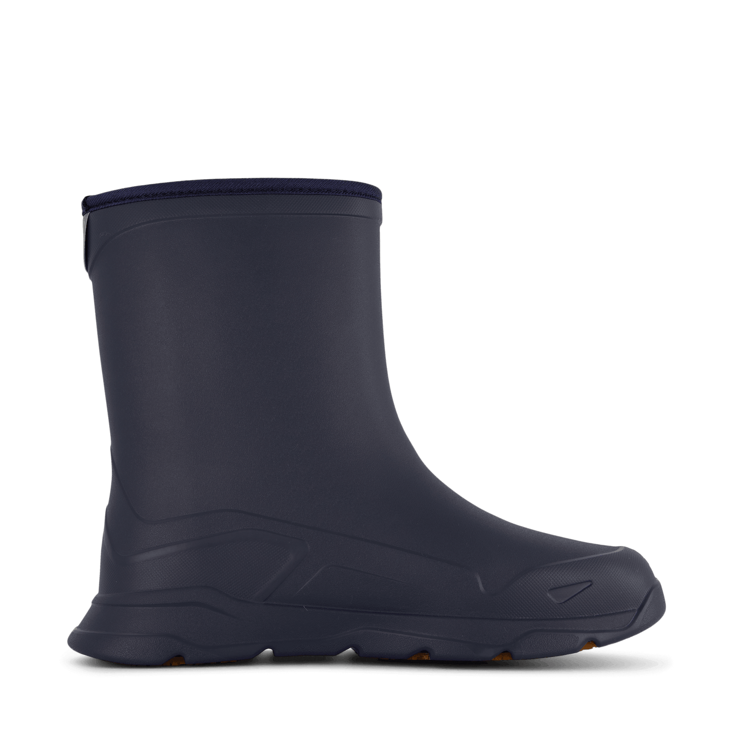 Playrox Navy boots offer ultra-lightweight comfort for kids, featuring natural insulation and warmth. Made from EVA with integrated rubber soles, these navy blue waterproof boots provide superior traction and flexibility. The streamlined design includes a matte finish, rounded toe, and a fabric-trimmed top edge for added comfort. Perfect for wet weather, these mid-calf boots combine practicality with a minimalist style.