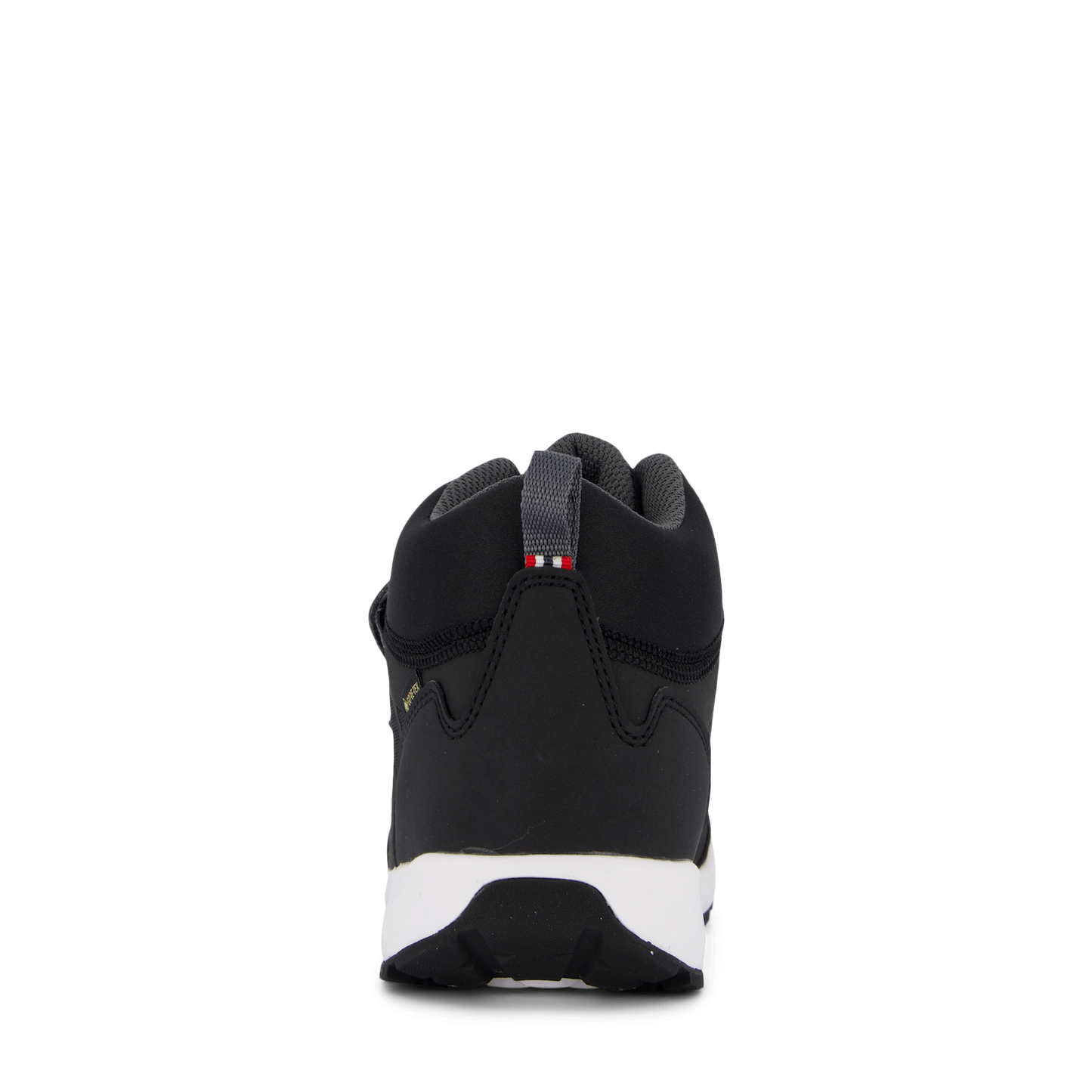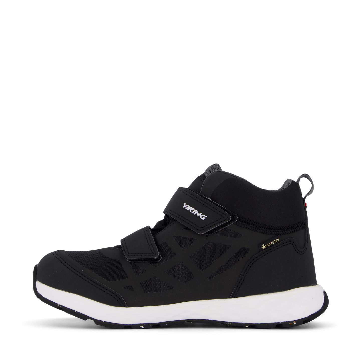 Viking's Veme Reflex Mid GTX 2V offers a lightweight, sustainable upgrade to their best-seller. This black mid-top shoe features a waterproof GORE-TEX membrane, reflective webbing for visibility, and a grippy rubber outsole with reinforcements. With two velcro straps for easy adjustment, it combines durability, sustainability, and convenience for young explorers.