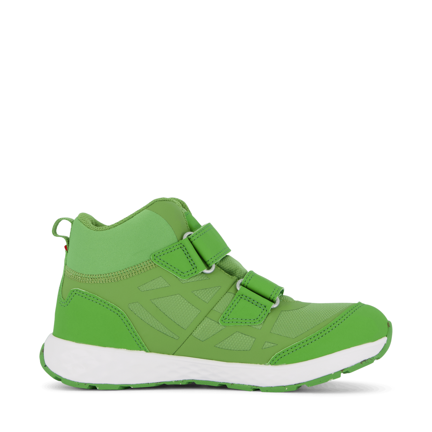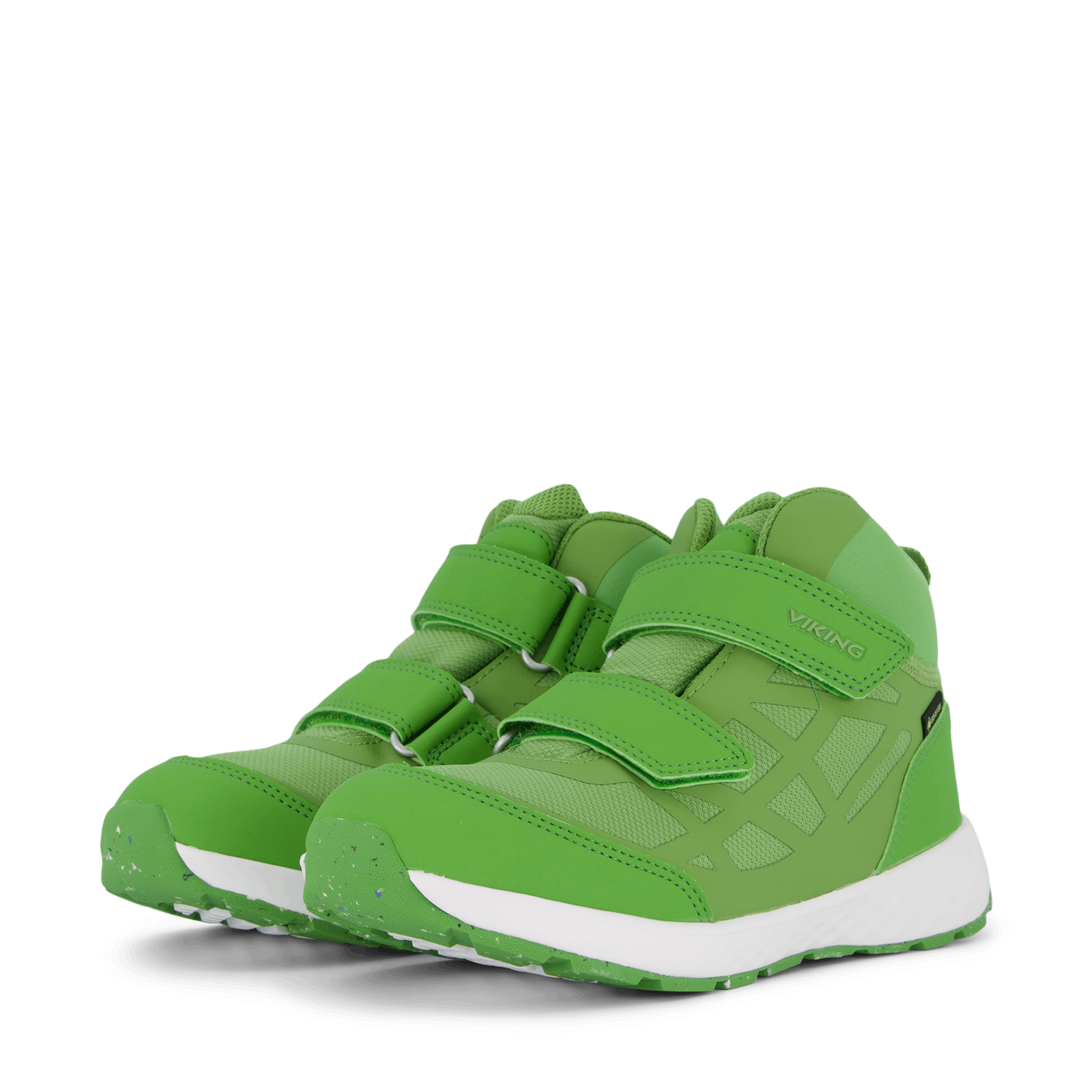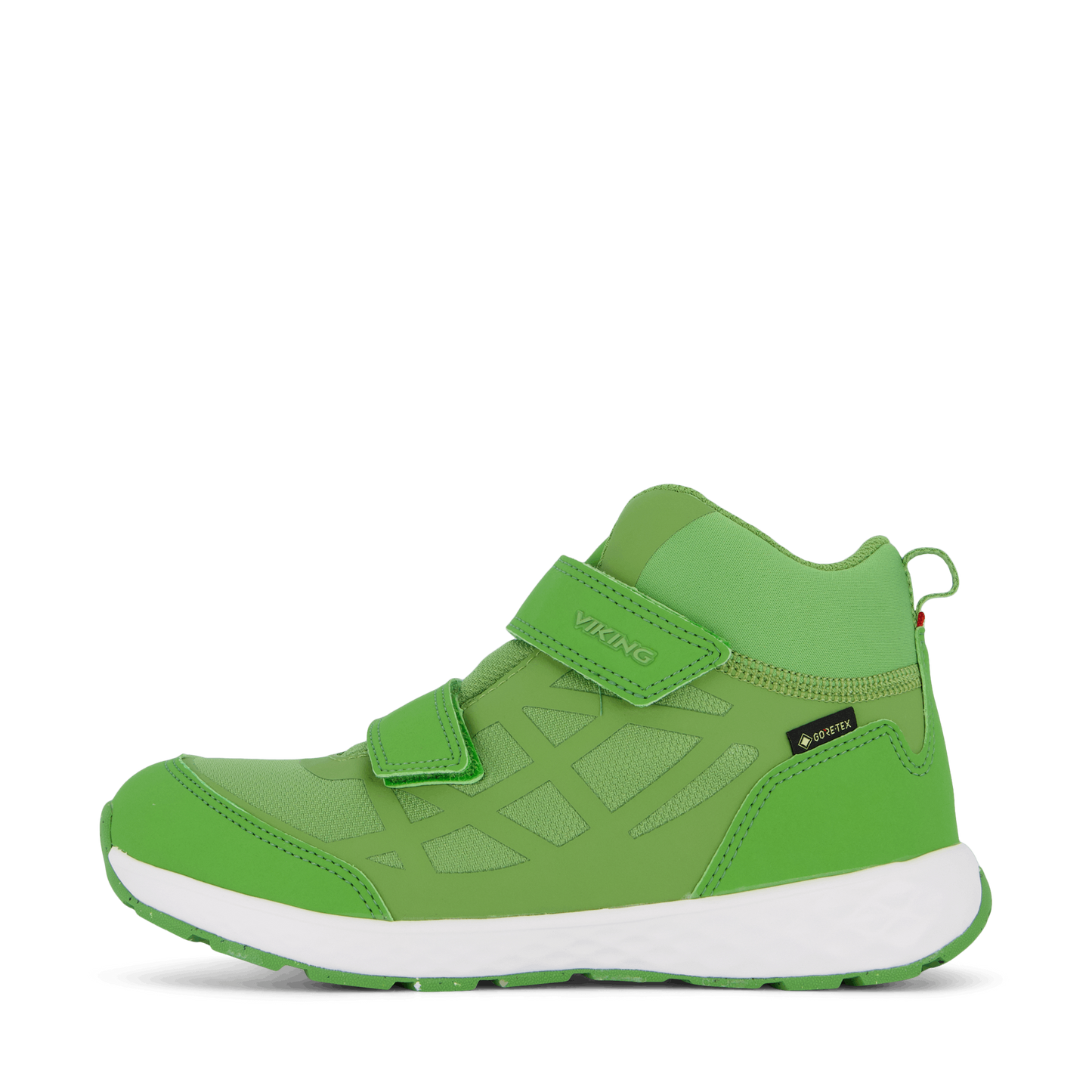 Viking's Veme Reflex Mid GTX 2V is a lightweight, sustainable children's shoe featuring a waterproof GORE-TEX membrane and reflective webbing for visibility. The olive/eggshell colorway boasts two velcro straps for easy fastening, a grippy rubber outsole with reinforced toe and heel, and a removable insole. Made with 60% recycled materials, it's washable and ideal for active kids.