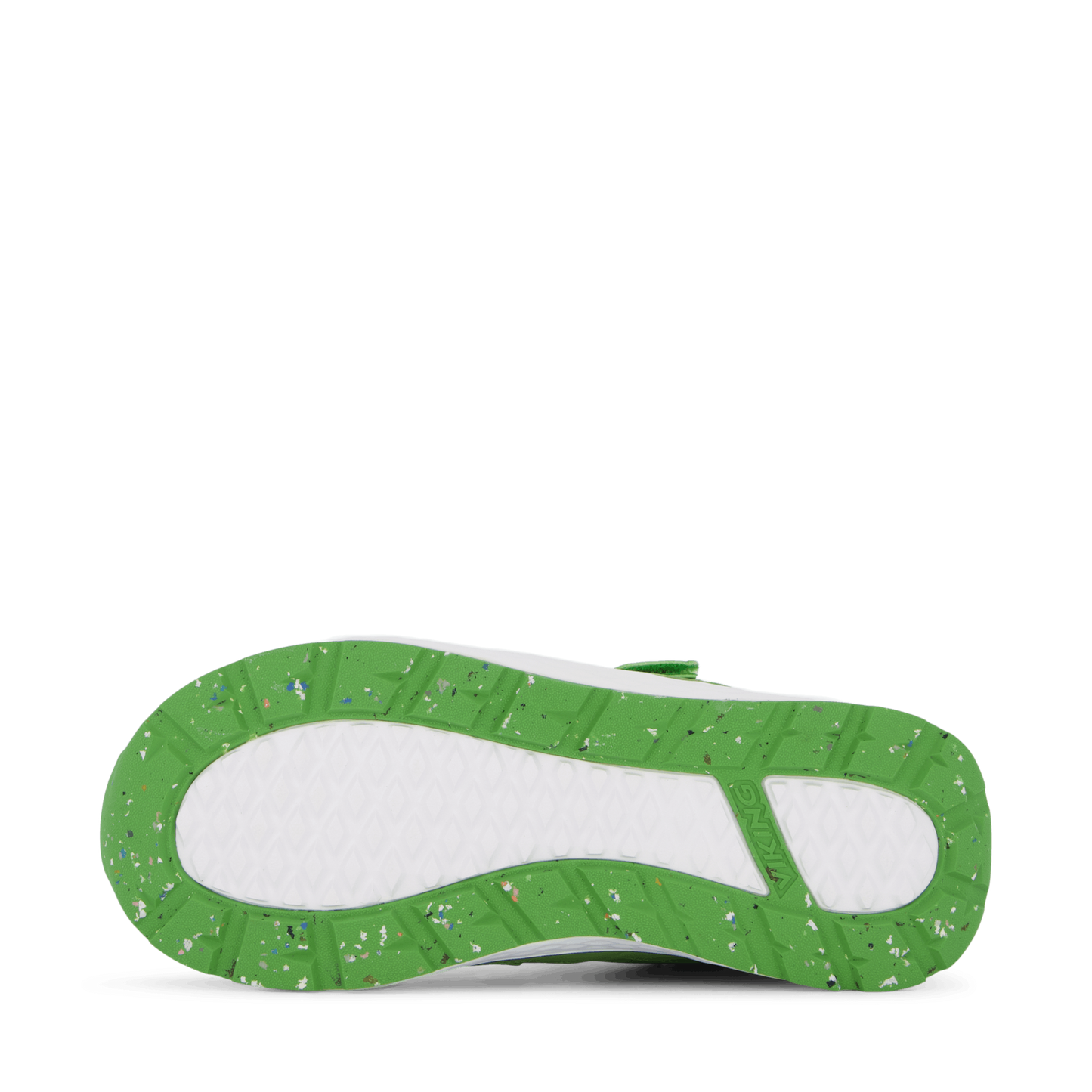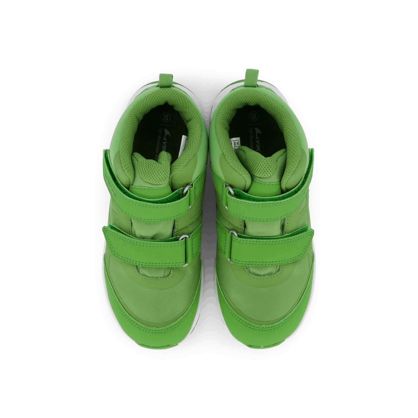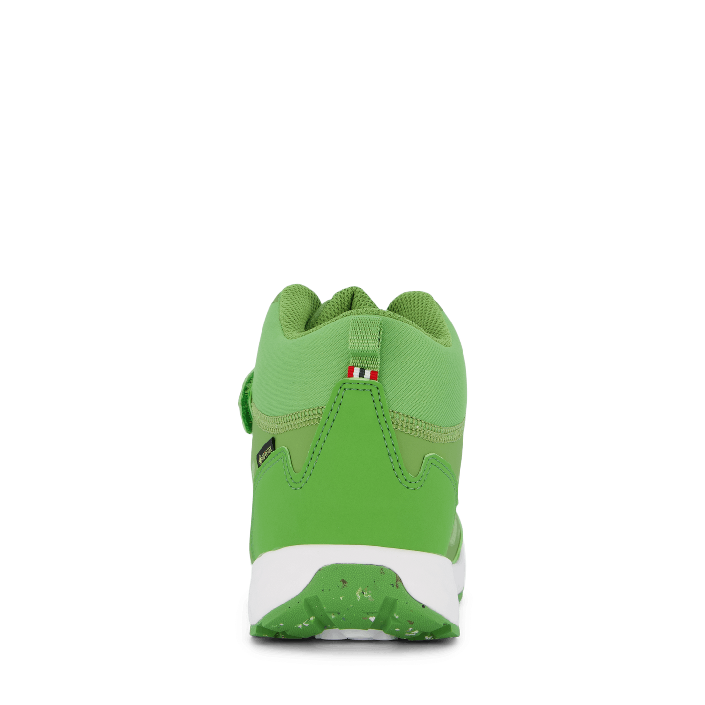 Viking's Veme Reflex Mid GTX 2V is a lightweight, sustainable children's shoe featuring a waterproof GORE-TEX membrane and reflective webbing for visibility. The olive/eggshell colorway boasts two velcro straps for easy fastening, a grippy rubber outsole with reinforced toe and heel, and a removable insole. Made with 60% recycled materials, it's washable and ideal for active kids.
