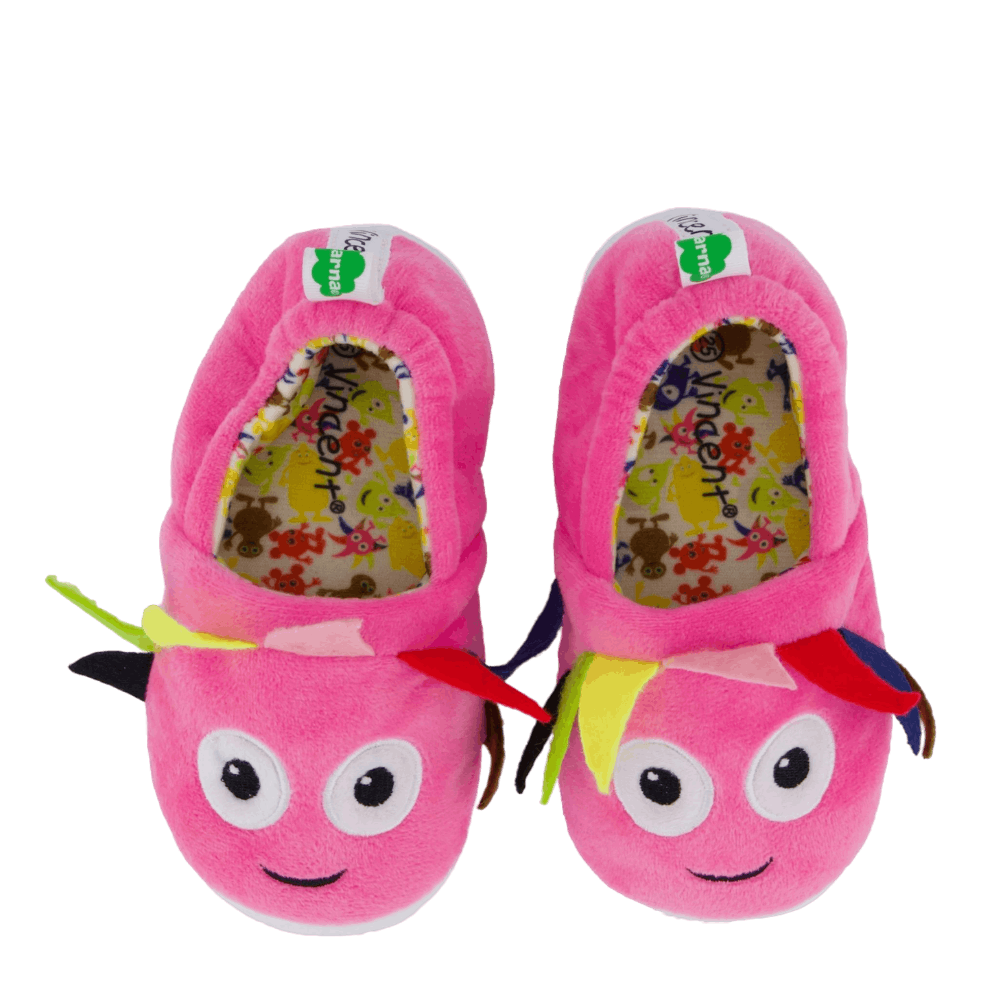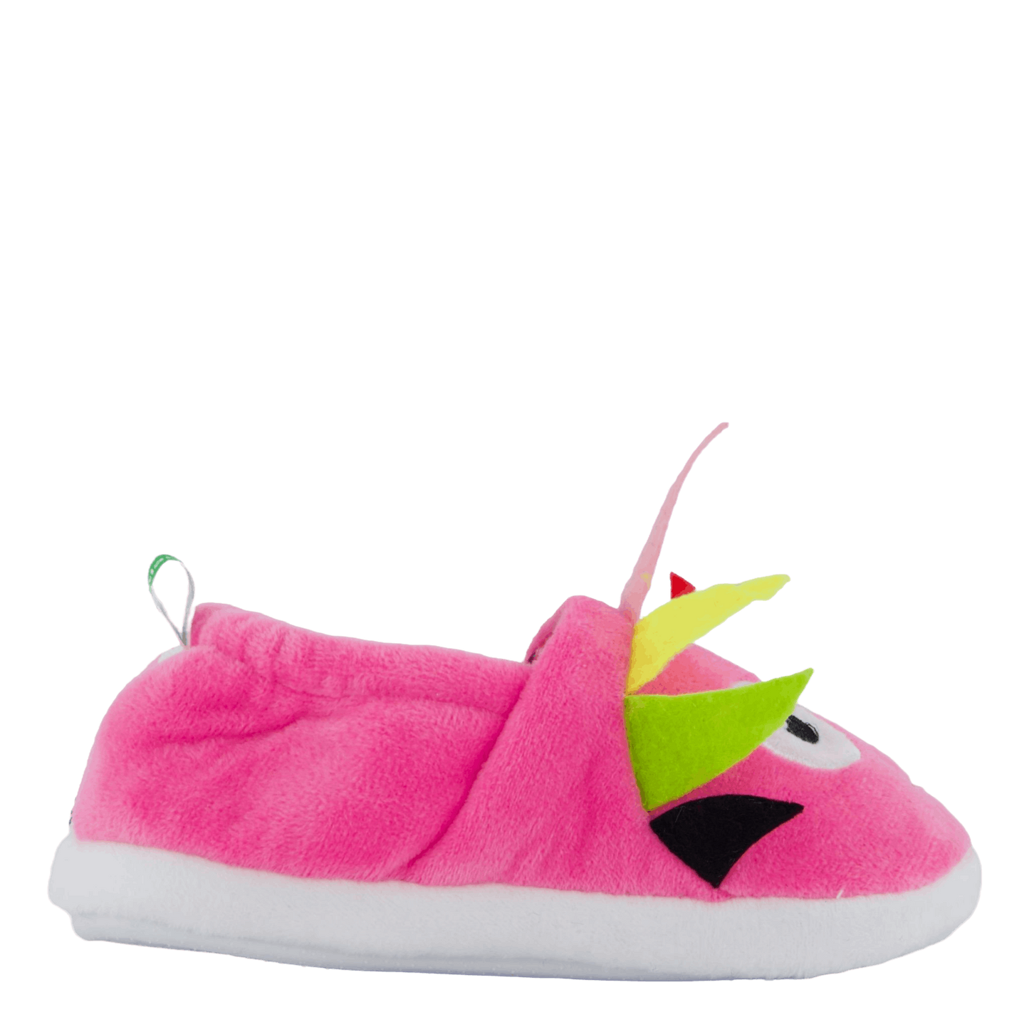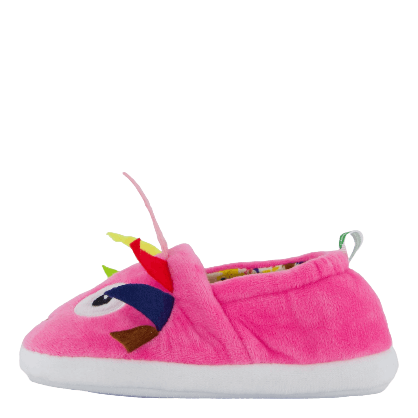Delight your little one with these charming pink slippers featuring a playful bird or tropical fish design. Made of soft, plush material, they offer comfort and whimsy. The decorative face with large blue eyes, colorful feathers, and a curved antenna adds a fun touch. These slip-on slippers with white rubber soles are perfect for cozy indoor wear.