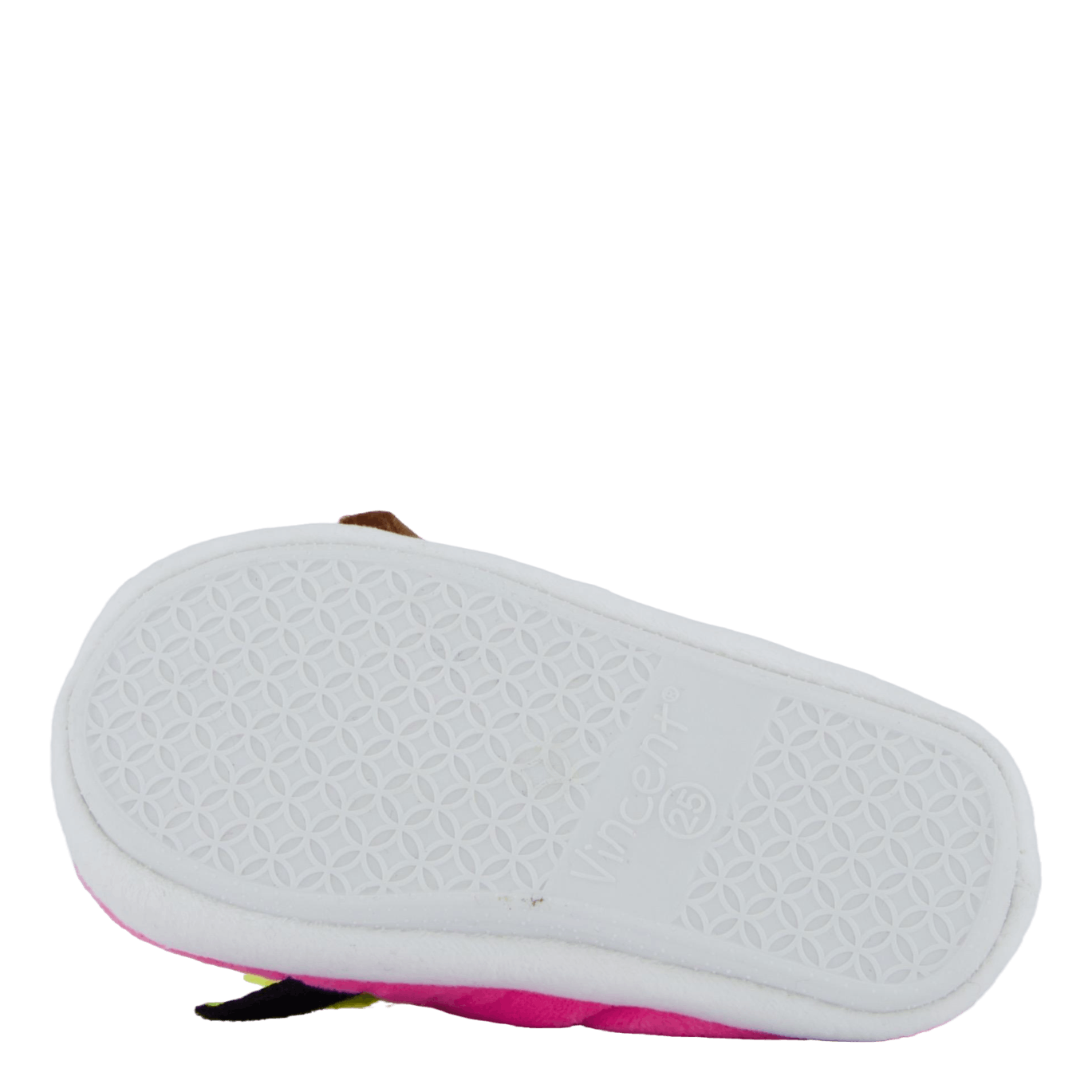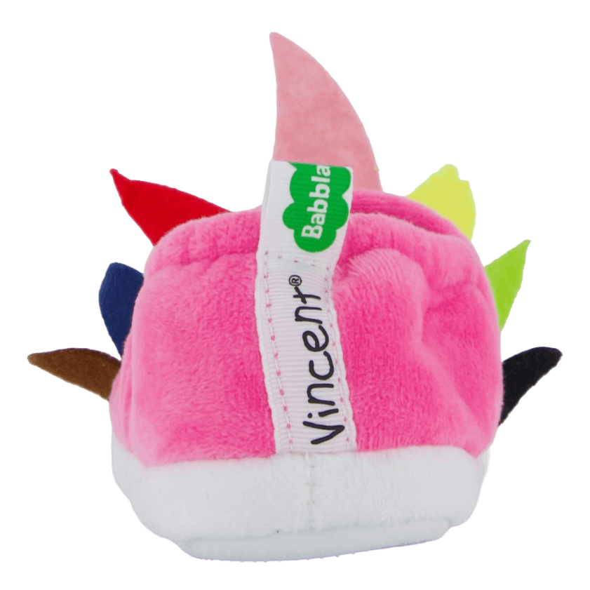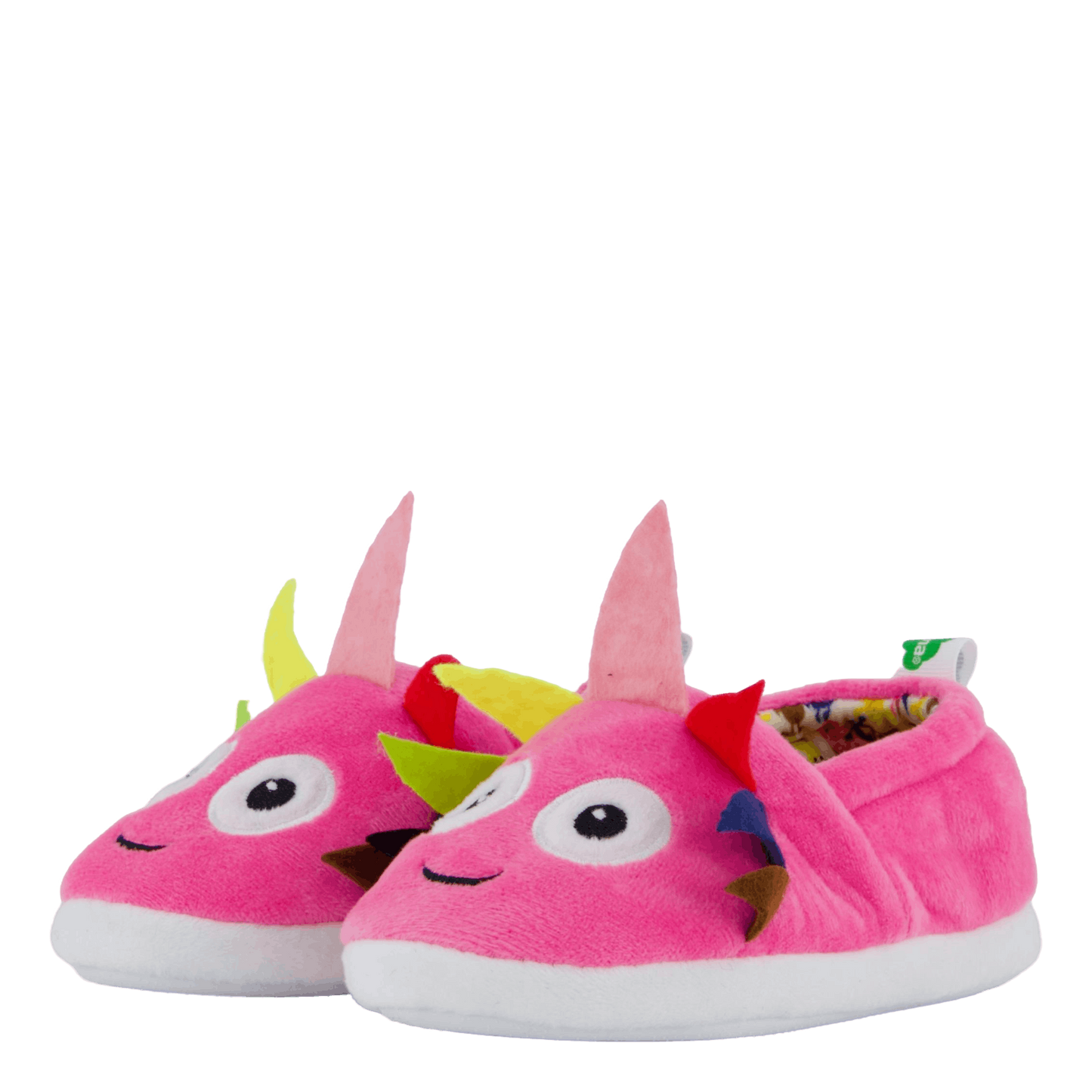 Delight your little one with these charming pink slippers featuring a playful bird or tropical fish design. Made of soft, plush material, they offer comfort and whimsy. The decorative face with large blue eyes, colorful feathers, and a curved antenna adds a fun touch. These slip-on slippers with white rubber soles are perfect for cozy indoor wear.