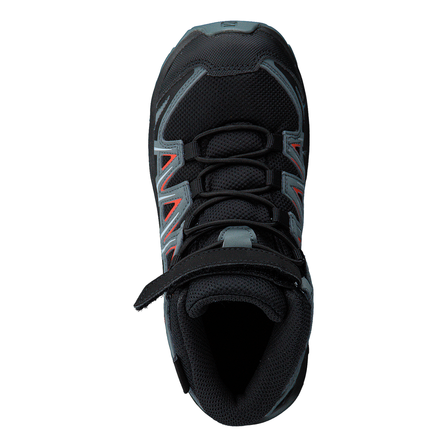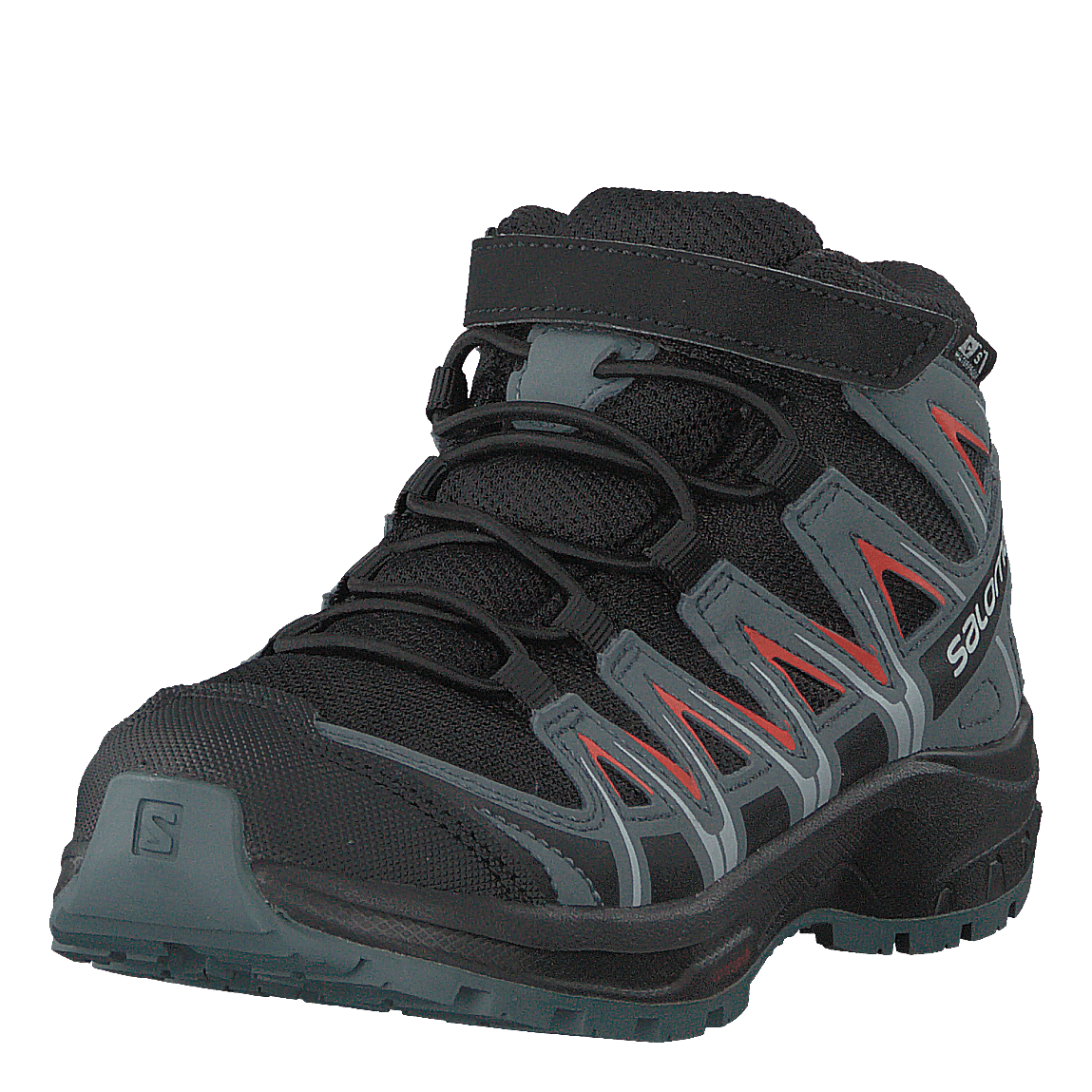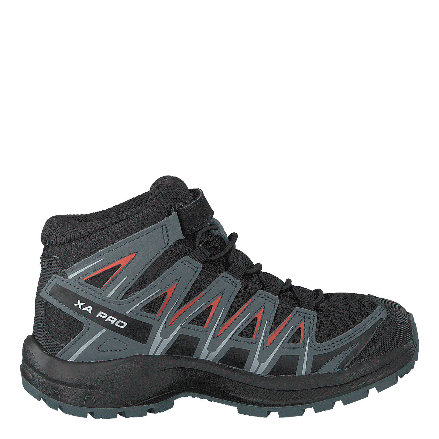 Salomon's Xa Pro 3d Mid Cswp K is a rugged children's hiking boot designed for all-terrain adventures. Featuring a black, stormy grey, and cherry red color scheme, this mid-cut boot offers superior grip, stability, and protection. With a durable mesh and synthetic upper, robust rubber sole, protective toe cap, and quick-lace system with velcro strap, it provides comfort and security for young outdoor enthusiasts.