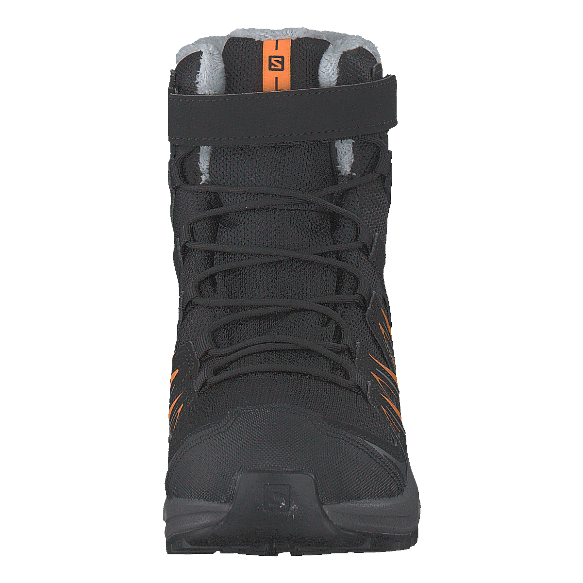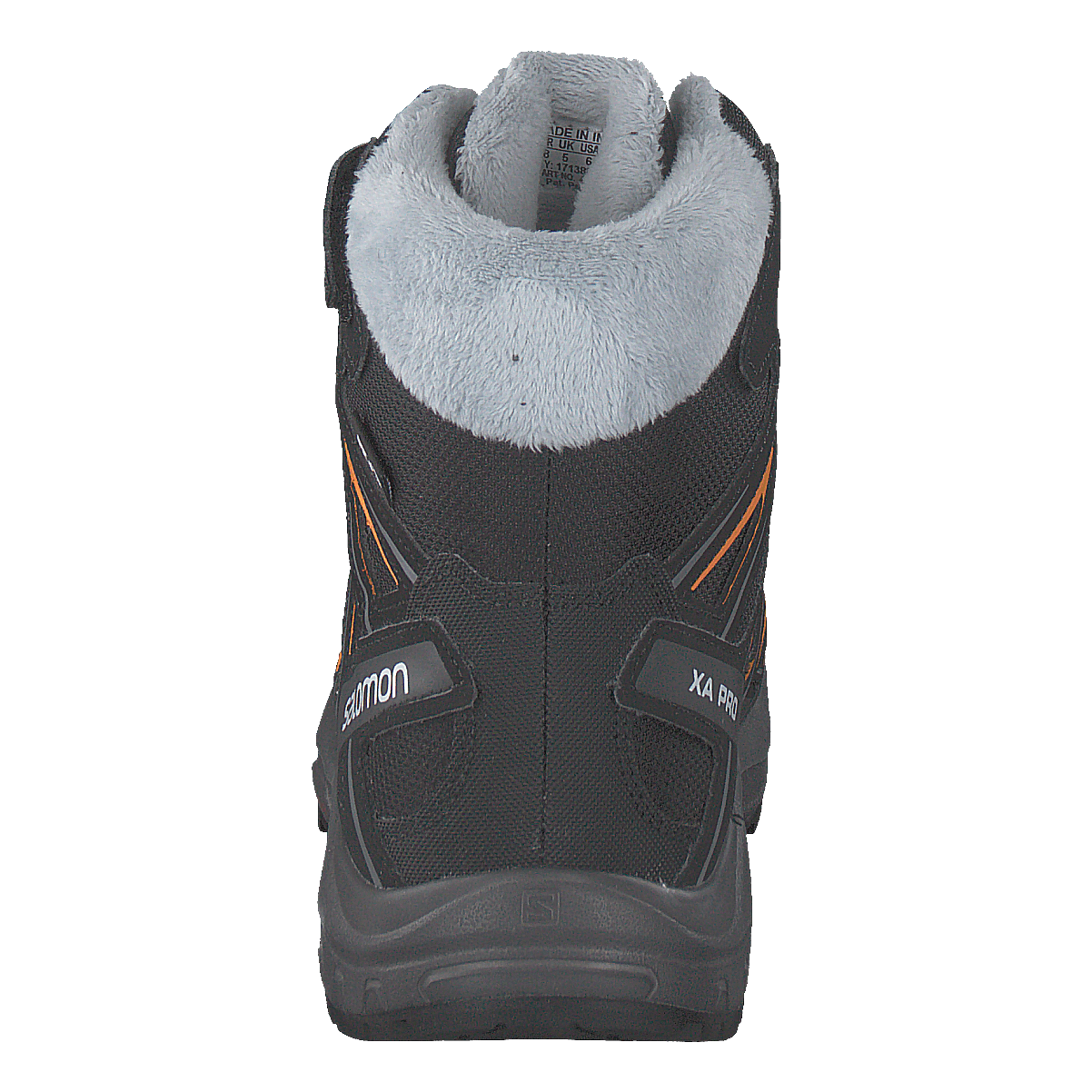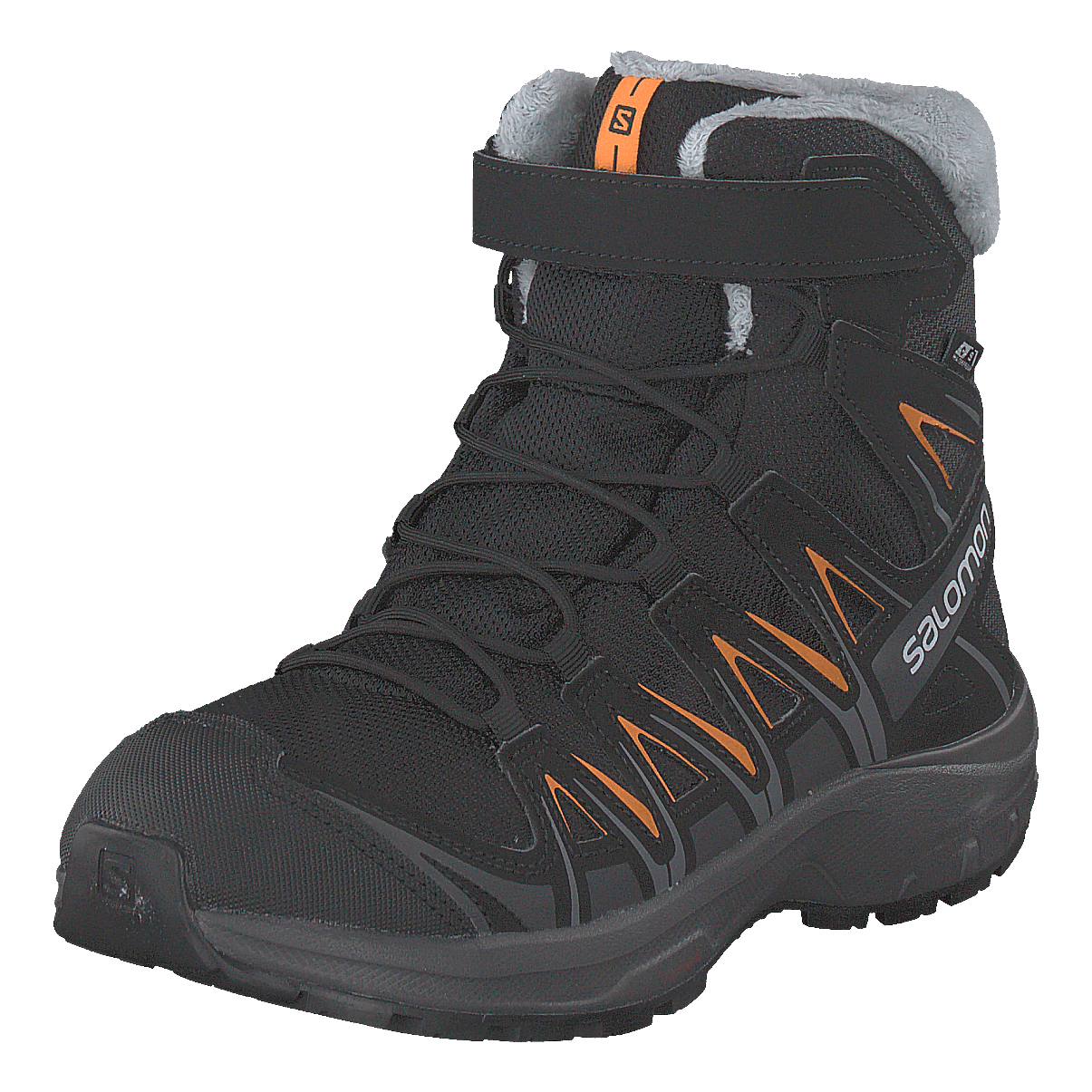 Salomon's Xa Pro 3d Winter Ts Cswp J is a high-performance children's winter boot designed for cold, wet conditions. Featuring a waterproof construction, soft fur lining, and Salomon's advanced fit and grip technology, this black, gray, and orange boot offers superior warmth and traction. With a sturdy lace-up system, velcro strap, and durable sole, it's built to withstand challenging outdoor activities while keeping young feet comfortable and protected.
